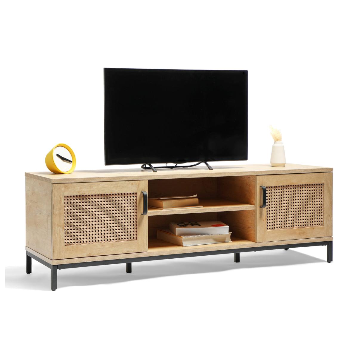 Bohemian textures, Scandi tones, and industrial accents, introduce style into your lounge with the Von Haus TV stand cabinet. Crafted from light wood effect MDF, the rattan fronted doors keep contents contained in rustic style, whilst the black metal frame and handles add a bold finishing touch. TV Cabinet with Internal & Open Storage. Lena Range for Hallway and Living Room. Keep your spare bits and bobs out of sight whilst presenting a sleek aesthetic with this TV table, marrying form and function. Concealed by two doors, the two compartments offer ample room for books, blankets, and remotes. Store media boxes and consoles on the two open shelves, ready for movie nights. Or, why not use the open shelving for decorations. Position your TV, max 60 inch, on the top surface and relax in style. Browse the Lena range today to weave that boho touch throughout your home.