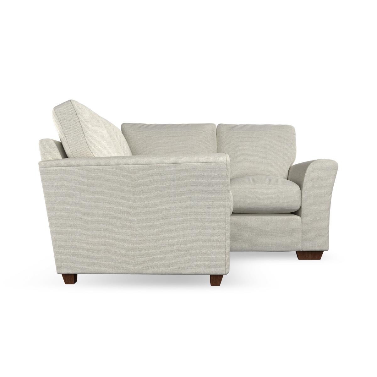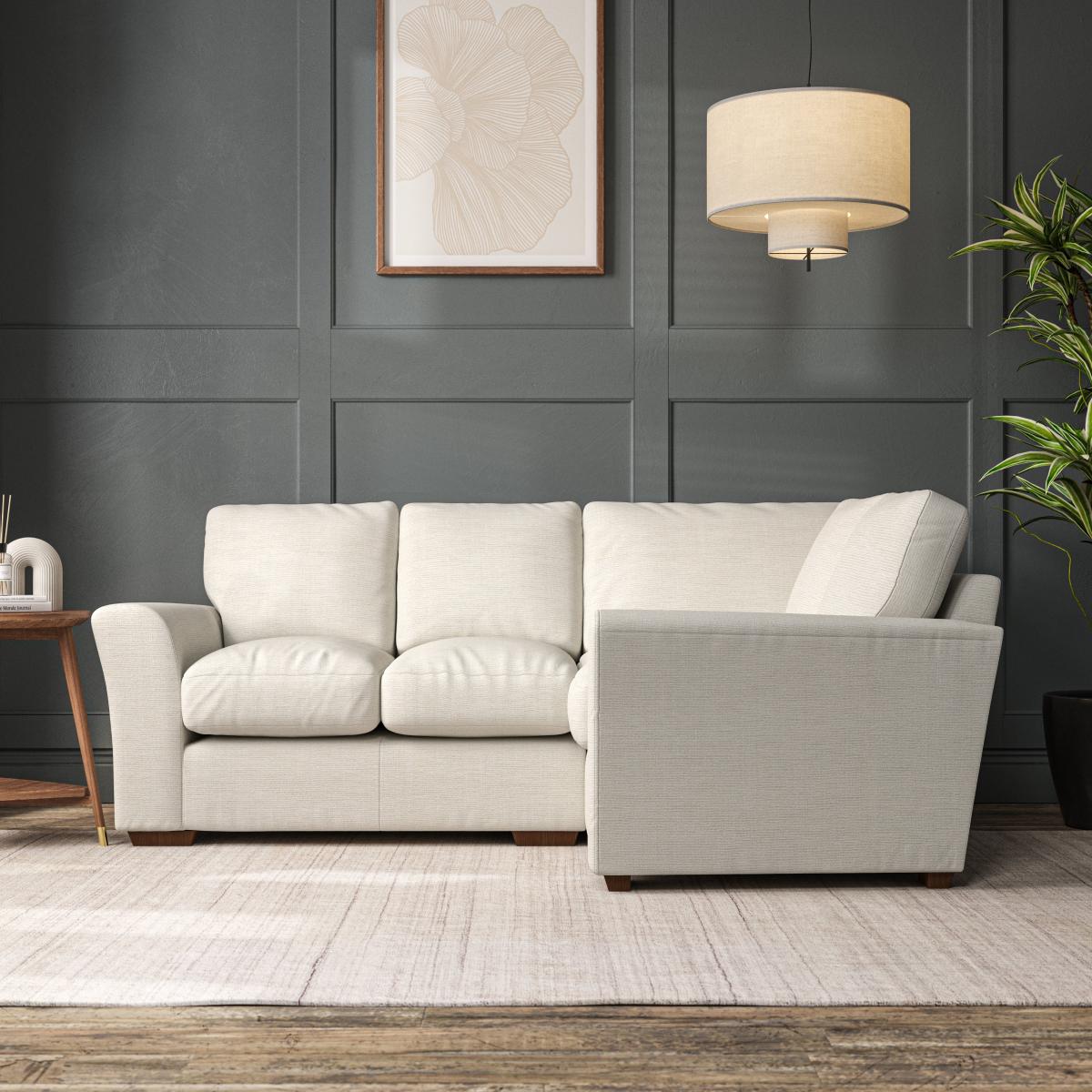 * Classical modern style * Flared arms * Stitched arm detailing * High back * Serpentine seat springs * Choose your orientation, support, fabric and leg colour This corner sofa offers a stylish solution with its understated design and elegant swept arms. Generous, fibre-filled back cushions deliver superior comfort and support. Personalise your seating with a choice of foam or eco-friendly ‘Qualofill Blue’ fibre filling. Supported by serpentine springs and solid hardwood legs available in two finishes, this corner sofa blends comfort, durability, and refined design to enhance any living area.