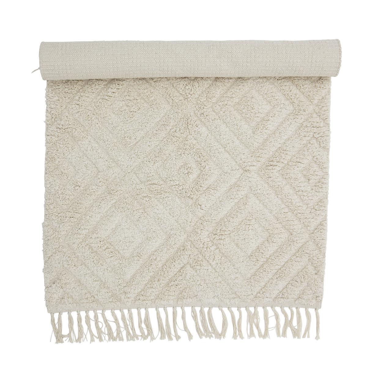 100% cotton, this rug boasts a magnificent tufted and embossed geometric pattern. Available in a stunning ecru colourway, a natural tone, it adds a warming note to your decoration. With its soft texture, this rug will have you wanting to be barefoot all day! Perfect in front of your bed, or in the bathroom, creating soft, warming sensations.
