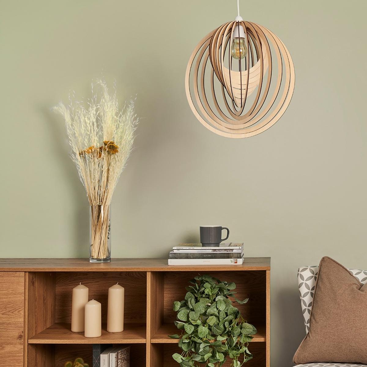 I love this pendant shade for its modern yet versatile design, making it a great statement piece in both contemporary and transitional interiors. Its warm brown tone adds a cosy touch, and the layered wooden construction offers a natural texture that works well with neutral palettes or earthy colour schemes. It’s especially effective in open-plan spaces, over dining tables or kitchen islands, where it can serve as a visual anchor. For styling, consider pairing it with filament bulbs for an industrial vibe or complementing it with other wooden accents to create a cohesive look. Its adaptable size and eco-friendly material make it an easy choice for adding warmth and style without overwhelming the space.