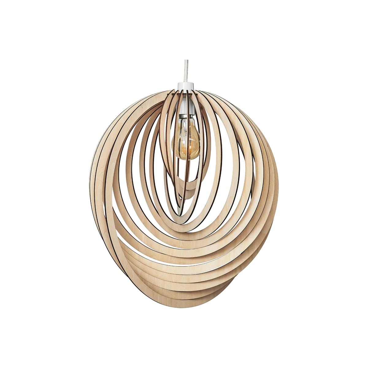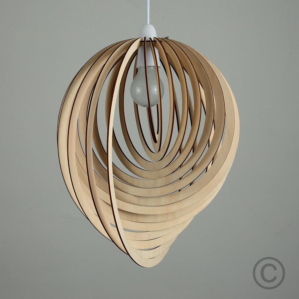 Modern wooden slot together spiral droplet shaped ceiling pendant light shade. This contemporary shade is a quick and easy way to update any living space. This spiraled wooden pendant shade disperses light throughout the room room to create a lovely warm atmosphere. The graduating circles create a beautiful 3D spiral design. Simply fit this shade to an existing ceiling light socket - no electrical installation required!