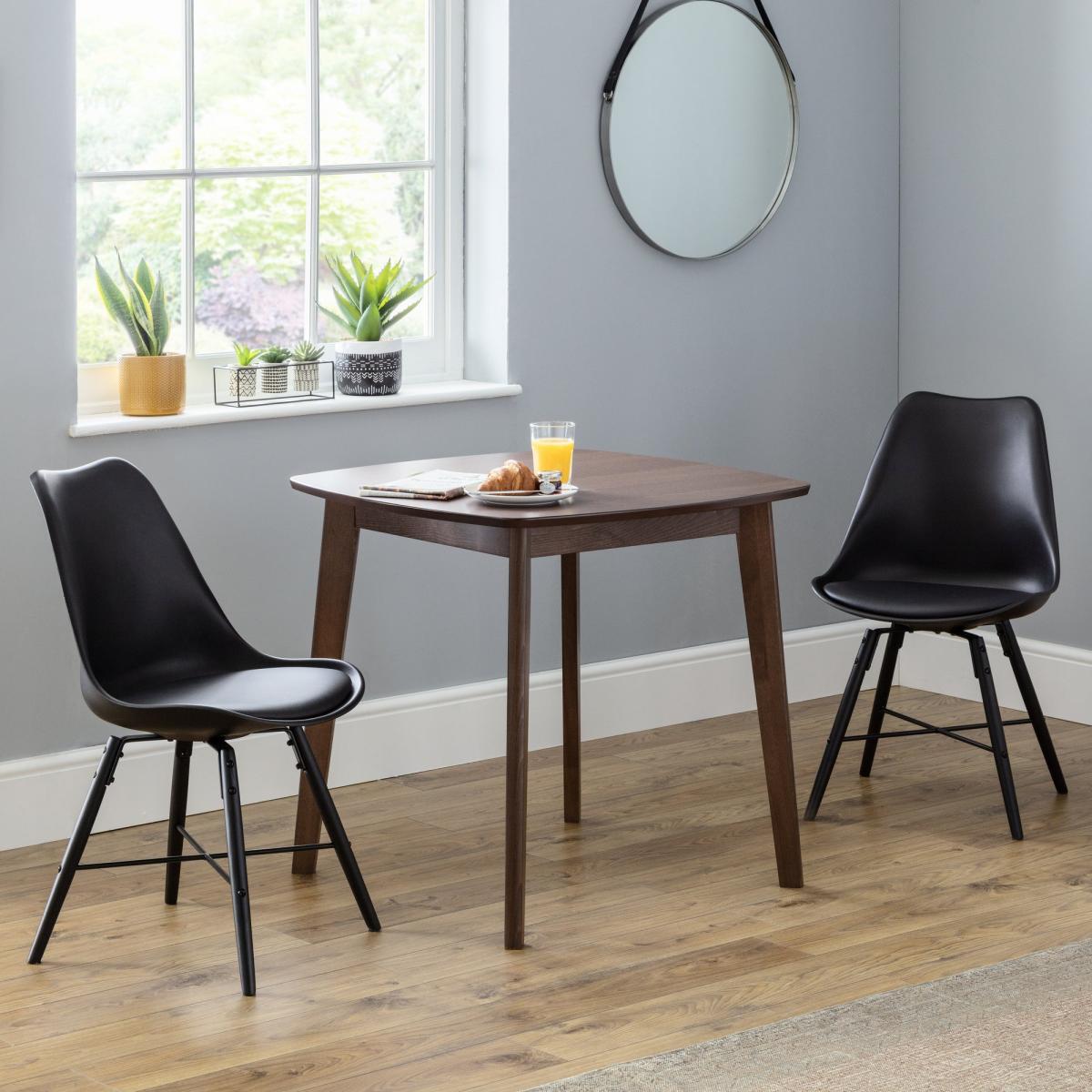 I love this combo because it offers a great balance between style and practicality. The table's clean lines and warm wood tone make it versatile, fitting well in both modern and more traditional interiors. The Kari black chairs with brown finish add a contemporary edge, creating a welcoming yet sleek look. This set works particularly well in compact dining spaces or kitchens, where it maximises functionality without feeling cluttered. For styling tips, consider adding a colourful or patterned runner to inject personality, and complement the space with some greenery or stylish tableware to enhance that cosy, inviting atmosphere.