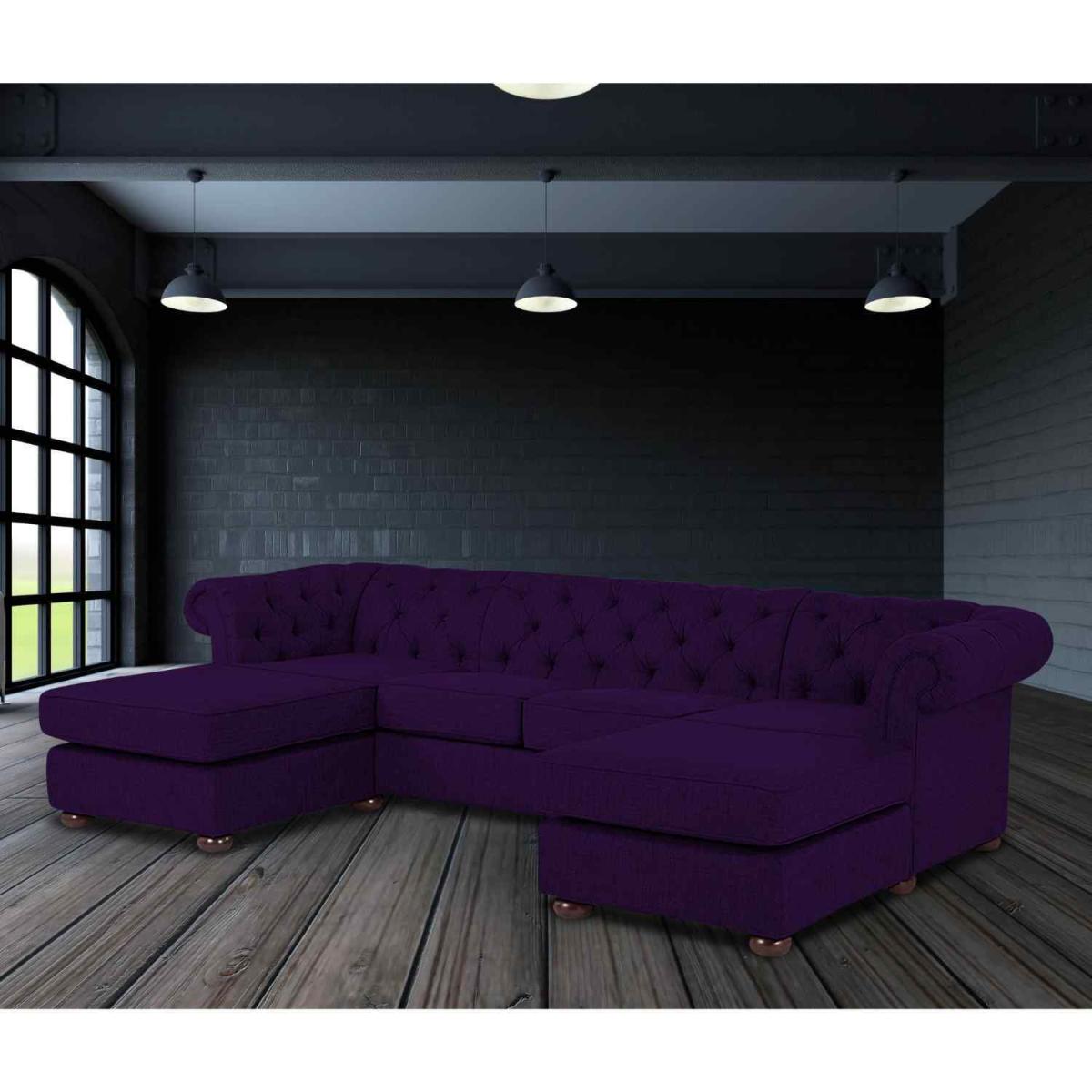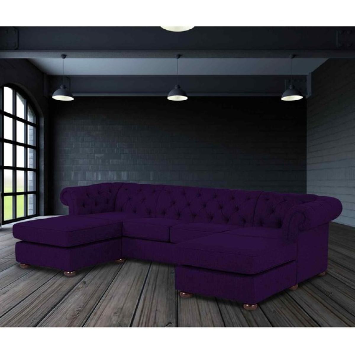 Lenoso Chesterfield U Shape Sofa with 2 Footstools in Plush Velvet Fabric - Purple
