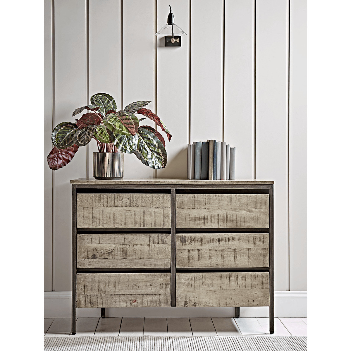 With a bold design, and hard wearing materials, our statement chest of drawers strikes a contemporary tone. A metal frame displays the grey toned wood beautifully - with each unique mark and striation, to bring a real design detail to the piece. Featuring six deep drawers, our Lenox Chest of Drawers is a versatile piece for any space, one that might function as a clothes store in a bedroom, or equally as a console in your living space.