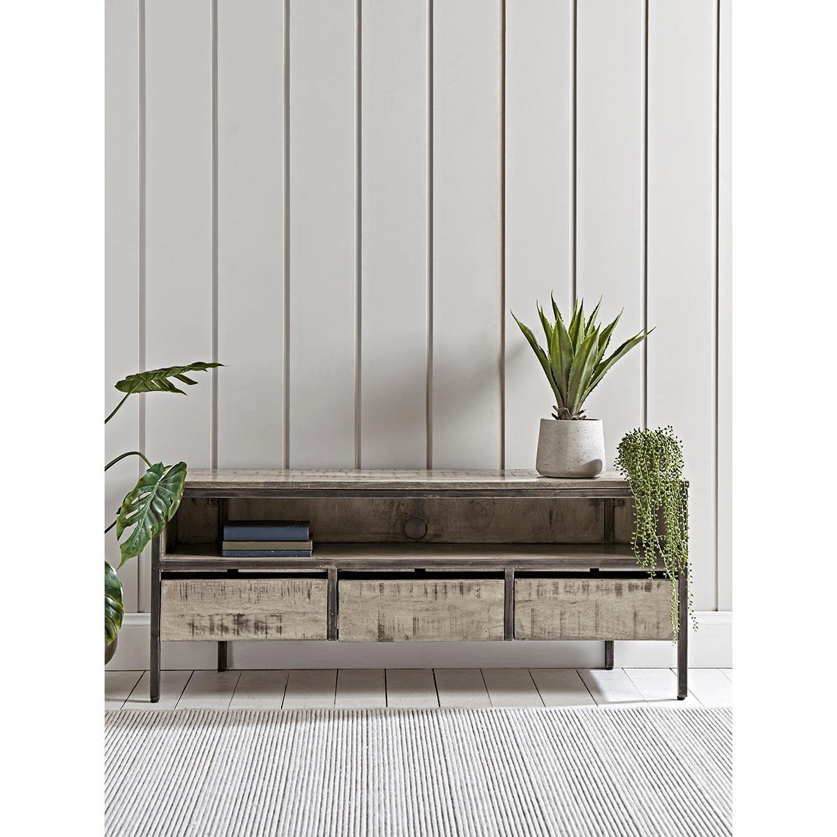 With a bold and simple design, one employing hard wearing materials for statement, our Lenox Media Unit strikes a contemporary tone. A metal frame displays the grey toned wood beautifully - with each unique mark and striation, to bring a real design detail to the piece. Featuring three handy drawers, and ample space for your media, our unit is a versatile piece for modern living, one to house those home accessories in style.