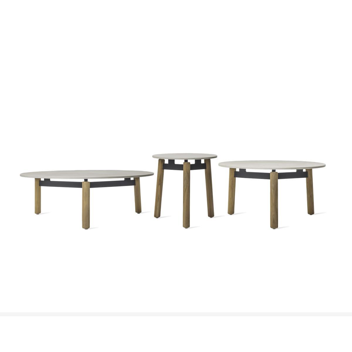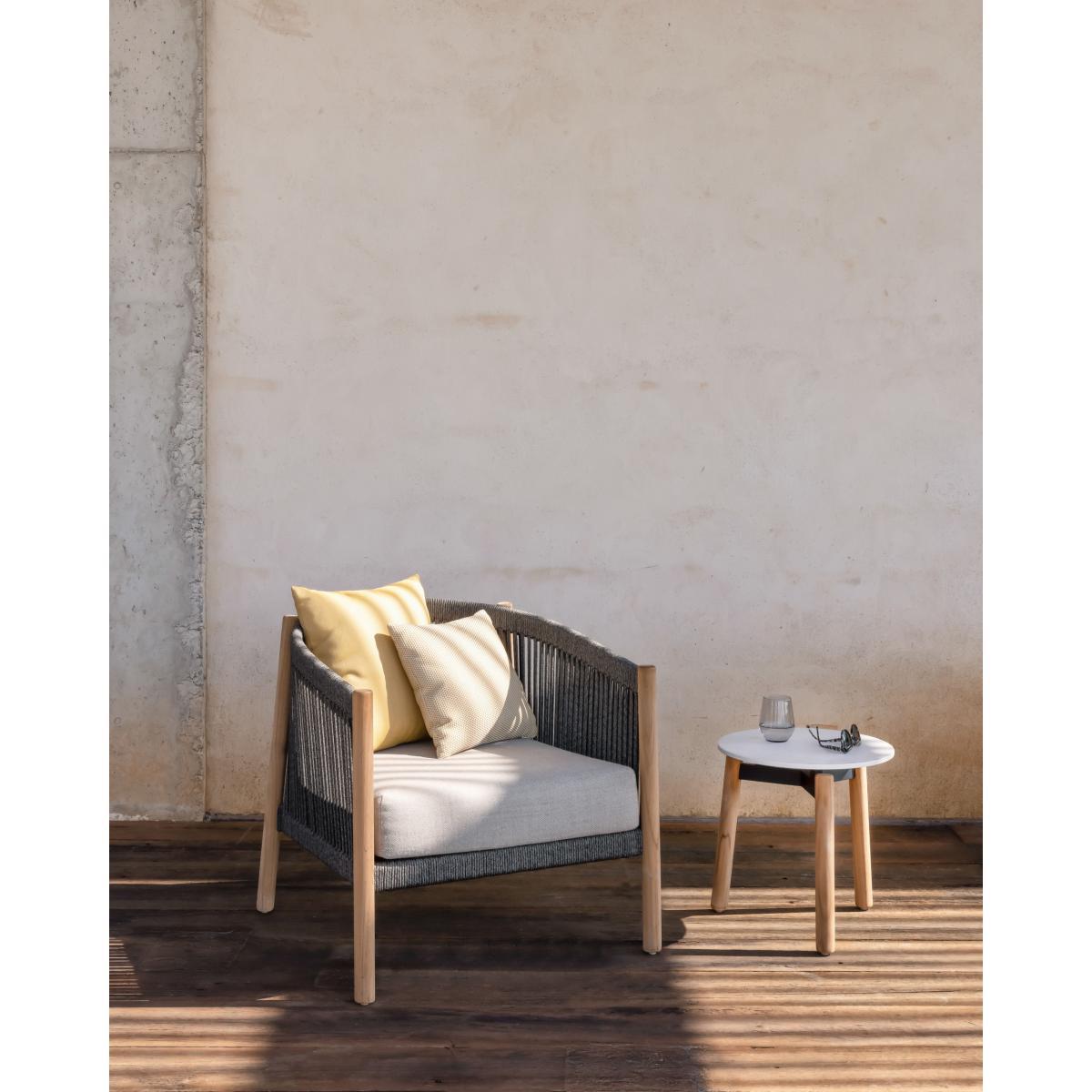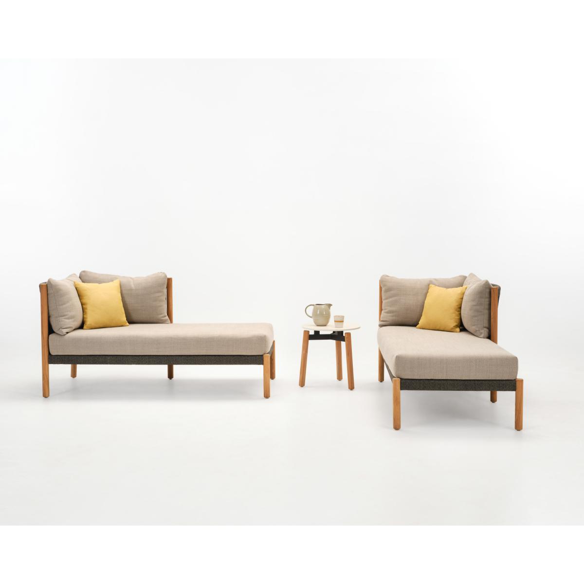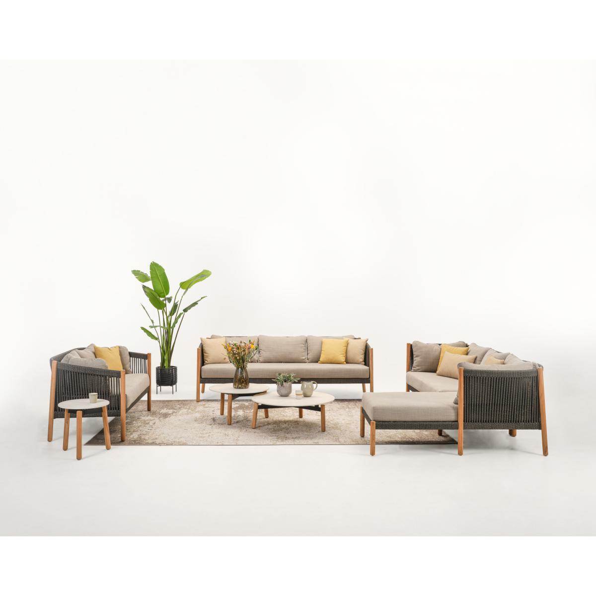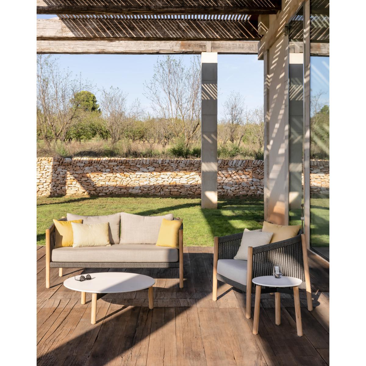 Ceramic and non-treated teak are combined here to create the stunning Lento coffee tables. The pale ceramic is inspired by Venetian terrazzo tiling, creating an impression of space whilst also adding character to your garden. Designed by Belgian designer Bertrand Lejoly, the "Lento" collection (which means "slow" in Italian), is the embodiment of la dolce vita: taking your time, chilling out, enjoying the fresh air. Creating a relaxed and zen atmosphere, this eye-catching outdoor furniture stands out with its combination of warm, natural teak, tactile cords, and comfortable cushions, allied in low-lying designs. The solid teak legs and the backrests made with woven cord grant this collection a rich and endearing quality. The charcoal cord and the warmth of the heat are perfectly brought together through the ceramic tables and their pale tones. Robust and durable, this coffee table is perfectly weather- and UV-resistant. The David coffee table highlights resistant materials, attention to detail, and expertise. Care: this outdoor coffee table is easy to care for. The ceramic is highly resistant and does not require any care or maintenance. Left outdoors, the surface is naturally cleaned by rainfall. It simply needs occasional washing with water and mild soap. The raw teak (untreated) selected is of an exceptional quality, with its thickness superior to market standards, as well as its natural resistance to bad weather. The teak (not oiled) develops a natural patina over time: it therefore offers shades of browns and greys for a gentle and very modern appeal. You can also lightly sand it at the start of each season to restore the original colouring. If you want to keep its natural shade, we recommend you treat it with oil.