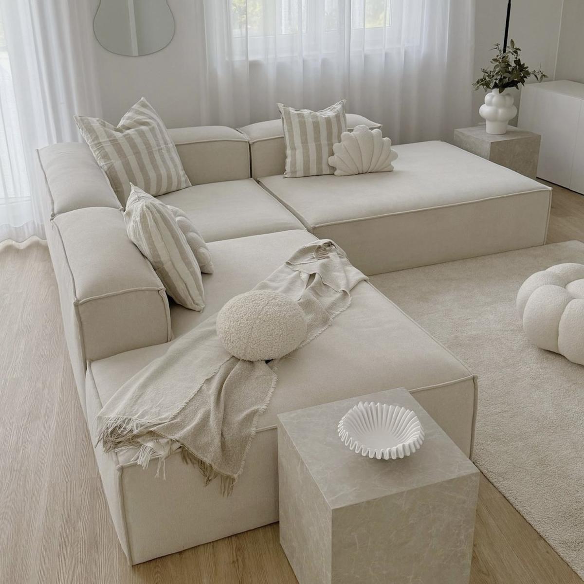 I love this corner sofa for its clean, neutral palette, making it a versatile piece that works well in both contemporary and minimalist interiors. Its modular design offers flexibility, perfect for tailoring the layout to suit different room sizes and lifestyles. To style it effectively, consider layering with textured cushions and throws to add warmth and visual interest without overwhelming the neutral tone. This sofa pairs beautifully with light wood or marble surfaces for a fresh look but can also be softened with plush rugs and natural fibres. Practical tip: keep accessories minimal and let the sofa be the canvas; adding plants or artwork can bring colour and personality into the space.