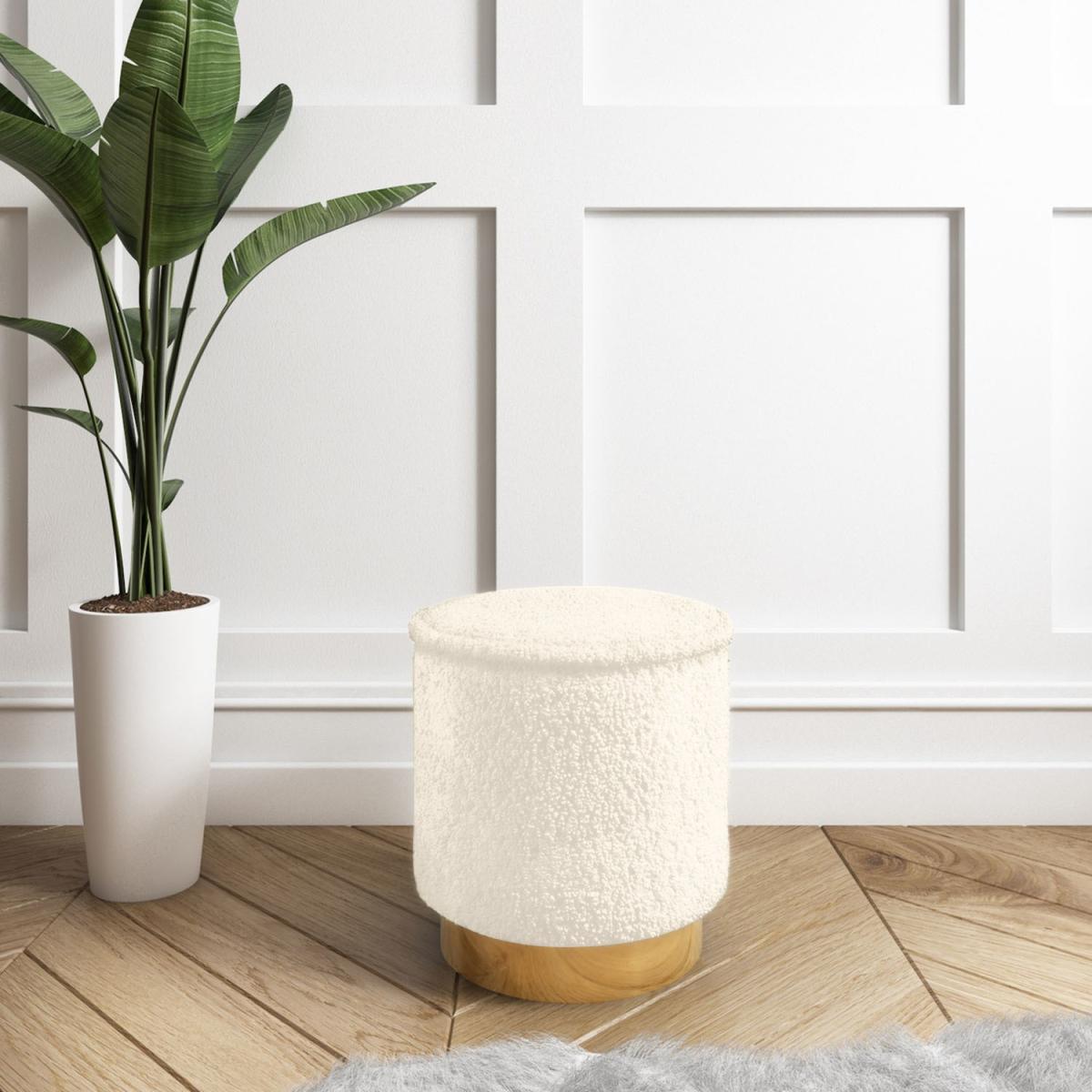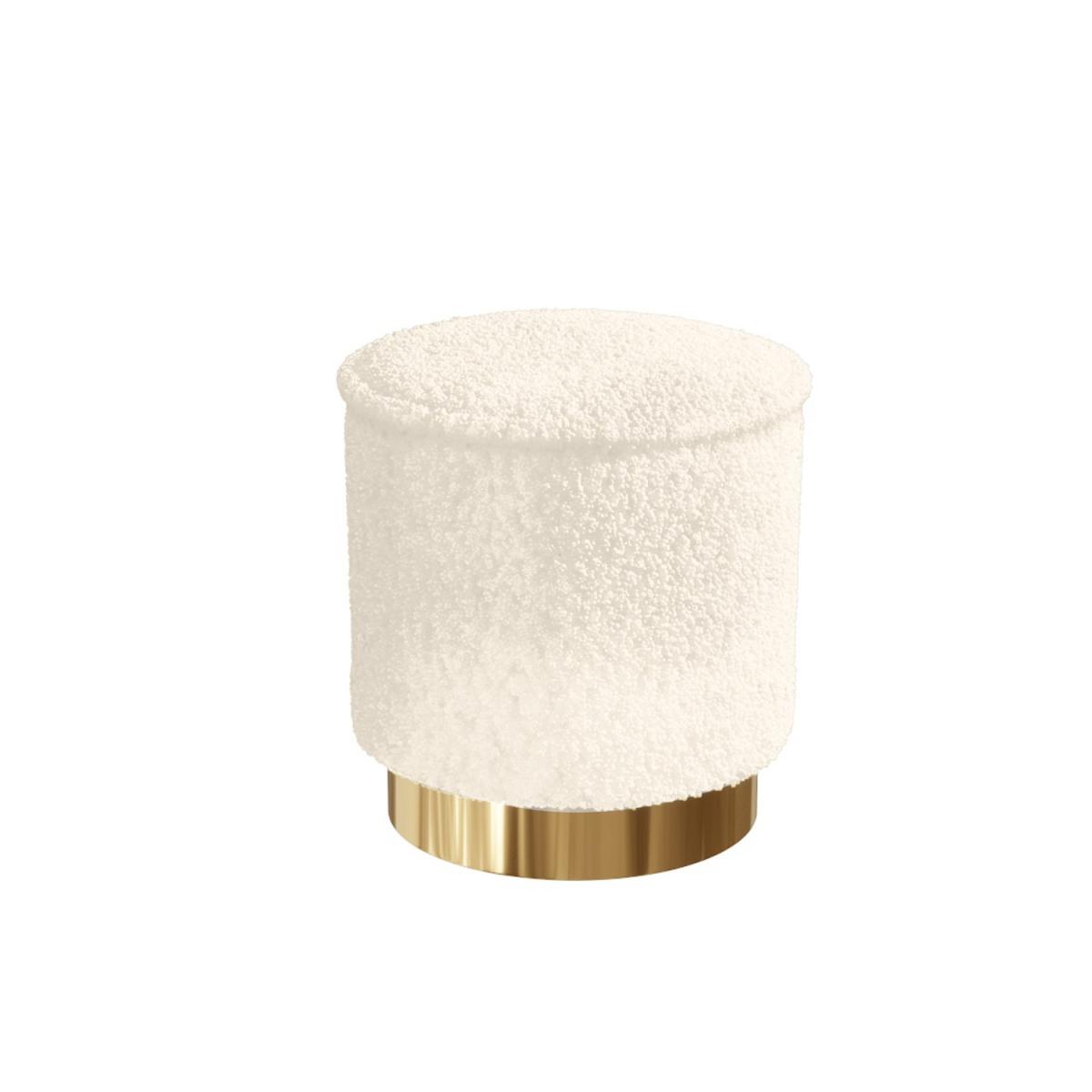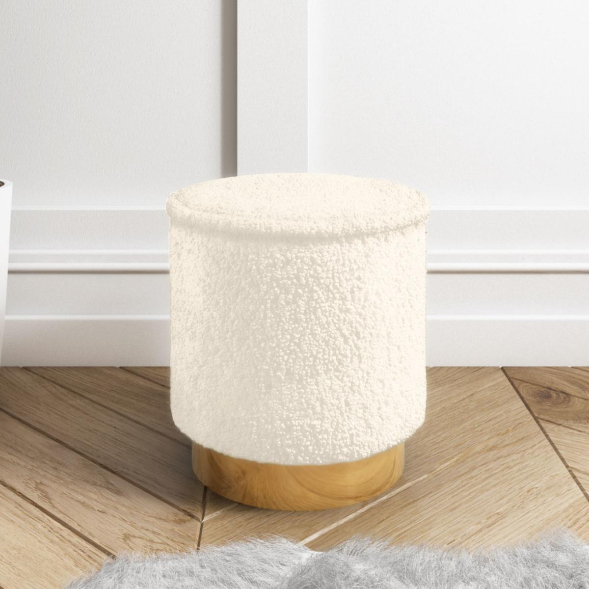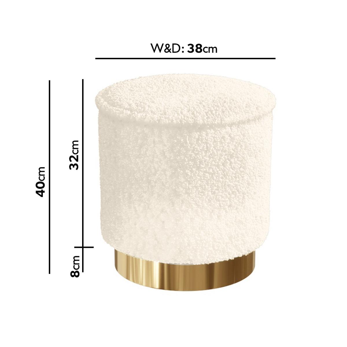 A stand out, on-trend and comfortable stool Could be placed in your room or under a dressing table Upholstered super-soft teddy fabric Stable gold metal base, stylish and functional Matching items available in the Leo range of furniture Need to know Colour: Cream Finish: Faux sheepskin upholstery and gold painted Material: Solid wood combination frame, fabric and metal For use: Indoors Max weight capacity: 100kg Weight: 7.8kg Assembly required: No