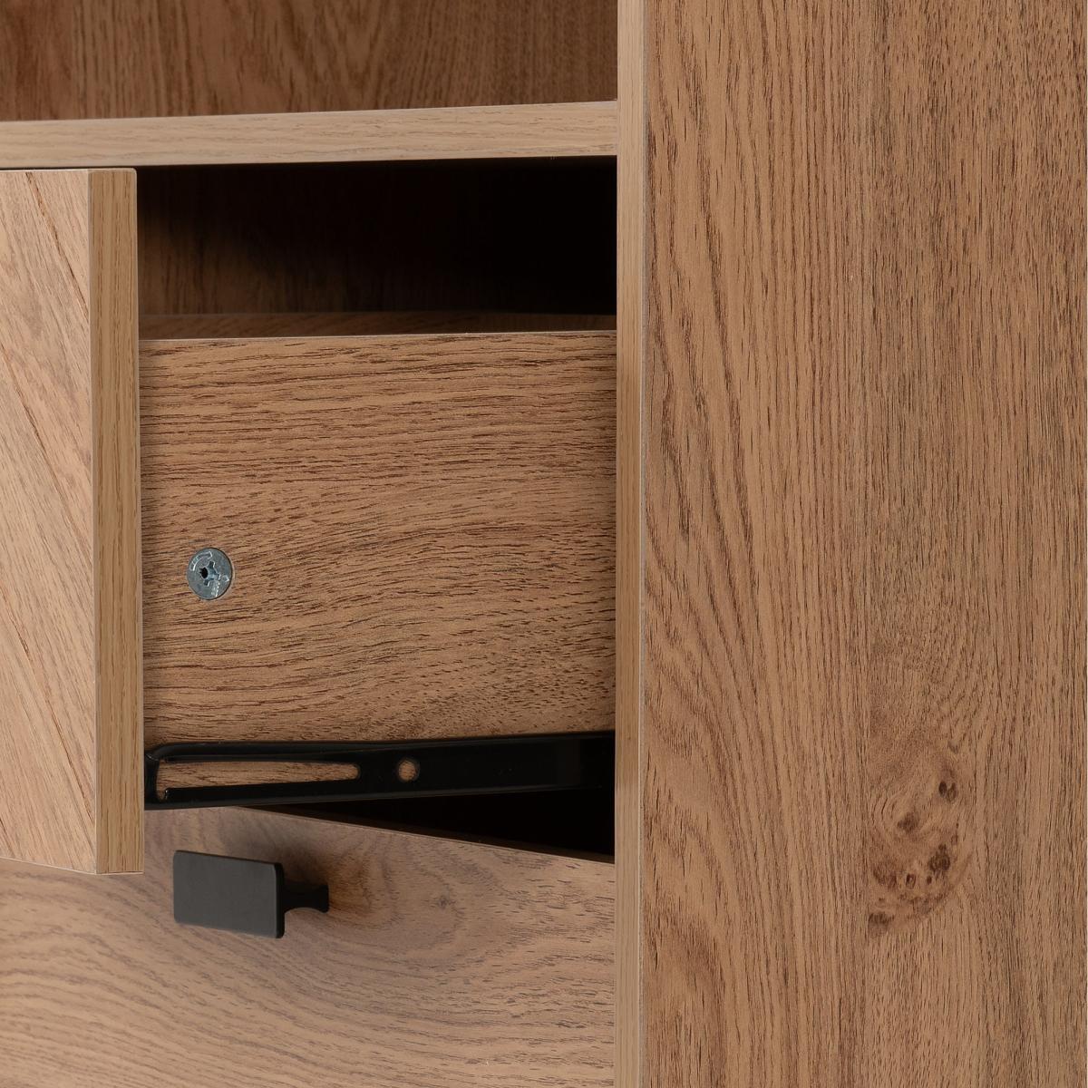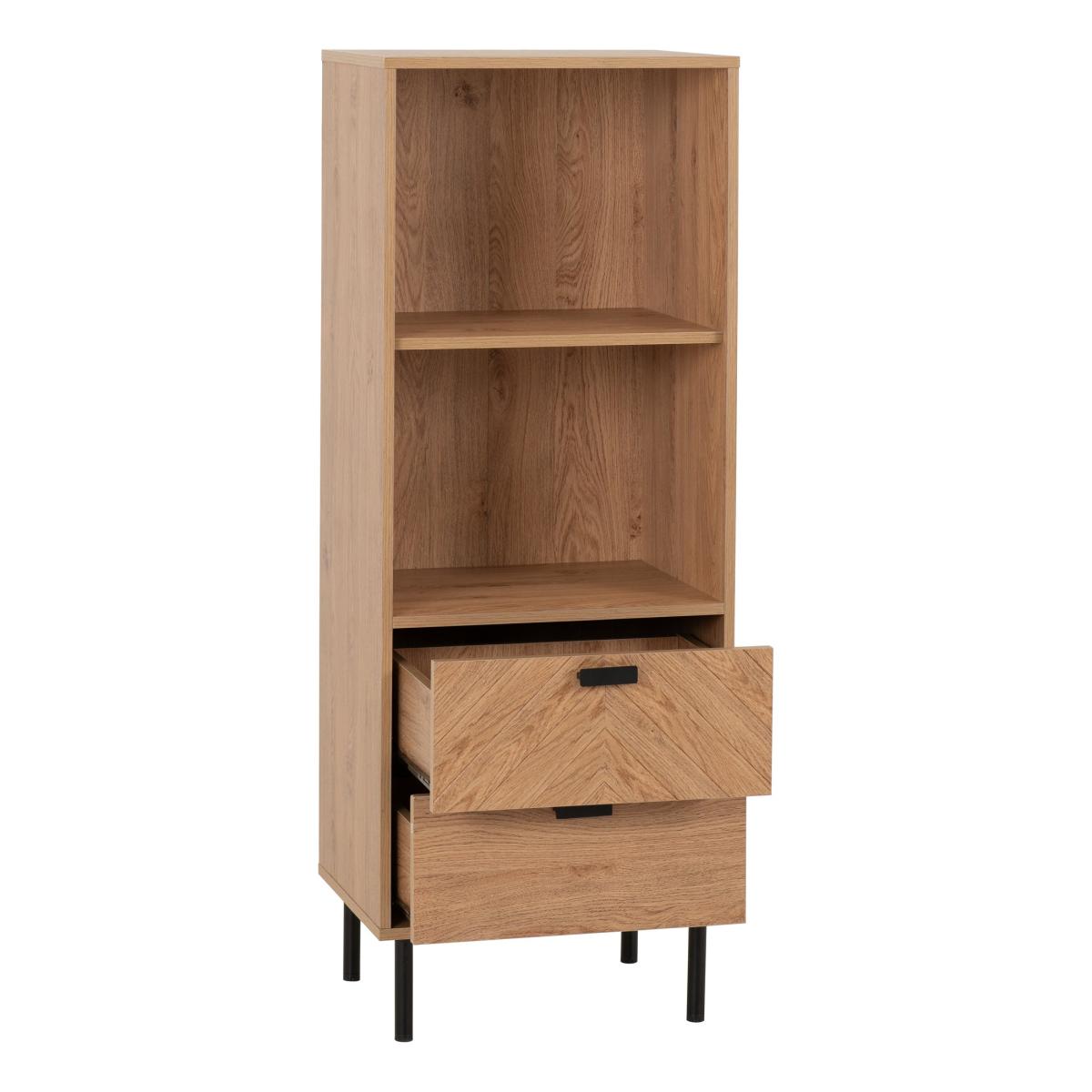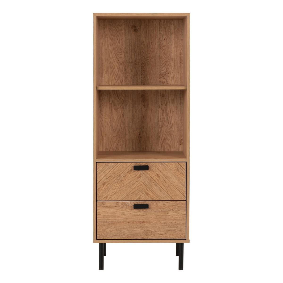 * Medium Oak Effect* Wood Grain Finish* Sleek Metal hardware This cabinet boasts a medium oak effect with a captivating wood grain finish. Its sleek design, paired with striking black metal hardware, brings a touch of contemporary elegance to any room. This flat-pack gem ensures effortless assembly, providing two spacious drawers and two open shelves for seamless organisation while maintaining a modern, sophisticated look.