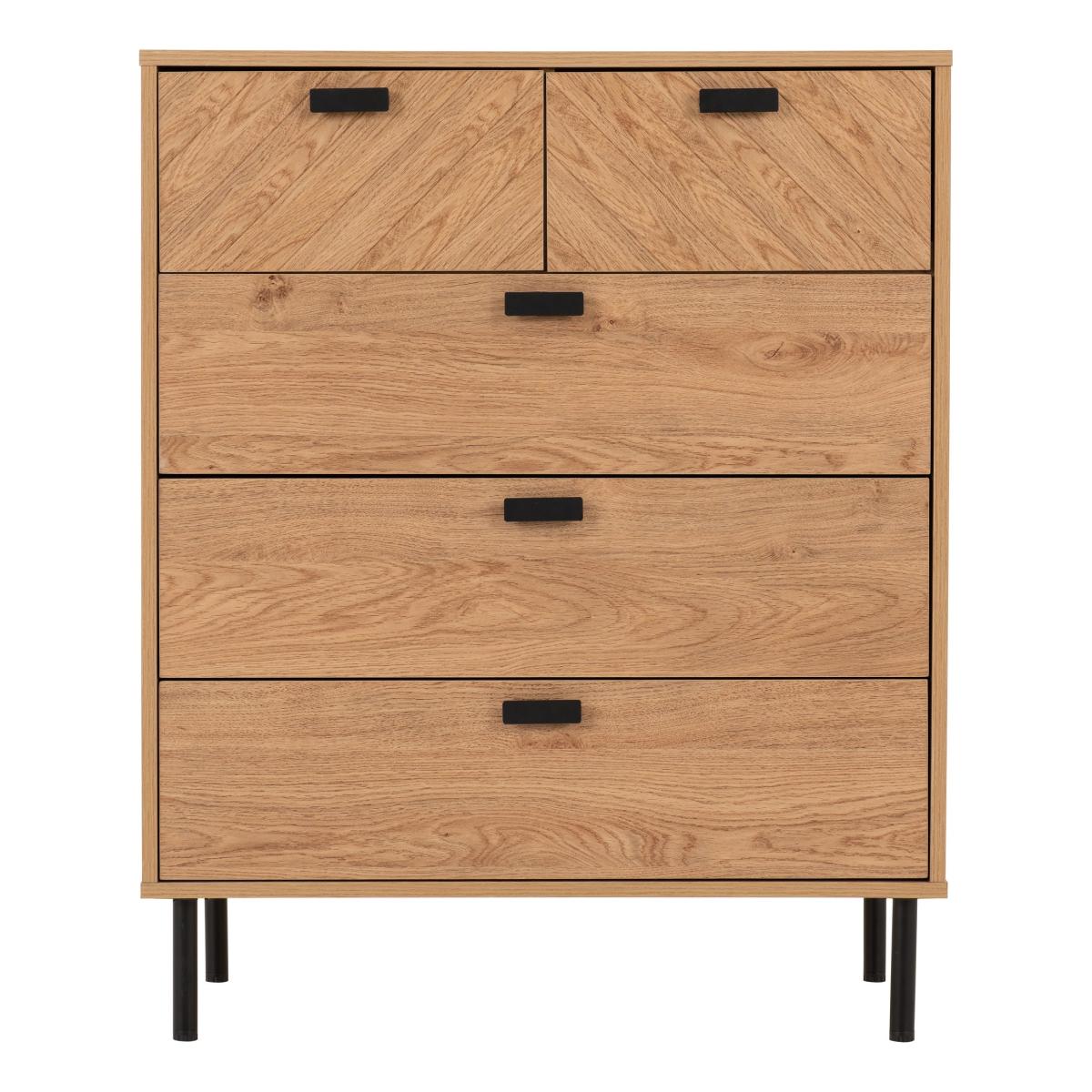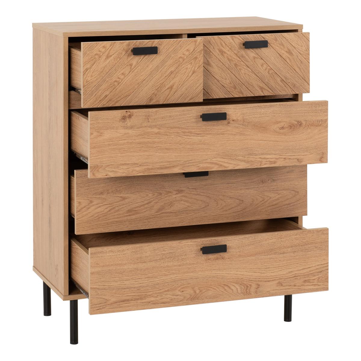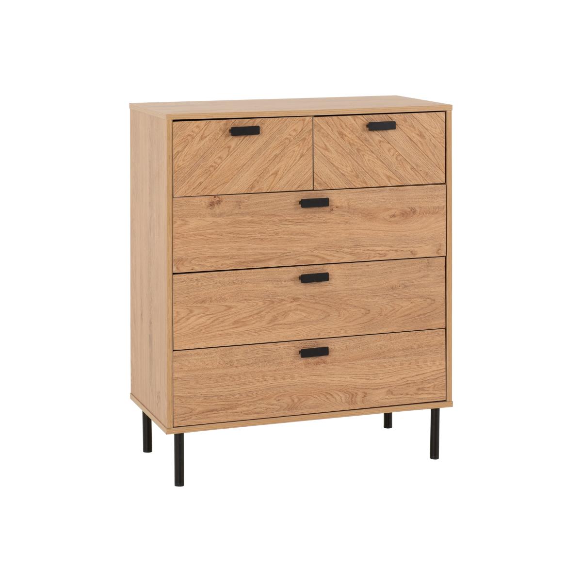* Medium oak finish* Sleek black metal hardware* 5 spacious drawers This elegant piece is crafted with a medium oak effect and a charming wood grain finish, bringing a touch of natural beauty to any room. The chest features five spacious drawers, each adorned with sleek black metal hardware, offering ample storage space for clothing, accessories, or household items. Its tall, slim design ensures it fits perfectly into smaller spaces while still providing substantial storage capacity.