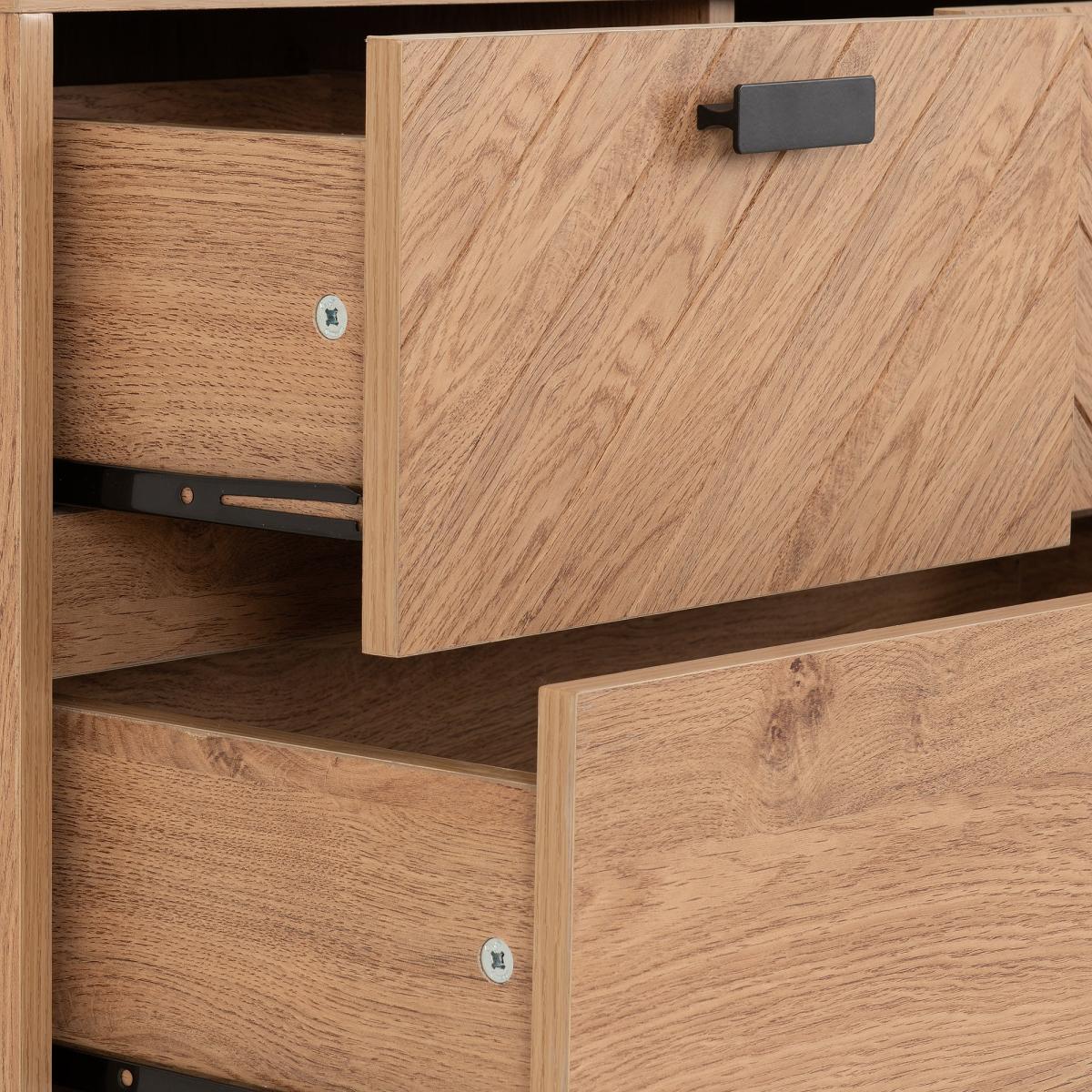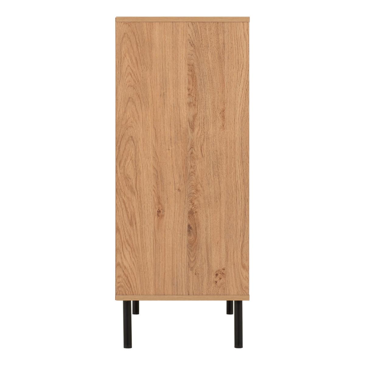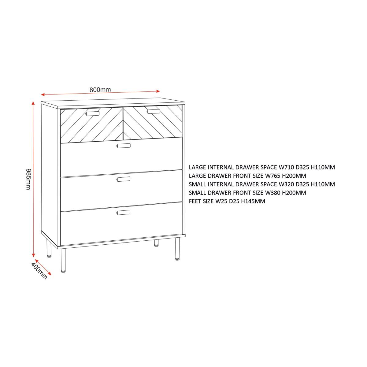 * Medium oak finish* Sleek black metal hardware* 5 spacious drawers This elegant piece is crafted with a medium oak effect and a charming wood grain finish, bringing a touch of natural beauty to any room. The chest features five spacious drawers, each adorned with sleek black metal hardware, offering ample storage space for clothing, accessories, or household items. Its tall, slim design ensures it fits perfectly into smaller spaces while still providing substantial storage capacity.
