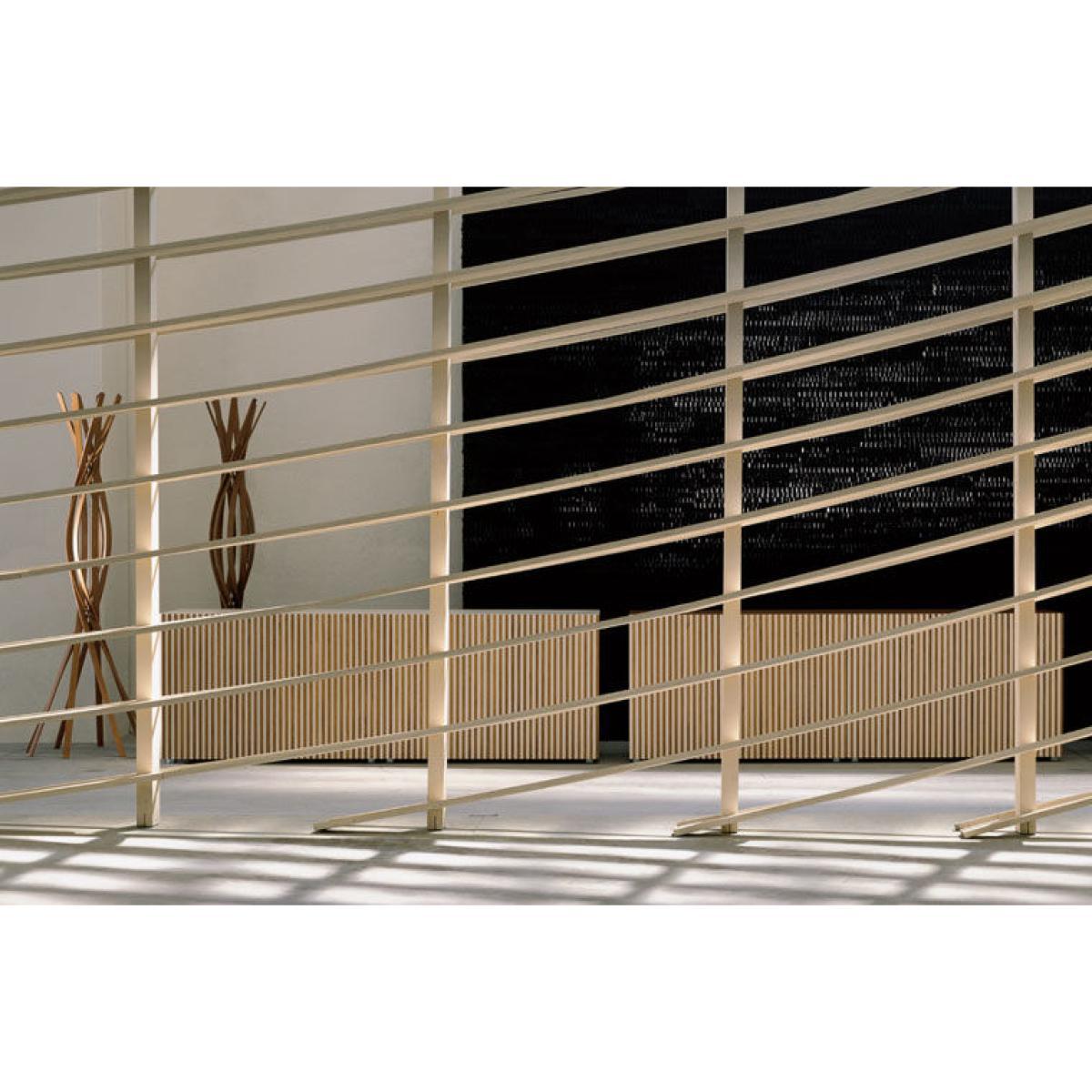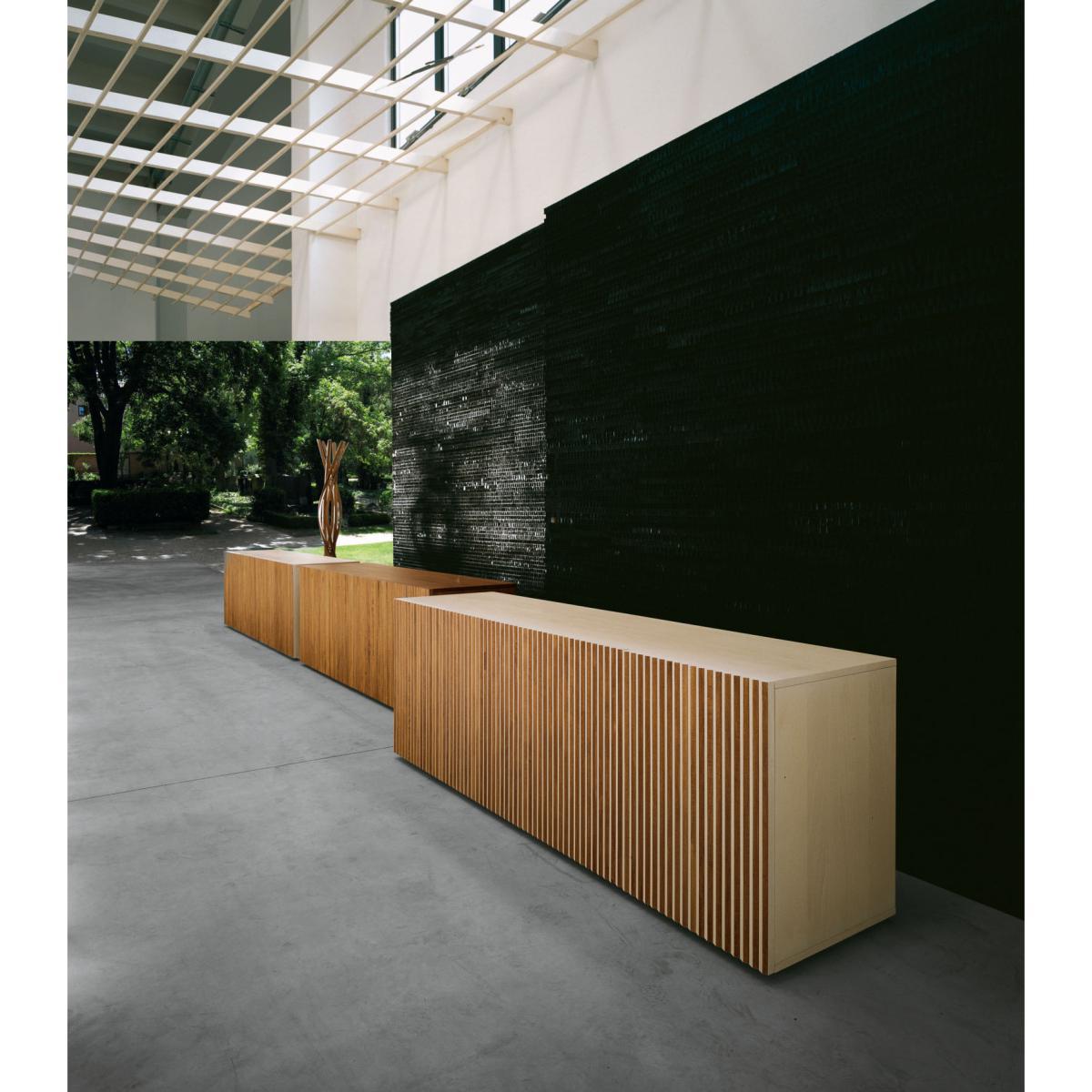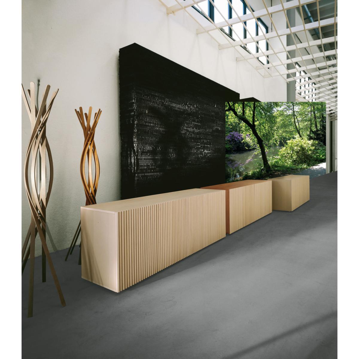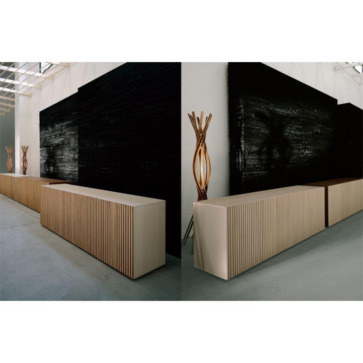 The name is a tribute to Leon Tarasewicz, a Polish artist of Belarusian origin who participated in the 49th Biennial in Venice. Inspired by the «plowed fields» that are a predominant theme in Tarasewicz's work, Leon has an evocative two-tone motif based on vertical lines in a mocha or cherry finish, which creates a number of optical effects. When viewed from the front, the piece has a two-tone look. But when seen from the side, it appears to have a uniform light or dark finish. It might be termed a product of «real kineticism» -an artistic idea applied to fine design. A quick glance tells you that the finish requires the careful, meticulous craftsmanship of skilled artisans.