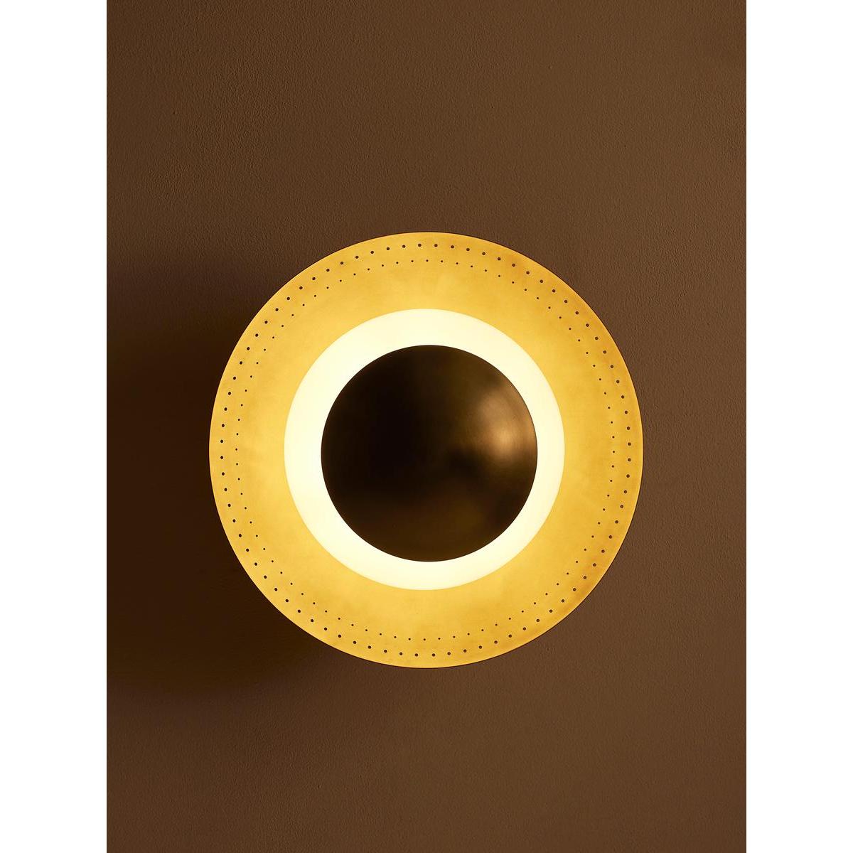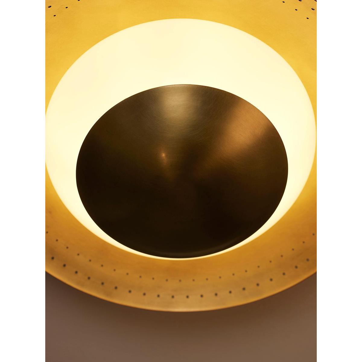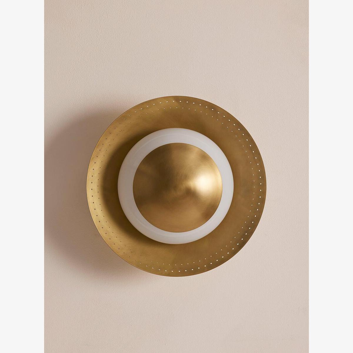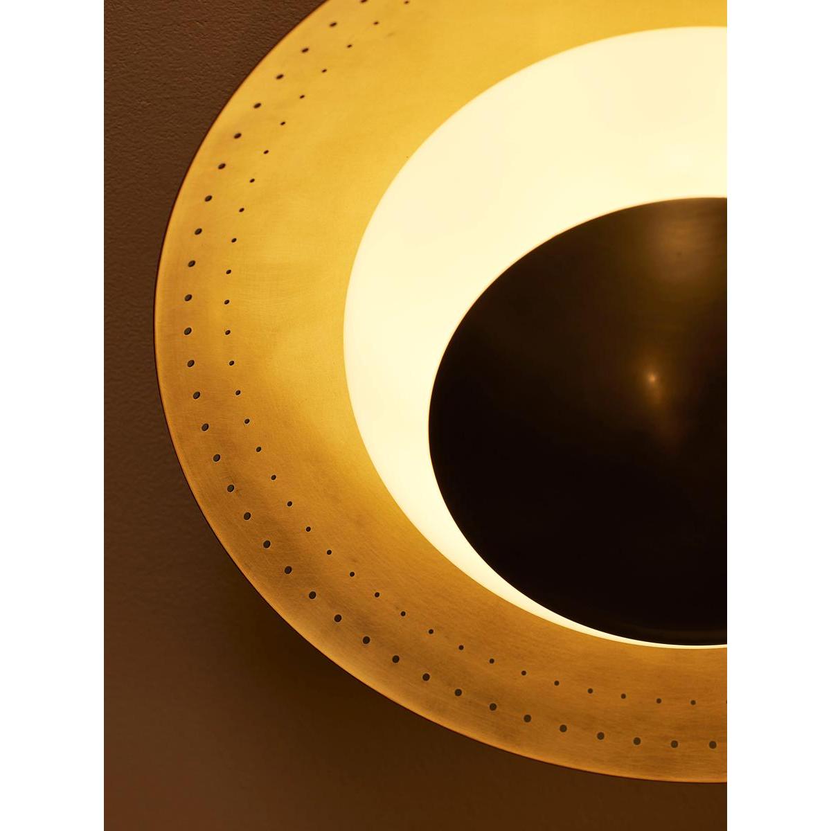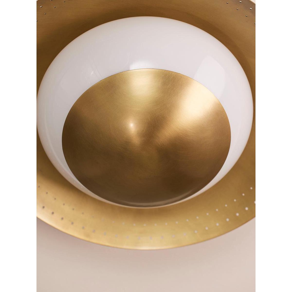 Adding a vintage-inspired feel to your lighting scheme, our Leon flush light sits close to the ceiling in a disc-shaped design. An opal globe light rests between a spun solid brass shade with perforated detail and a brass cap. This allows for a soft and flattering ring of light, ideal in the bathroom, to recreate the lighting of White City House.