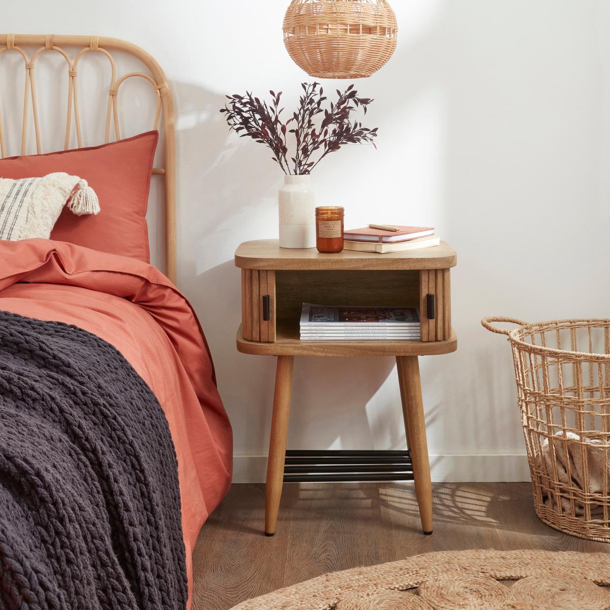 I love this little bedside table for its natural mango wood finish, which brings warmth and texture to a variety of interiors. It's versatile enough to complement boho, coastal, or Scandi-inspired spaces due to its simple, clean lines and light wood tone. Practical styling tips include layering with small lamps, books, or decorative vases to create a cosy nook, while storage can be utilised for everyday essentials. Its compact size makes it ideal for smaller bedrooms or for adding a subtle natural element without cluttering the space. Overall, it’s a timeless piece that adds both form and function effortlessly.