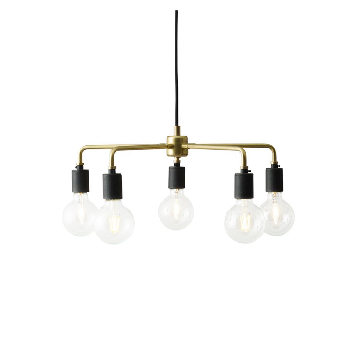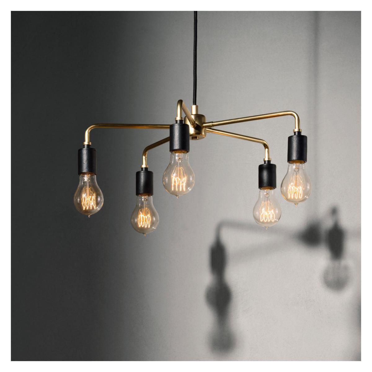 Crafted from a captivating configuration of brass, the Leonard Chandelier is a lesson in contemporary lines, playing with industrial joints through a symmetrical, circular arrangement of brass branches, each featuring a classic filament bulb at the end. The Leonard Chandelier forms part of the TriBe Ca collection by Soren Rose, inspired by the design aesthetics of New York City in the 1930s. After relocating his renowned, eponymous studio from Copenhagen to New York in 2011, Soren Rose began to combine his stripped-back Scandinavian design approach with the raw materials and industrialism of New York's design landscape. Rose travelled across America on a mission to collect beautiful lamps dating back to the early-mid 20th century; as he discovered them, he would take them to his studio, dismantle them, then combine and reimagine them to create the contemporary pieces of the TriBe Ca collection. This unique, starkly contemporary Leonard Chandelier in a brass finish would make the perfect sculptural light to lend artistic edge to a modern space. Ceiling rose not included. This chandelier requires 5 x max. 60W E27 bulbs (not included).