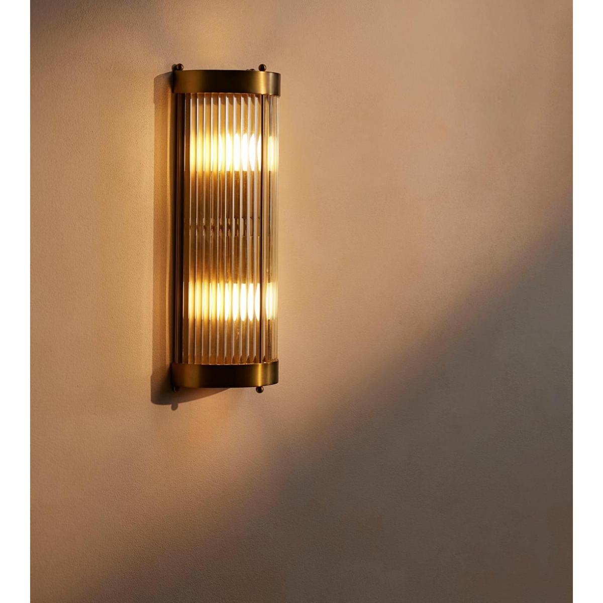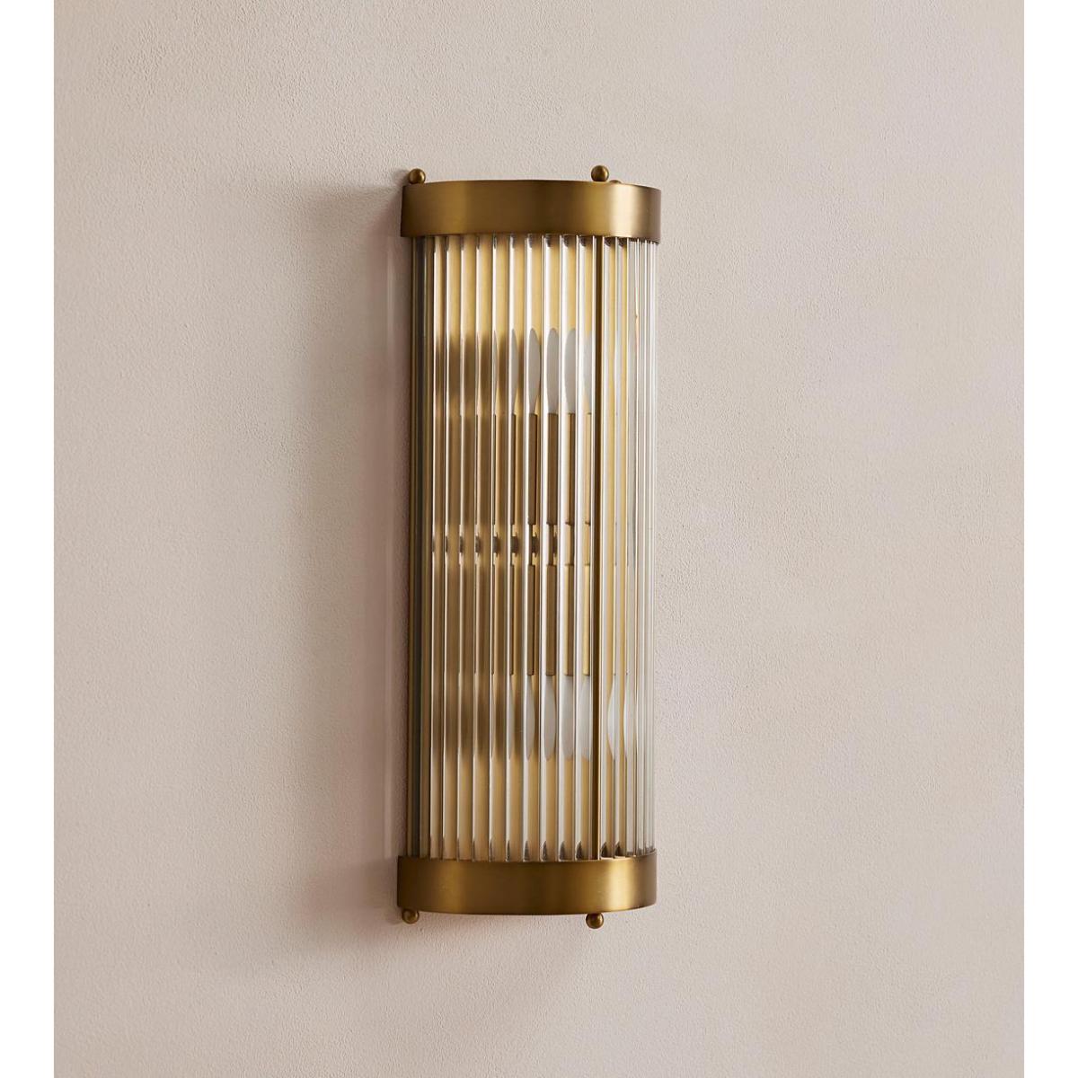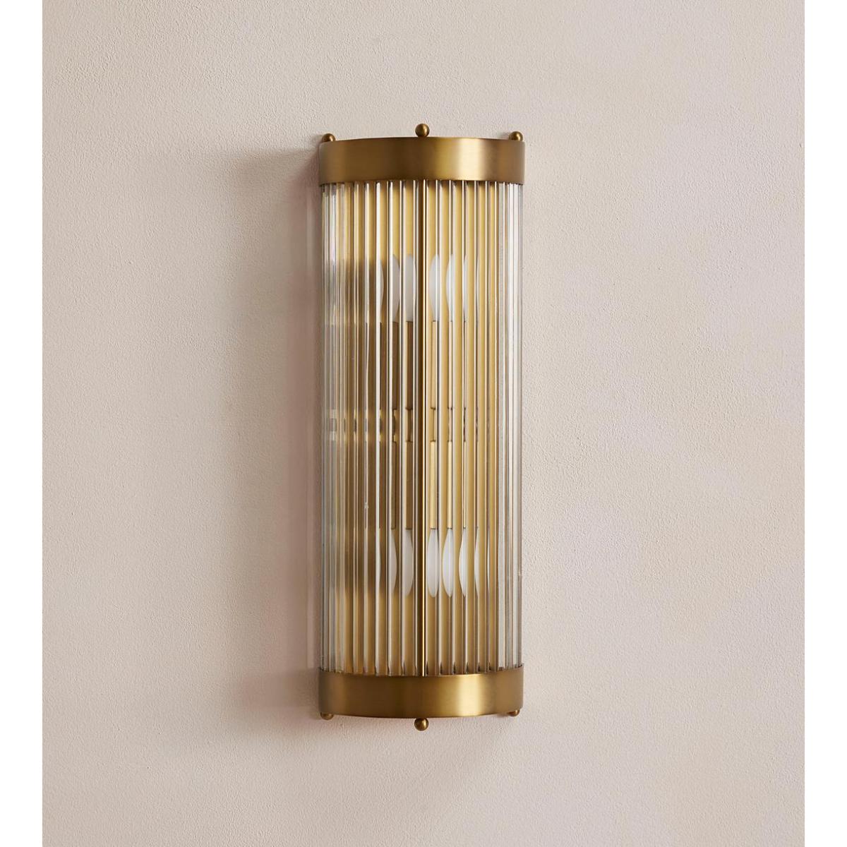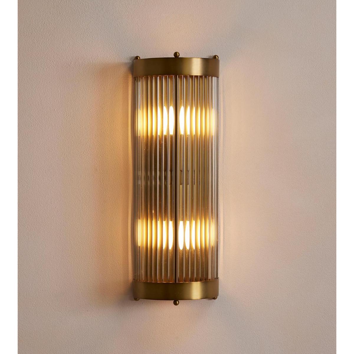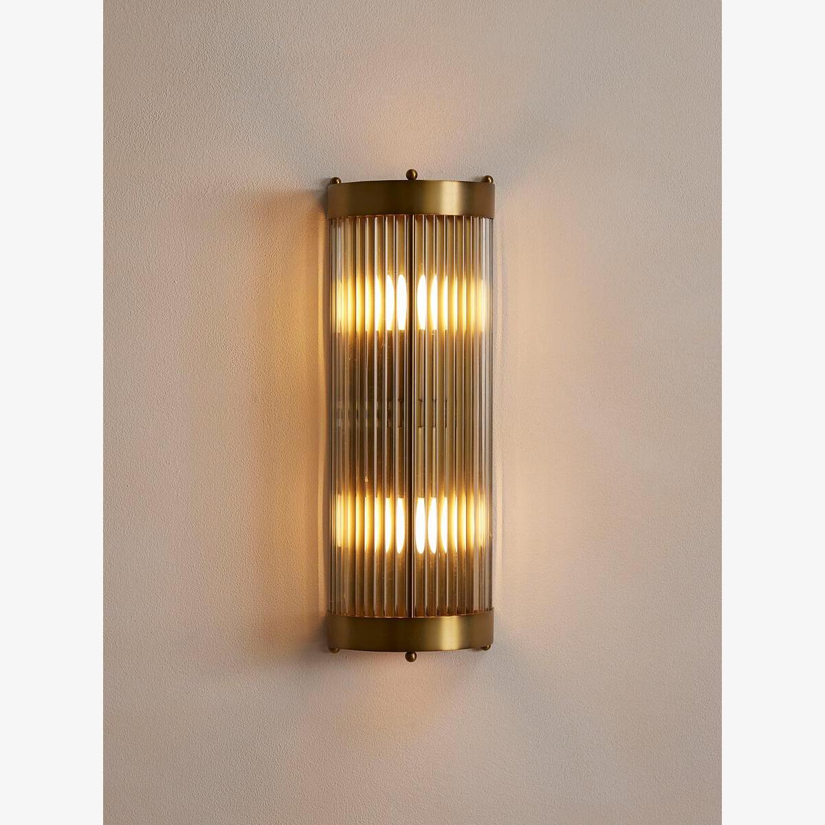 One of our most versatile styles, the Leonard is used for its flattering effect in our bedrooms, cinemas and spas. The open top and bottom cast dramatic patterns on the wall, while the translucent glass rods soften the light. The totem design fitting holds two bulbs, giving ample light throughout. Curved wall light with glass shade and antique brass fitting Glass rods are mounted in a curved formation to diffuse light Open top and bottom cast distinctive shapes Inspired by the light fixtures in Art Deco ballrooms Used in our bedrooms at Soho House Chicago, in Electric cinemas and our spas We recommend wiring our ceiling lights with a dimmer control to tailor the light level Suitable for use with the Tala Globe and Porcelain II bulbs