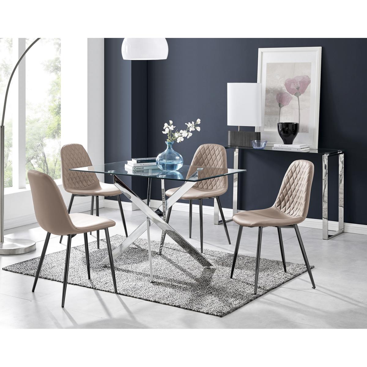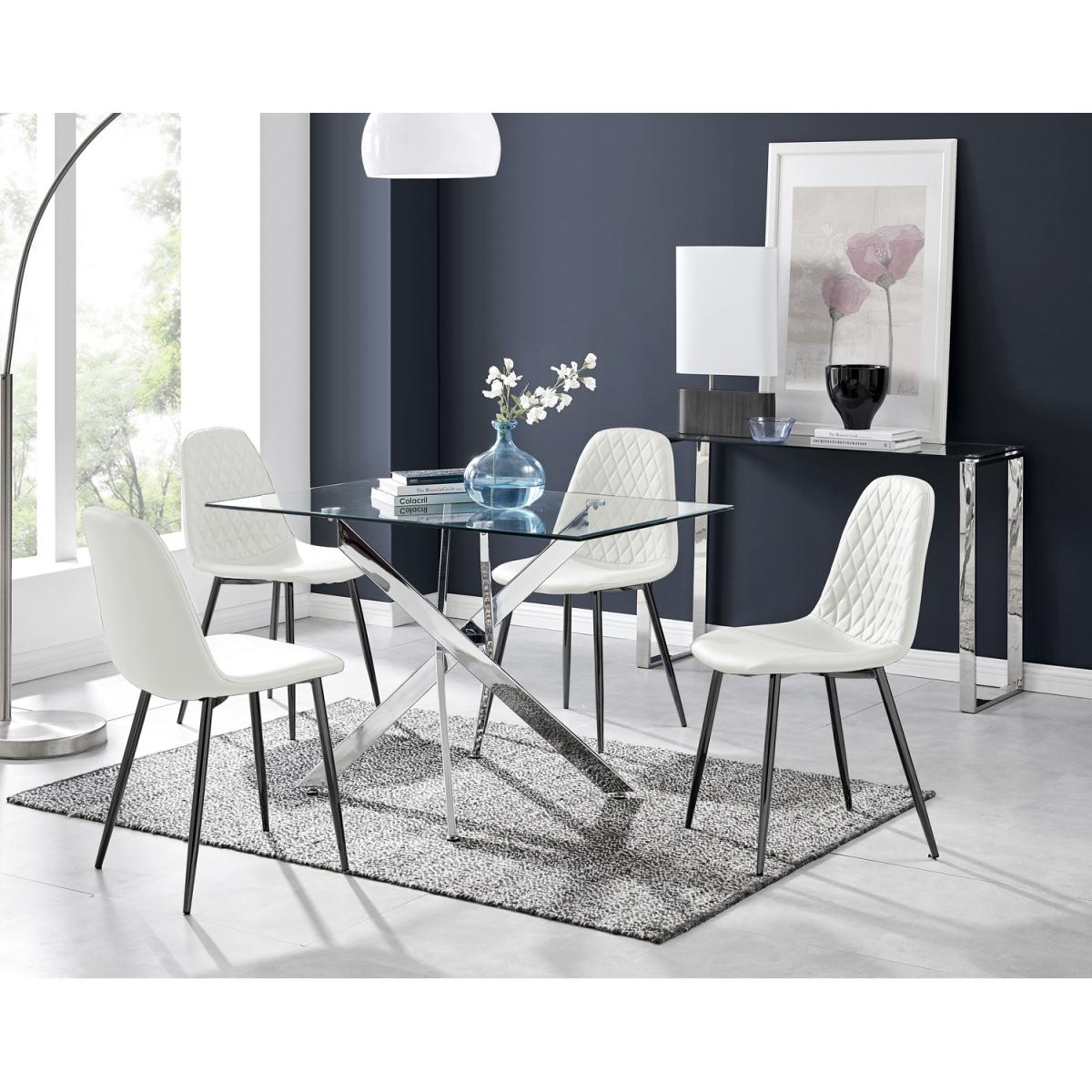 Impressively combining minimalist design with classy modern style, the Leonardo table will transform your dining room. The dining table is made from a combination of chrome metal and clear tempered glass, giving a bright and spacious feel to your dining space and creating a light open look. Featuring a spacious 120x70cm bevelled top surface there is ample space for up to 4 guests, with the hardened glass table top providing superior resistance to damage. Converging in a sleek nest shape the table legs create a unique look whilst also providing great stability for the table Styled with our statement Corona dining chairs, this set is a perfect balance of pattern and texture. The sleek black powder-coated legs of the Corona chairs are a great way to add a touch of minimalist style to your home. The Scandi-style faux leather seat with diamond pattern stitching is a unique take on a classic design offering comfort and durability for everyday use.