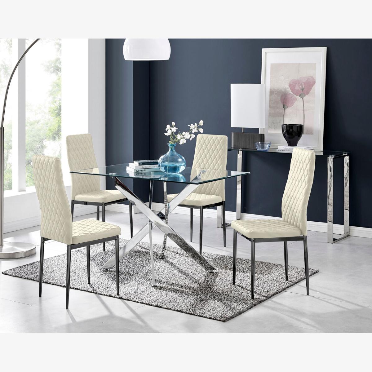Impressively combining minimalist design with classy modern style, the Leonardo table will transform your dining room. The dining table is made from a combination of chrome metal and clear tempered glass, giving a bright and spacious feel to your dining space and creating a light open look. Featuring a spacious 120x70cm bevelled top surface there is ample space for up to 4 guests, with the hardened glass table top providing superior resistance to damage. Converging in a sleek nest shape the table legs create a unique look whilst also providing great stability for the table Upholstered in soft touch cream velvet and finished with diamond pattern stitching the Milan dining chairs would seamlessly fit in with most dining spaces, whilst not compromising on either style or comfort. The stylish black powder coated metal leg and hatched velvet combination gives this chair a contemporary edge, whilst it's simple design allows for practical everyday usage. The chairs are made from high quality durable velvet that's easy to keep clean and are ergonomically designed for maximum comfort and support. They feature a deep foam seat cushion and plastic feet to protect the floor from any damage! At an unbeatable price you cannot go wrong with these chairs!