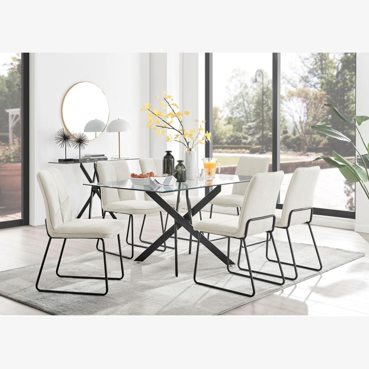 Impressively combining minimalist design with classy modern style, the Leonardo table will transform your dining room. The dining table is made from a combination of black metal and clear tempered glass, giving a bright and spacious feel to your dining space and creating a light open look. Featuring a spacious 150x90cm bevelled top surface there is ample space for up to 6 guests, with the hardened glass table top providing superior resistance to damage. Converging in a sleek nest shape the table legs create a unique look whilst also providing great stability for the table. The Halle chair is a super-stylish design with nods to postmodern mid-century classic elements. The clean lines of the deep-padded seat and on-trend industrial metal legs connected front and back with open diamond spaces will keep your dining or living room looking chic and classy. The soft cream fabric of these dining chairs will add warm tones to your dining room. The black powder coated metal legs have a matte effect which adds an industrial design to these contemporary dining chairs.