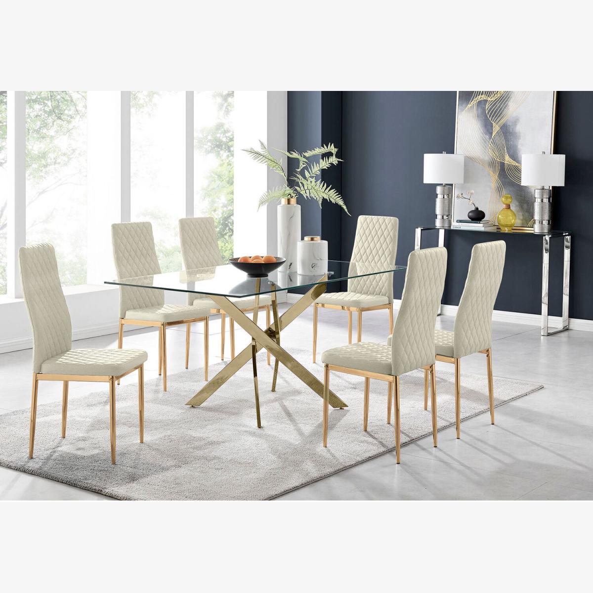 Impressively combining minimalist design with classy modern style, the Leonardo table will transform your dining room. The dining table is made from a combination of gold chrome metal and clear tempered glass, giving a bright and spacious feel to your dining space and creating a light open look. Featuring a spacious 150x90cm bevelled top surface there is ample space for up to 6 guests, with the hardened glass table top providing superior resistance to damage. Converging in a sleek nest shape the table legs create a unique look whilst also providing great stability for the table. Upholstered in soft touch cream velvet and finished with diamond pattern stitching the Milan dining chairs would seamlessly fit in with most dining spaces, whilst not compromising on either style or comfort. The stylish gold shiny chrome metal leg and hatched velvet combination gives this chair a contemporary edge, whilst it's simple design allows for practical everyday usage. The chairs are made from high quality durable velvet that's easy to keep clean and are ergonomically designed for maximum comfort and support. They feature a deep foam seat cushion and plastic feet to protect the floor from any damage! At an unbeatable price you cannot go wrong with these chairs!