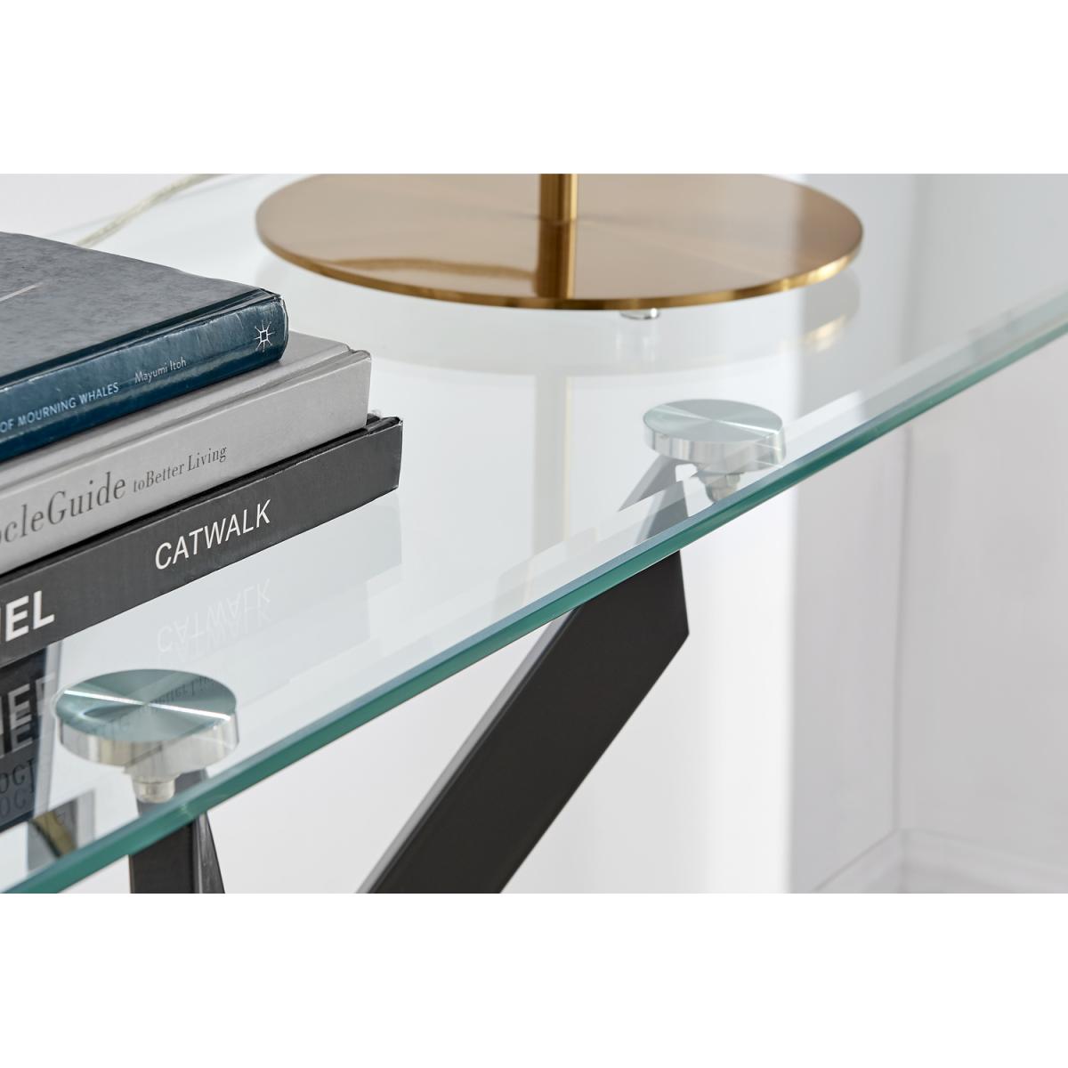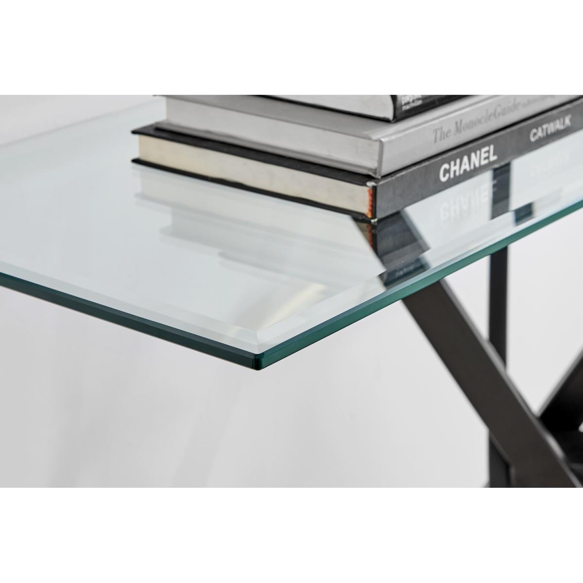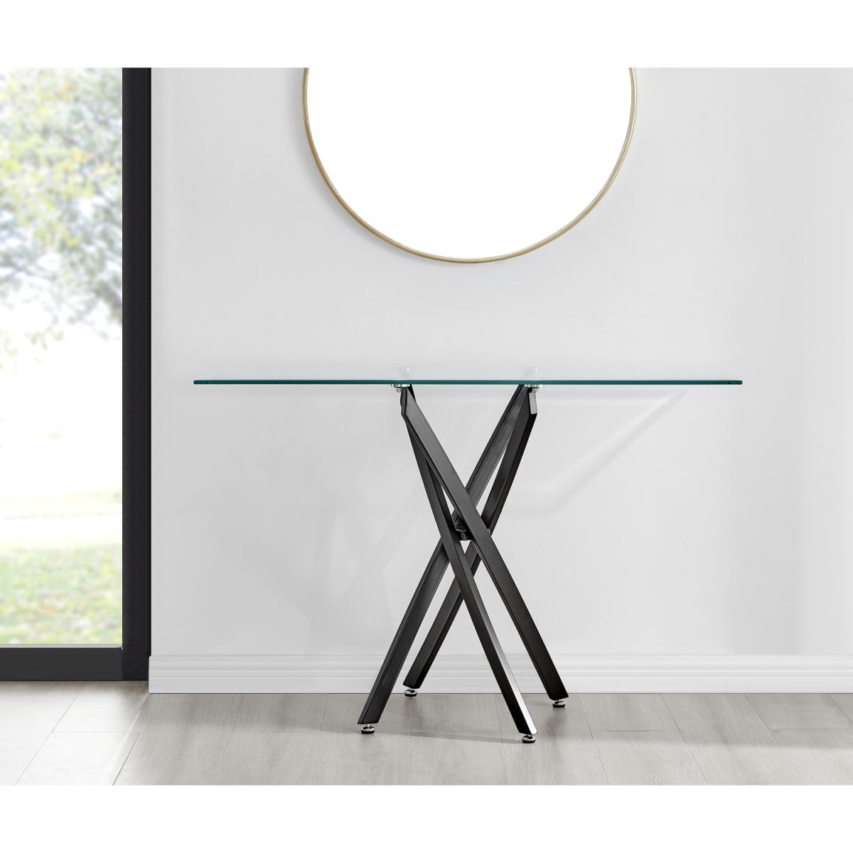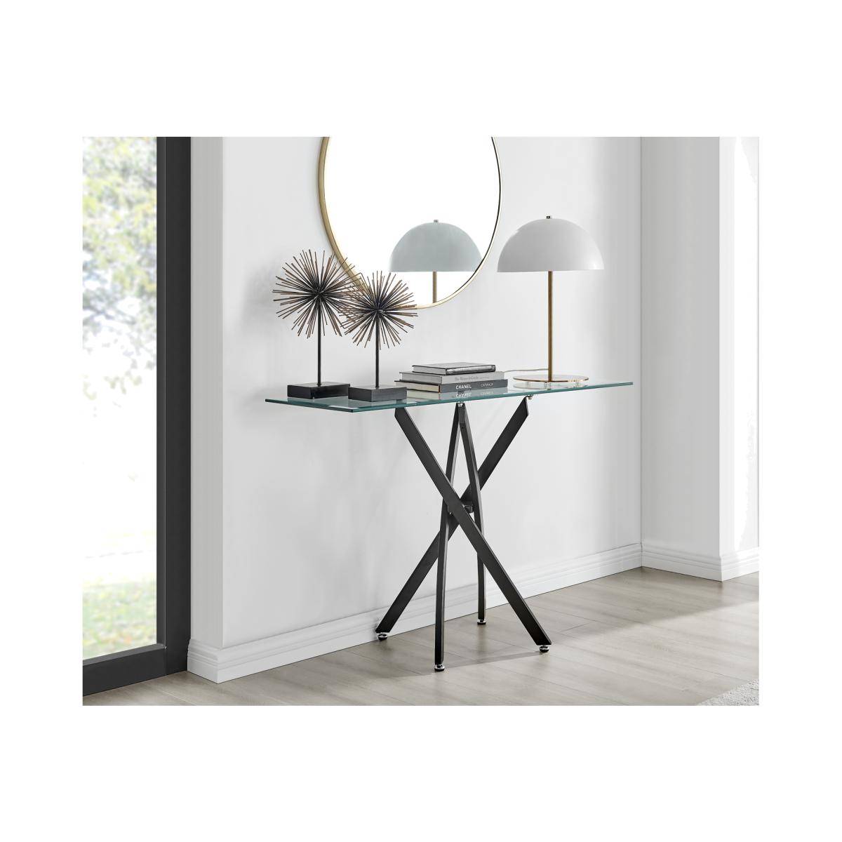 A classic combination of glass and matte black with a contemporary twist, the versatile Leonardo Console Table is a must-have piece for any modern living space, walkway or entrance hall. New to the Leonardo range, this spectacular console table is a perfect balance of design and function and is a must-have accessory for stylish interiors. Manufactured with a bevelled tempered safety glass top and industrial matte black legs, this stunning console table will truly make heads turn! Complete the look with the Leonardo Dining Table, Side Table and Coffee Table, all available with free next day delivery.