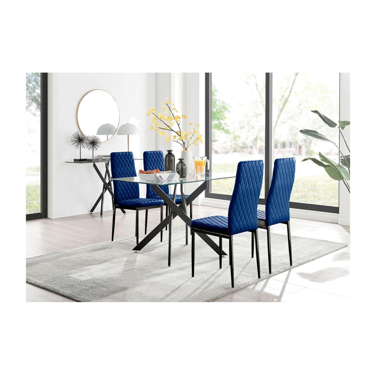 Impressively combining minimalist design with classy modern style, the Leonardo table will transform your dining room. The dining table is made from a combination of black metal and clear tempered glass, giving a bright and spacious feel to your dining space and creating a light open look. Featuring a spacious 120x70cm bevelled top surface there is ample space for up to 4 guests, with the hardened glass table top providing superior resistance to damage. Converging in a sleek nest shape the table legs create a unique look whilst also providing great stability for the table Upholstered in soft touch navy blue velvet and finished with diamond pattern stitching the Milan dining chairs would seamlessly fit in with most dining spaces, whilst not compromising on either style or comfort. The stylish black powder coated metal leg and hatched velvet combination gives this chair a contemporary edge, whilst it's simple design allows for practical everyday usage. The chairs are made from high quality durable velvet that's easy to keep clean and are ergonomically designed for maximum comfort and support. They feature a deep foam seat cushion and plastic feet to protect the floor from any damage! At an unbeatable price you cannot go wrong with these chairs!