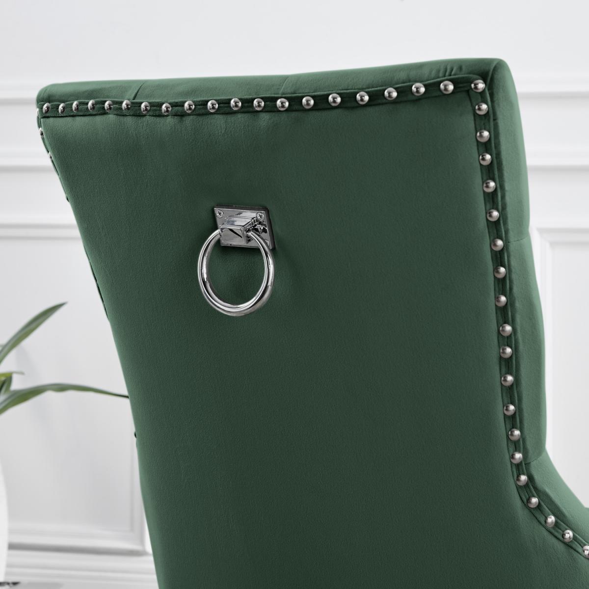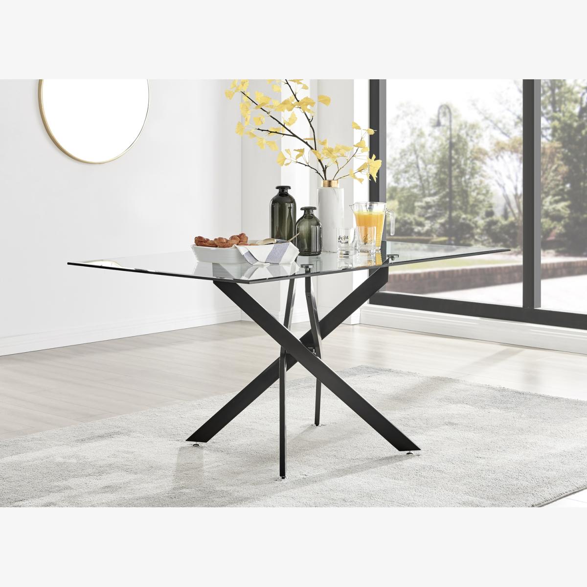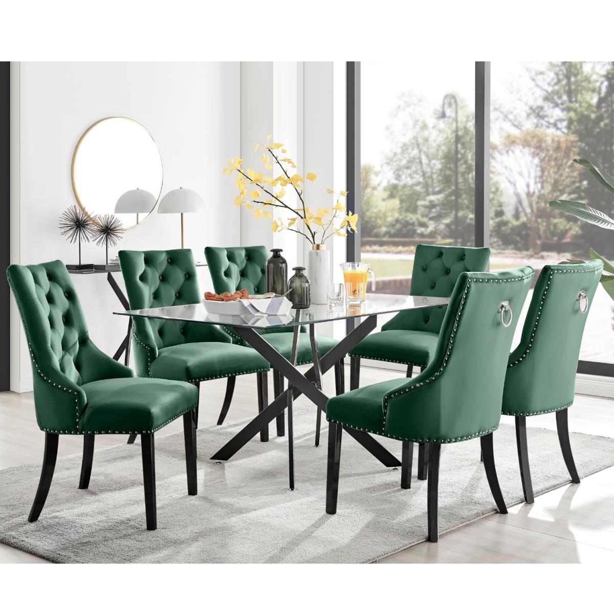 Impressively combining minimalist design with classy modern style, the Leonardo table will transform your dining room. The dining table is made from a combination of black metal and clear tempered glass, giving a bright and spacious feel to your dining space and creating a light open look. Featuring a spacious 150x90cm bevelled top surface there is ample space for up to 6 guests, with the hardened glass table top providing superior resistance to damage. Converging in a sleek nest shape the table legs create a unique look whilst also providing great stability for the table. The Belgravia knocker chair is the ultimate dining chair opulence with its scoop-back design that allows you and your guests to lean back and feel supported by the wrap-around arms.