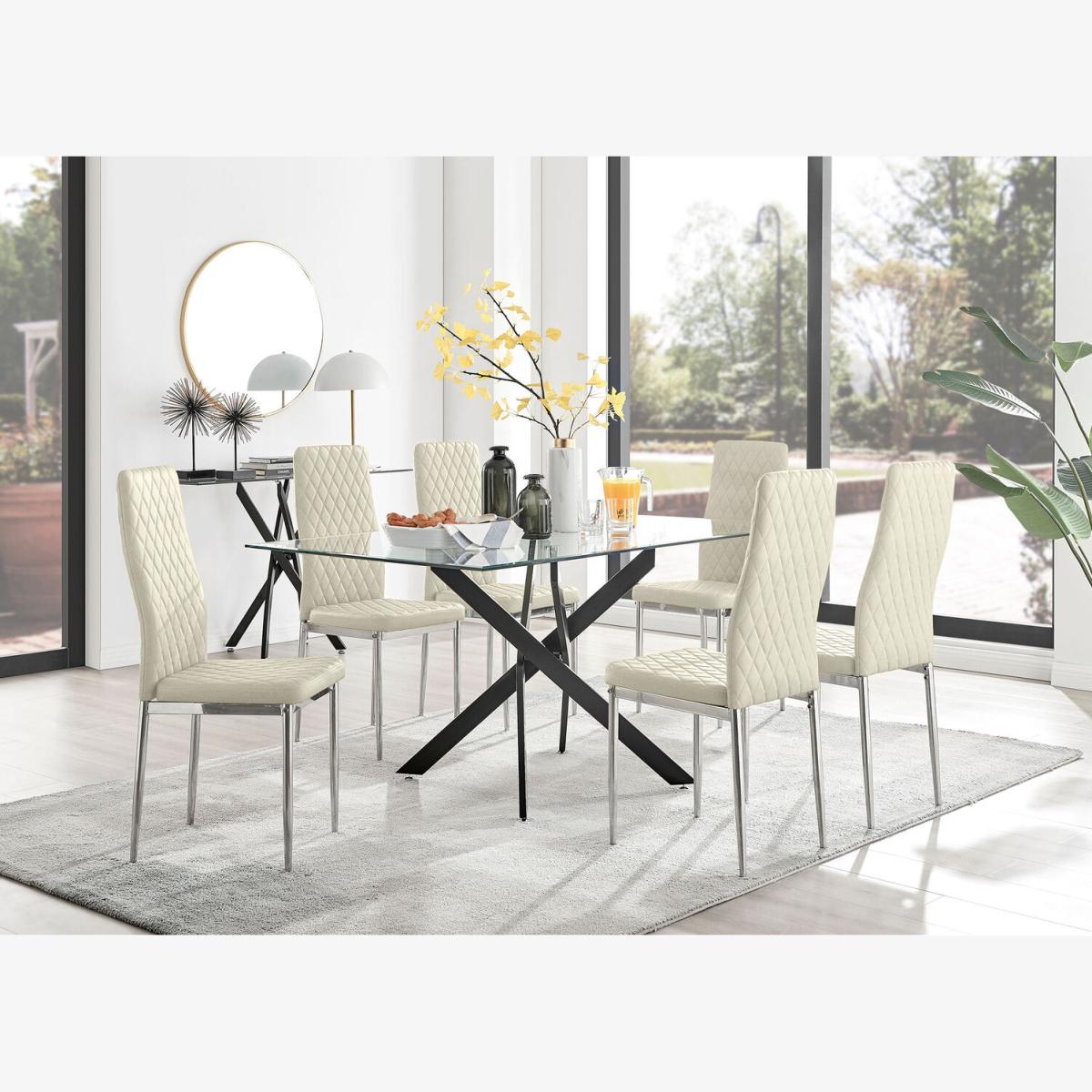 Impressively combining minimalist design with classy modern style, the Leonardo table will transform your dining room. The dining table is made from a combination of black metal and clear tempered glass, giving a bright and spacious feel to your dining space and creating a light open look. Featuring a spacious 150x90cm bevelled top surface there is ample space for up to 6 guests, with the hardened glass table top providing superior resistance to damage. Converging in a sleek nest shape the table legs create a unique look whilst also providing great stability for the table. Upholstered in soft touch cream velvet and finished with diamond pattern stitching the Milan dining chairs would seamlessly fit in with most dining spaces, whilst not compromising on either style or comfort. The stylish shiny chrome silver leg and hatched velvet combination gives this chair a contemporary edge, whilst it's simple design allows for practical everyday usage. The chairs are made from high quality durable velvet that's easy to keep clean and are ergonomically designed for maximum comfort and support. They feature a deep foam seat cushion and plastic feet to protect the floor from any damage! At an unbeatable price you cannot go wrong with these chairs!