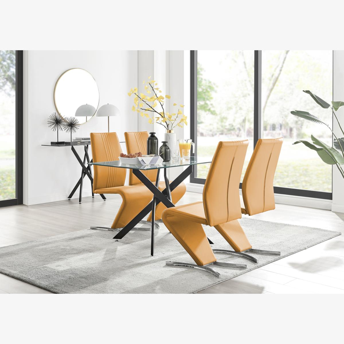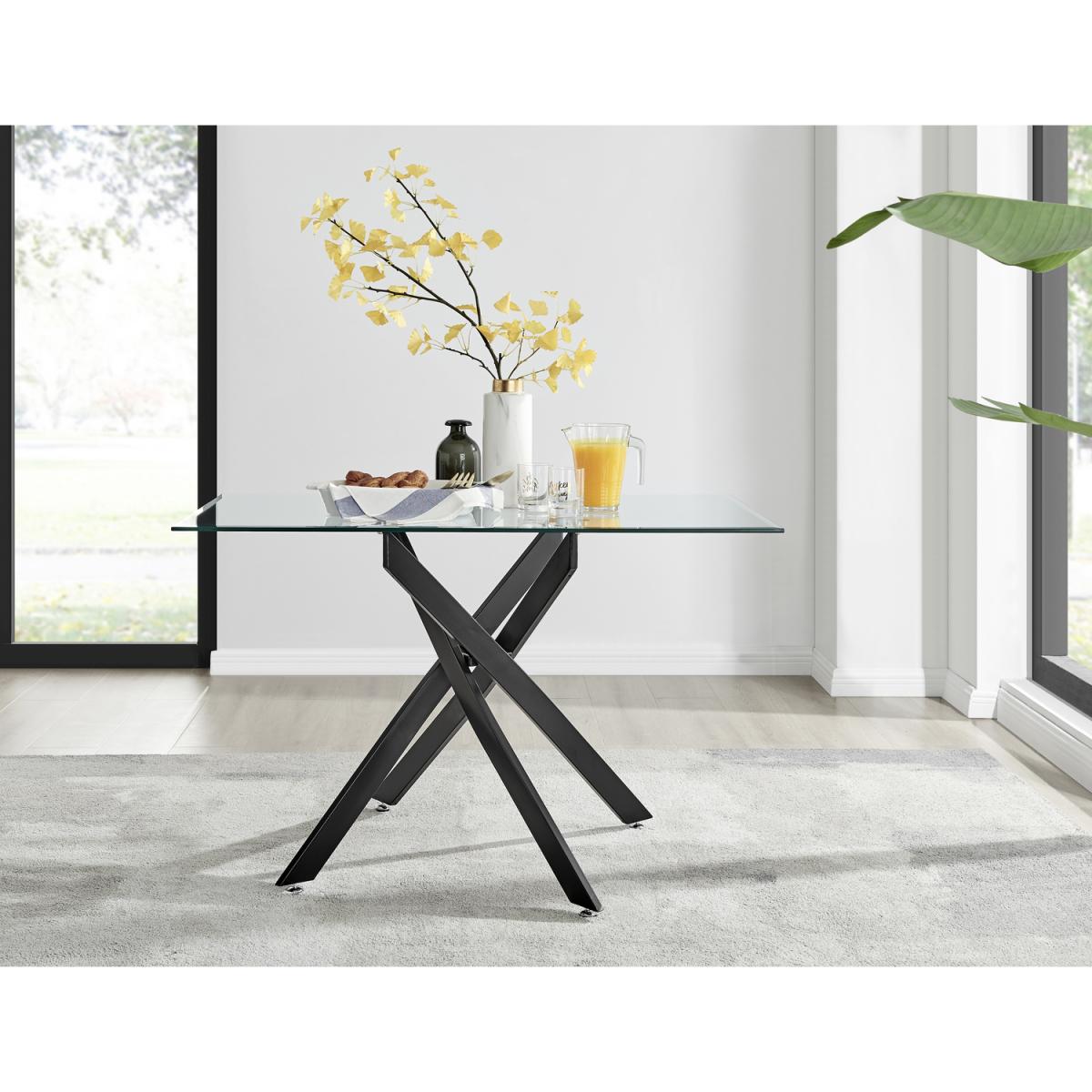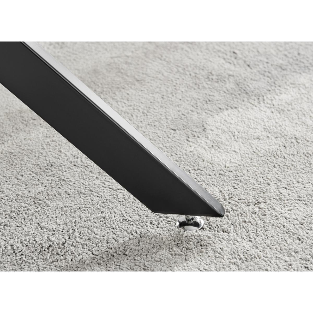 Impressively combining minimalist design with classy modern style, the Leonardo table will transform your dining room. The dining table is made from a combination of black metal and clear tempered glass, giving a bright and spacious feel to your dining space and creating a light open look. Featuring a spacious 120x70cm bevelled top surface there is ample space for up to 4 guests, with the hardened glass table top providing superior resistance to damage. Converging in a sleek nest shape the table legs create a unique look whilst also providing great stability for the table paired with our eye-catching Willow chairs, with their luxurious curved frame and half crescent chrome feet, this set is sure to make any space a talking point for years to come. With such an appealing design and price tag we just love it and are sure that you will too!