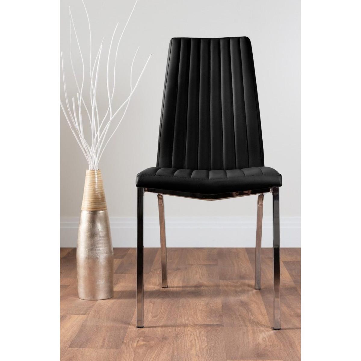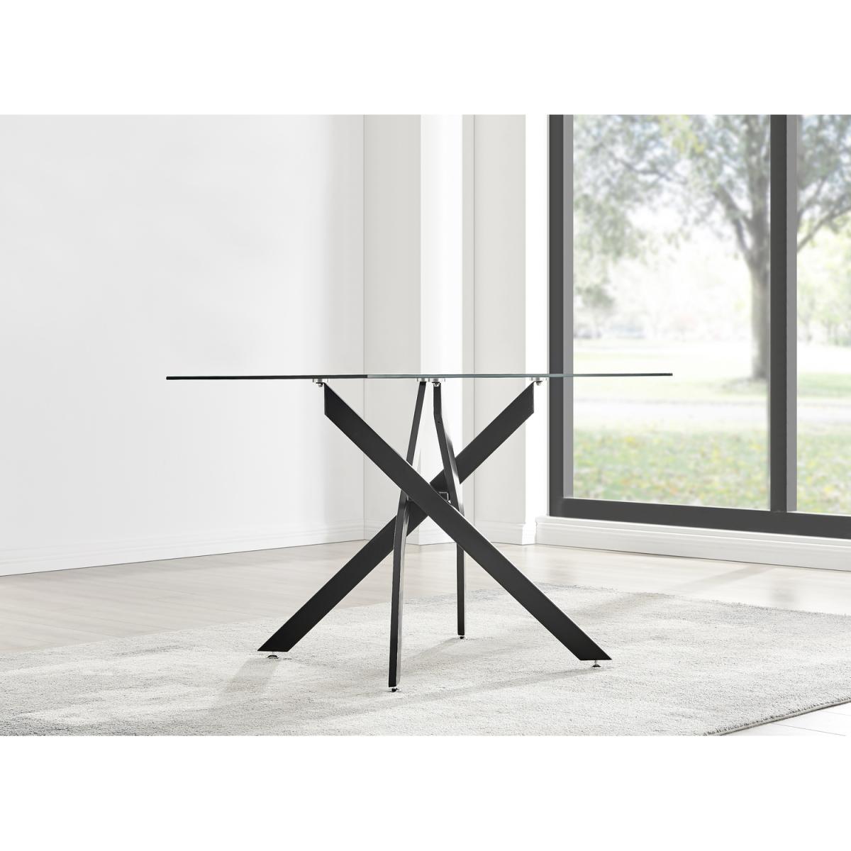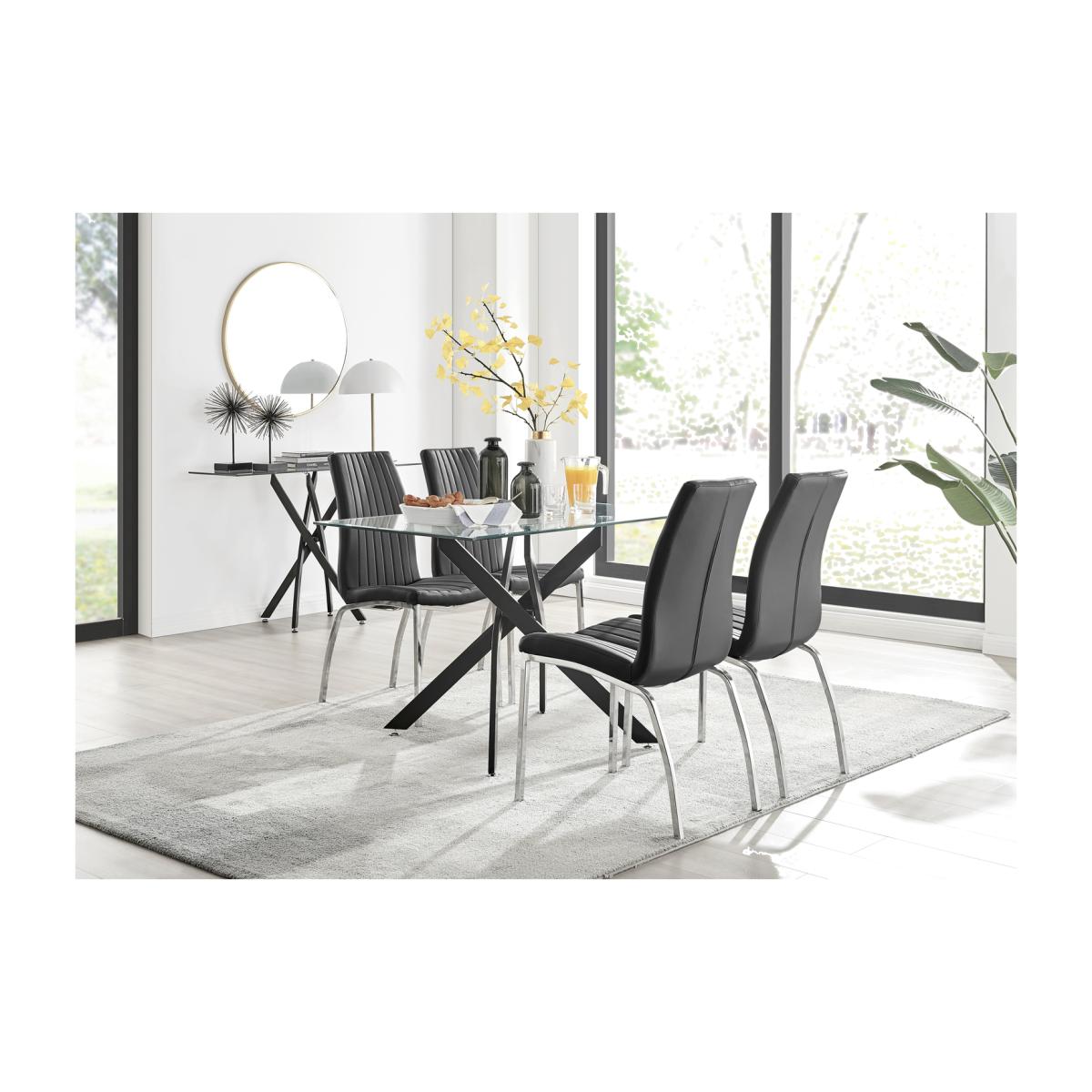 Impressively combining minimalist design with classy modern style, the Leonardo table will transform your dining room. The dining table is made from a combination of black metal and clear tempered glass, giving a bright and spacious feel to your dining space and creating a light open look. Featuring a spacious 120x70cm bevelled top surface there is ample space for up to 4 guests, with the hardened glass table top providing superior resistance to damage. Converging in a sleek nest shape the table legs create a unique look whilst also providing great stability for the table coupled with our Isco chrome and faux leather dining chairs' clean lines combined with comfort and texture to make them a perfect match to complete this dining set. The soft-touch faux leather seat pads are interspaced with vertical stitching and are designed for comfort with the bonus of looking great.