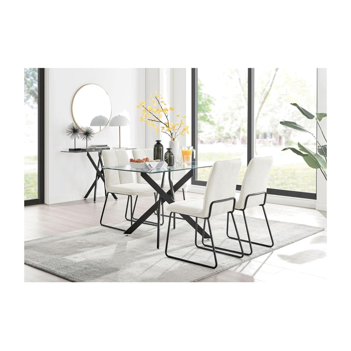 Impressively combining minimalist design with classy modern style, the Leonardo table will transform your dining room. The dining table is made from a combination of gold chrome metal and clear tempered glass, giving a bright and spacious feel to your dining space and creating a light open look. Featuring a spacious 120x70cm bevelled top surface there is ample space for up to 4 guests, with the hardened glass table top providing superior resistance to damage. Converging in a sleek nest shape the table legs create a unique look whilst also providing great stability for the table The Halle chair is a super-stylish design with nods to postmodern mid-century classic elements. The clean lines of the deep-padded seat and on-trend industrial metal legs connected front and back with open diamond spaces will keep your dining or living room looking chic and classy. The soft cream fabric of these dining chairs will add warm tones to your dining room. The black powder coated metal legs have a matte effect which adds an industrial design to these contemporary dining chairs.