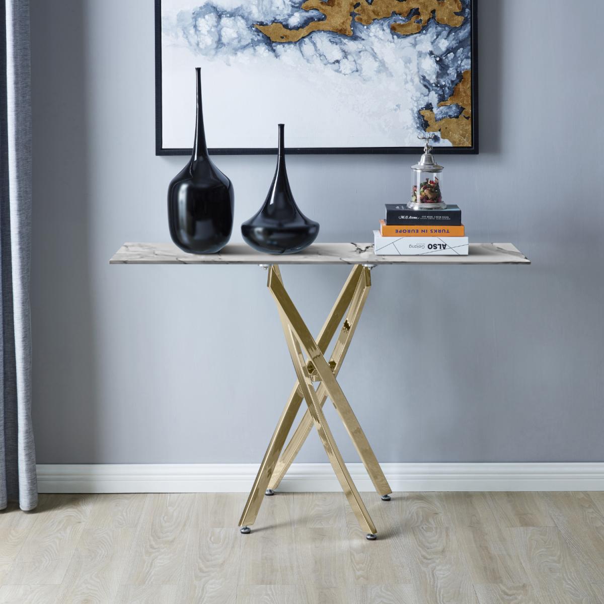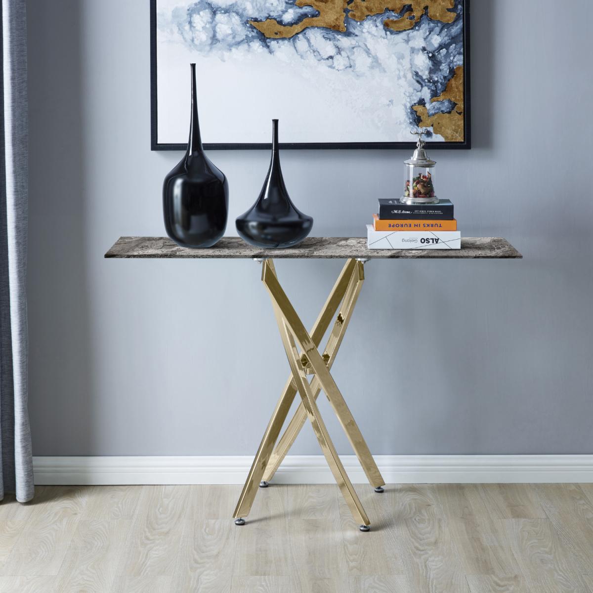Our Leonardo glass marble effect console table has shiny chrome gold legs in a stylish nested starburst design. We're excited to bring you this update to our popular Leonardo range! Combining minimalist design with classy contemporary style, the Leonardo glass marble console, or occasional, table will transform your living room or hallway. The marble-effect glass tabletop has a veining pattern and, when paired with the reflective gold legs, creates an ultra modern, sleek and spacious feel for your home that adds a focal point without overwhelming your space. This rectangular tabletop is made from strong tempered glass with a marble effect and a flat edge. It's sat on top of sturdy gold chromed legs, so it's not only designed to last but to look great while doing it! Available in a range of other colourmaterials, with matching coffee tables, side tables and dining sets, so check out the full Leonardo range for more ideas. Note The marbling effect is a bespoke and unique pattern each time, to reflect the one-of-a-kind patterns of natural marble, so some variations will occur from the pattern shown in the photos.