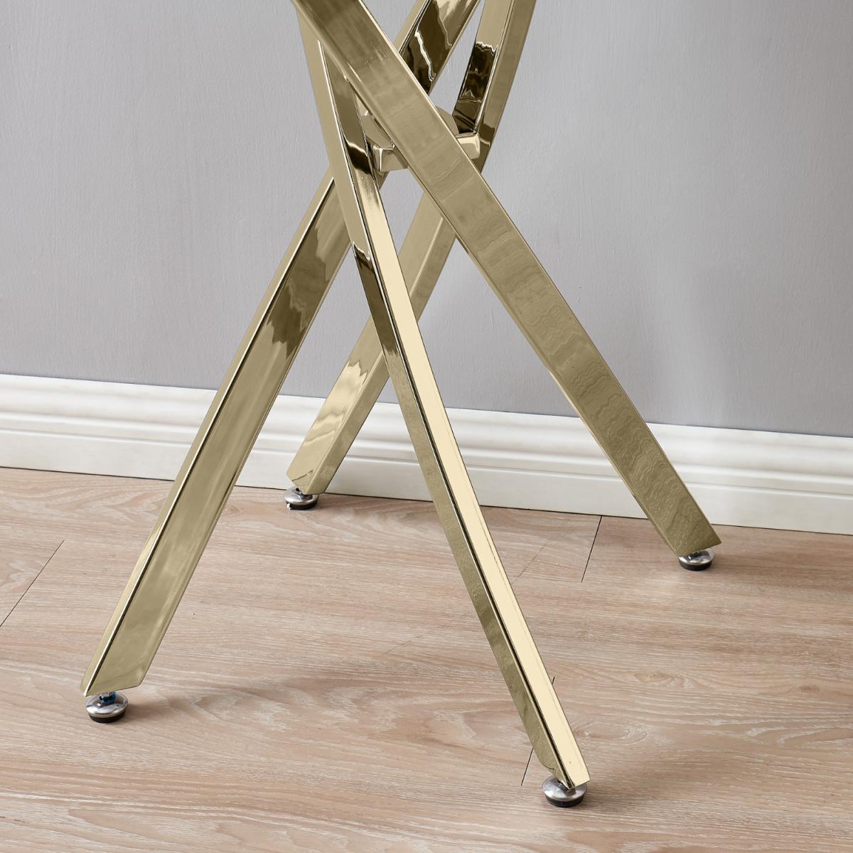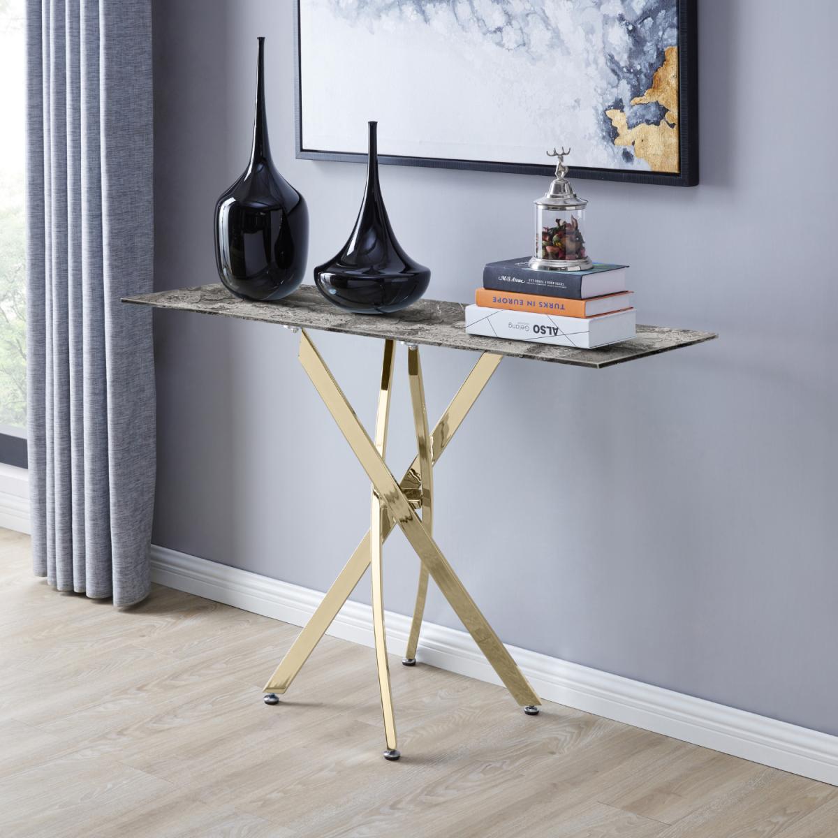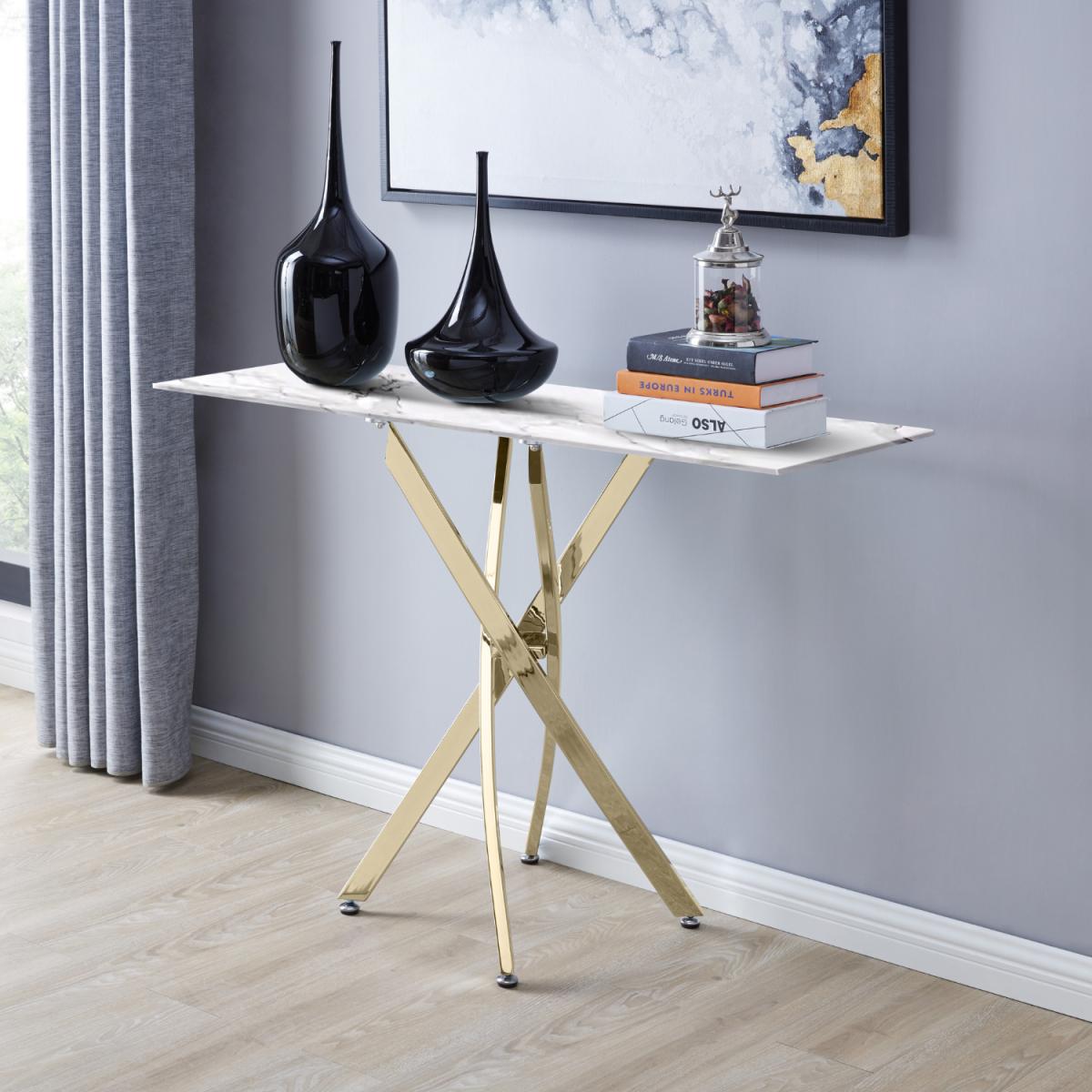 Our Leonardo glass marble effect console table has shiny chrome gold legs in a stylish nested starburst design. We're excited to bring you this update to our popular Leonardo range! Combining minimalist design with classy contemporary style, the Leonardo glass marble console, or occasional, table will transform your living room or hallway. The marble-effect glass tabletop has a veining pattern and, when paired with the reflective gold legs, creates an ultra modern, sleek and spacious feel for your home that adds a focal point without overwhelming your space. This rectangular tabletop is made from strong tempered glass with a marble effect and a flat edge. It's sat on top of sturdy gold chromed legs, so it's not only designed to last but to look great while doing it! Available in a range of other colourmaterials, with matching coffee tables, side tables and dining sets, so check out the full Leonardo range for more ideas. Note The marbling effect is a bespoke and unique pattern each time, to reflect the one-of-a-kind patterns of natural marble, so some variations will occur from the pattern shown in the photos.