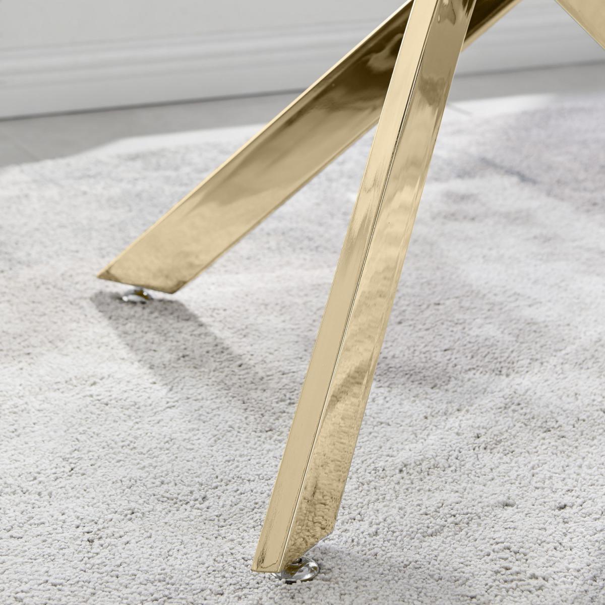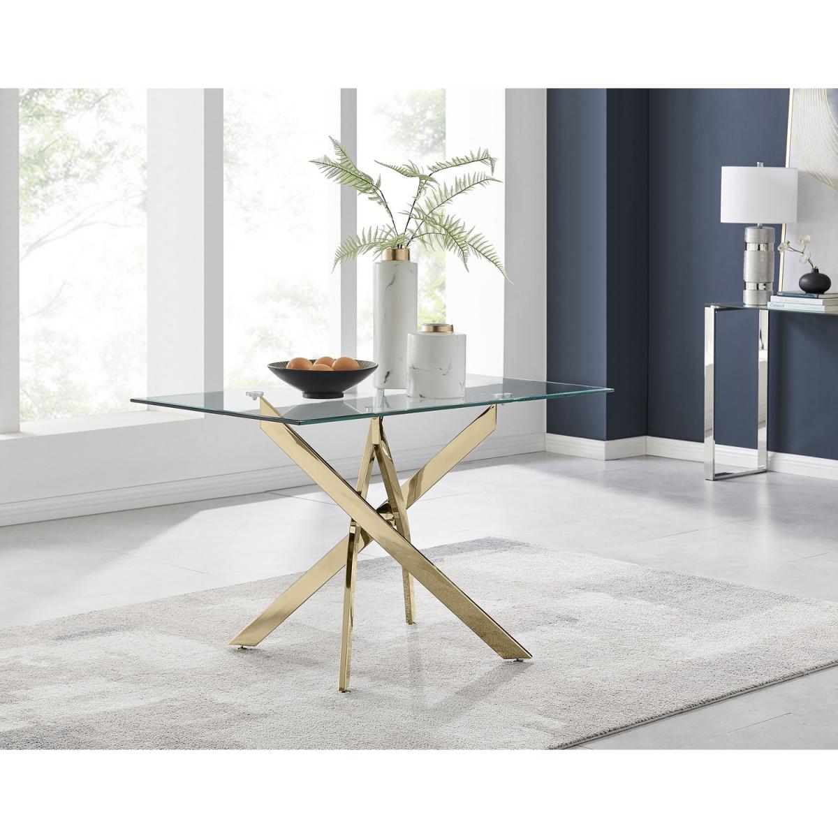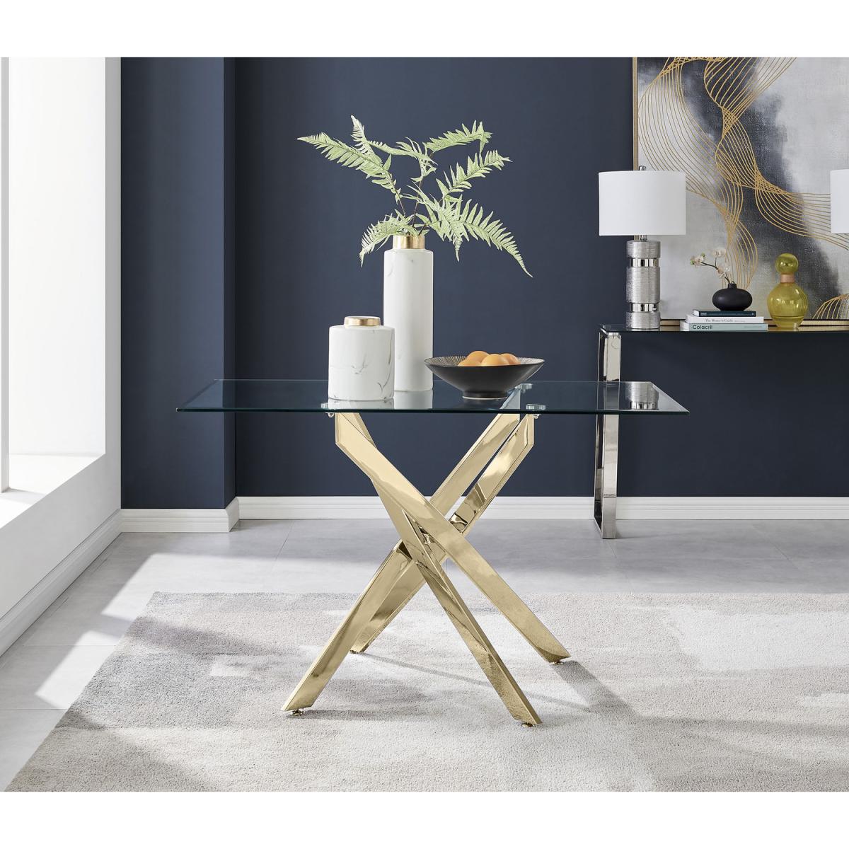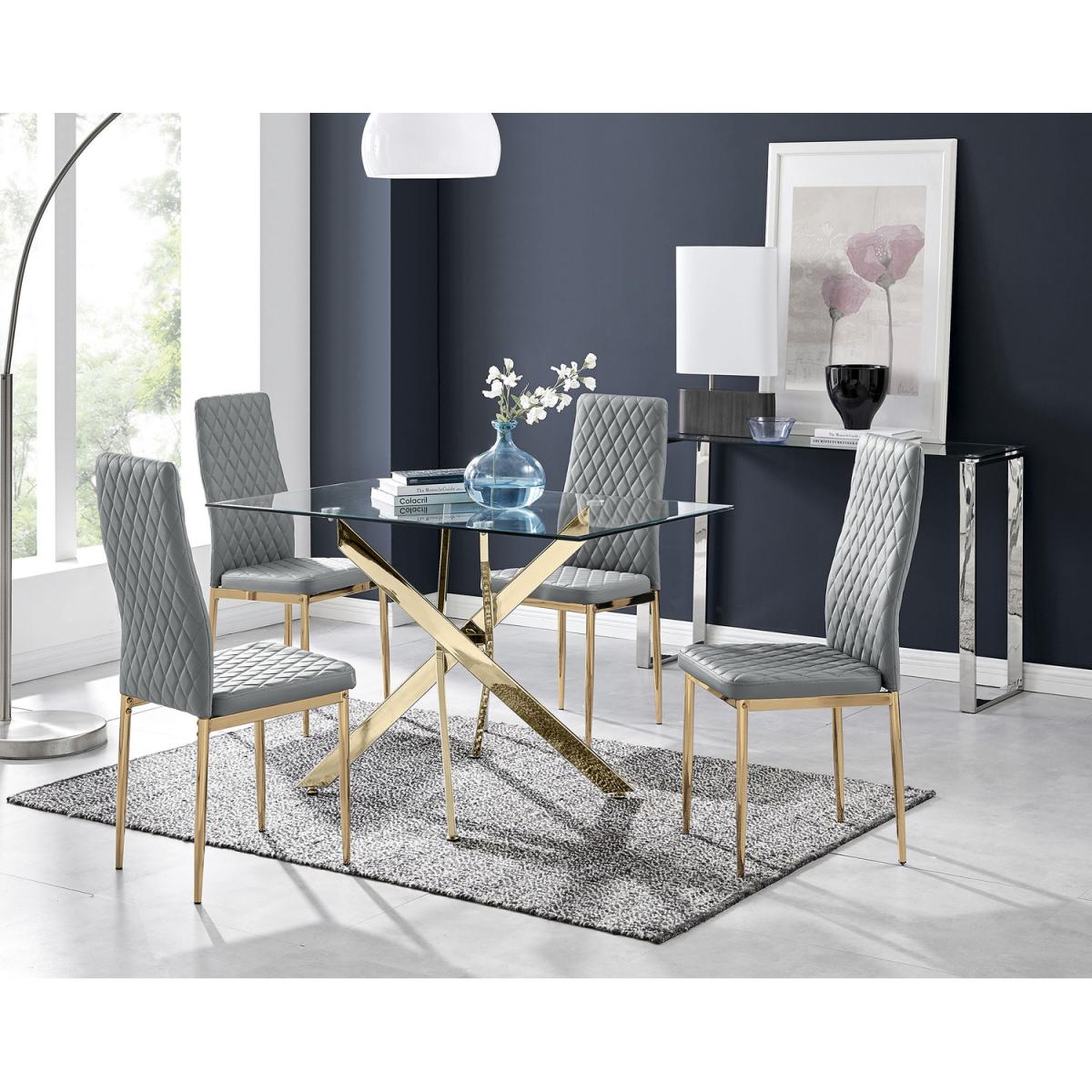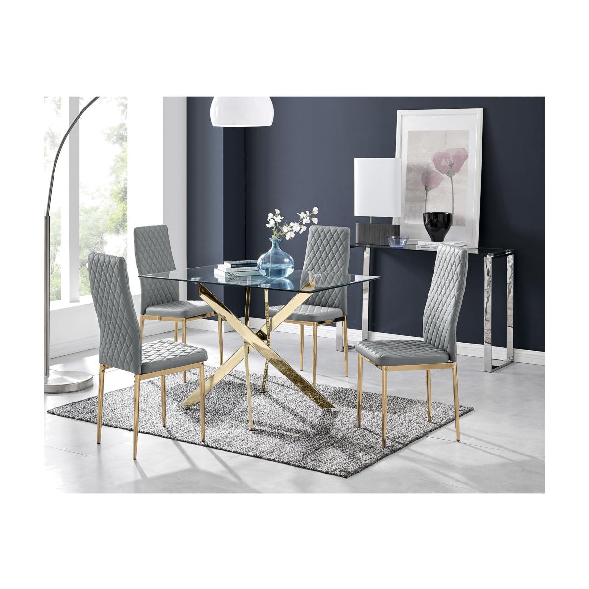Impressively combining minimalist design with classy modern style, the Leonardo table will transform your dining room. The dining table is made from a combination of gold chrome metal and clear tempered glass, giving a bright and spacious feel to your dining space and creating a light open look. Featuring a spacious 120x70cm bevelled top surface there is ample space for up to 4 guests, with the hardened glass table top providing superior resistance to damage. Converging in a sleek nest shape the table legs create a unique look whilst also providing great stability for the table Paired alongside our beautiful faux leather diamond quilted Milan dining chairs for a sophisticated contemporary look. The Milan chairs are made from high-quality faux leather with trendy gold effect legs and are ergonomically designed for maximum comfort and back support. Made for regular use, the protective plastic feet will protect your floor from any damage. Available in elephant grey, cappuccino grey, white, black or mustard to add your personality and complete this gorgeous dining set.