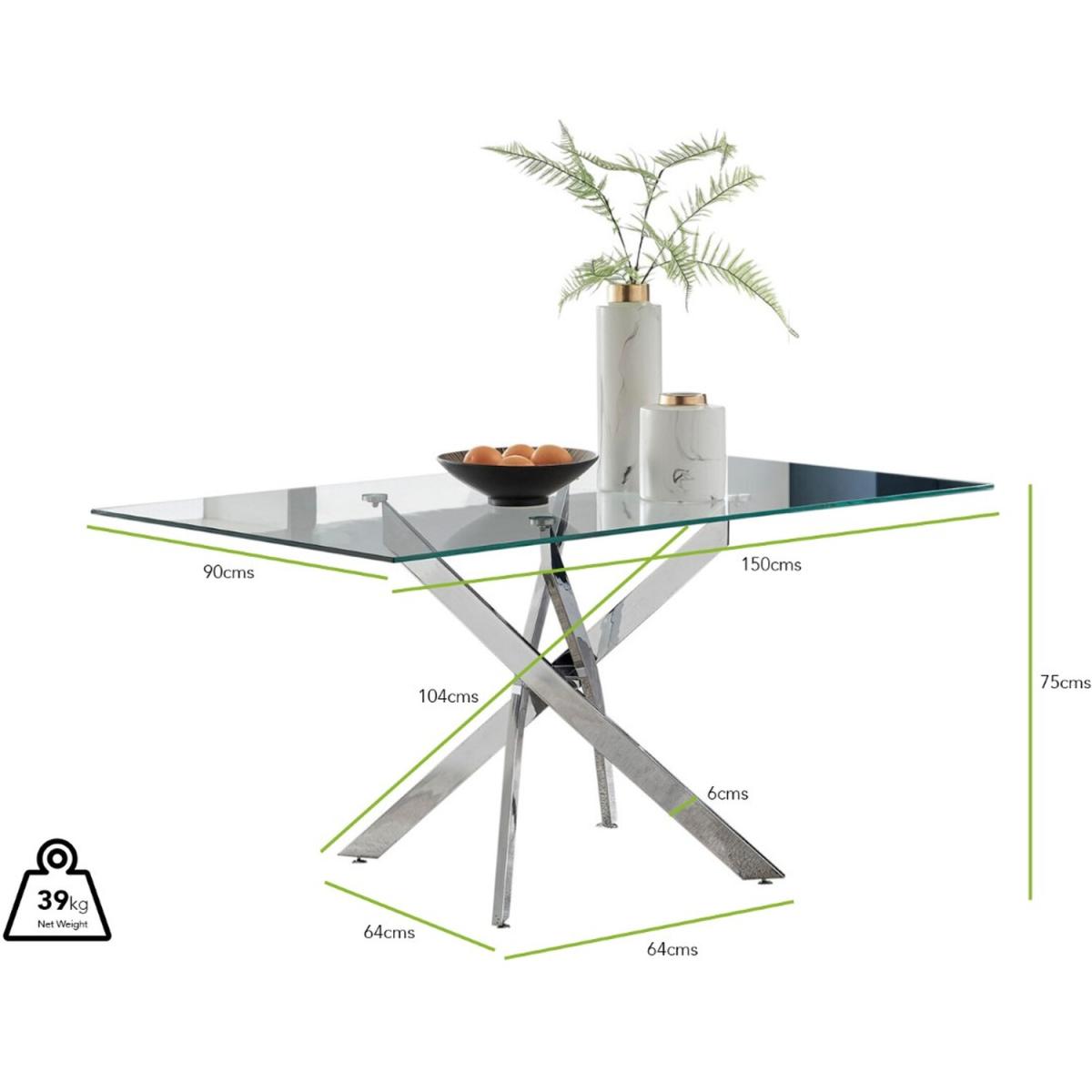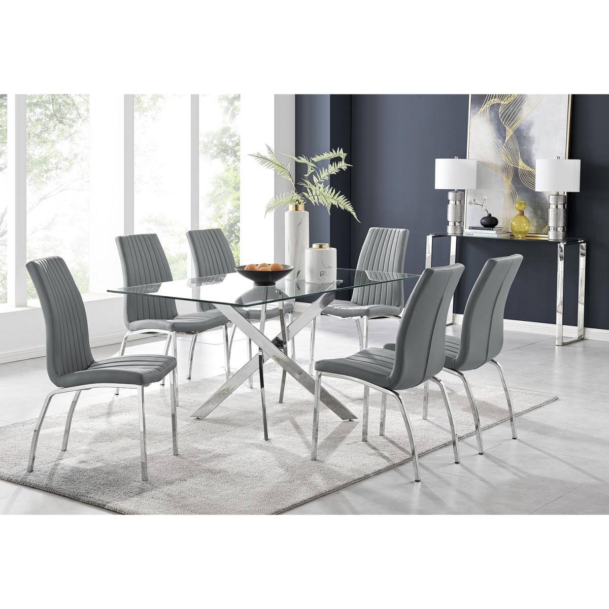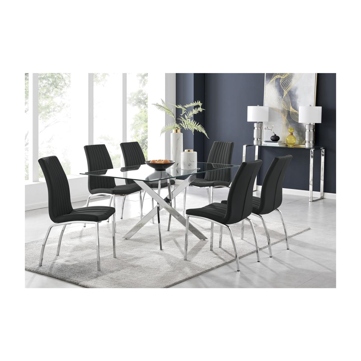 Impressively combining minimalist design with classy modern style, the Leonardo set will transform your dining room. The dining table is made from a combination of chrome metal and clear tempered glass, giving a bright and spacious feel to your dining space and creating a light open look. Featuring a large 150x90cm bevelled top surface there is ample space for up to 6 guests, with the hardened glass table top providing superior resistance to damage. Converging in a sleek nest shape the table legs create a unique look whilst also providing great stability for the table. Pair the Leonardo table with our Isco chairs for a complete look. Clean lines combine with comfort and texture to make the Isco chair the ideal choice in understated style, the perfect partner for any design of the table. The soft-touch faux leather seat pads are inter-spaced with vertical stitching and are designed for comfort with the bonus of looking great. Value for money with style combine to make an unbeatable package!