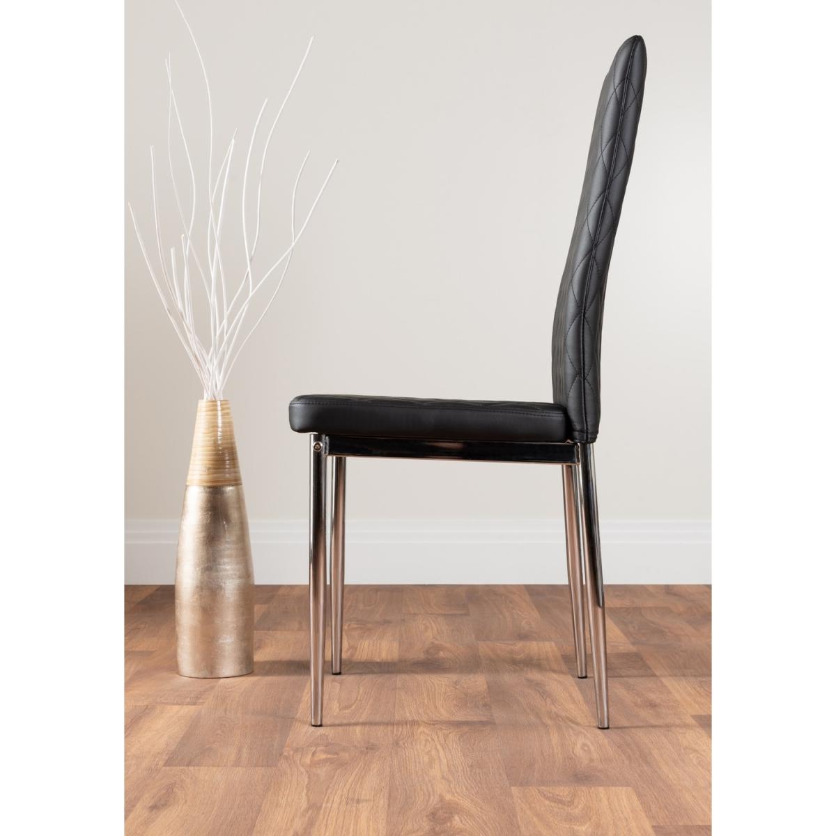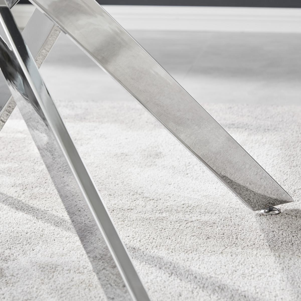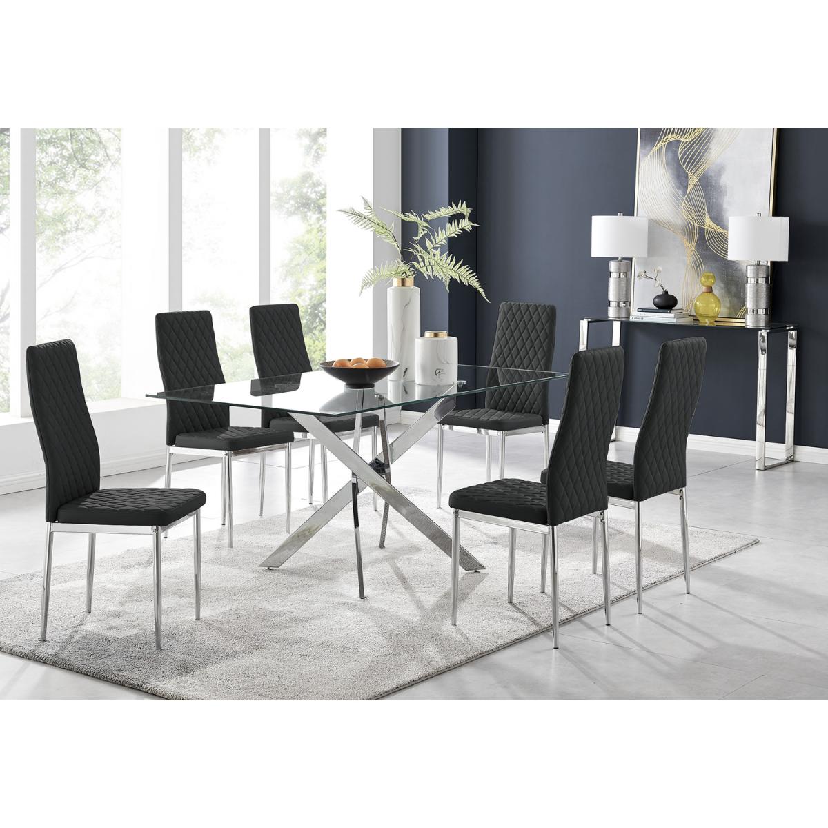Impressively combining minimalist design with classy modern style, the Leonardo set will transform your dining room. The dining table is made from a combination of chrome metal and clear tempered glass, giving a bright and spacious feel to your dining space and creating a light open look. Featuring a large 150x90cm bevelled top surface there is ample space for up to 6 guests, with the hardened glass table top providing superior resistance to damage. Converging in a sleek nest shape the table legs create a unique look whilst also providing great stability for the table. Paired alongside our beautiful faux leather diamond quilted Milan chairs, you can't go wrong with this set. The chairs are made from high-quality faux leather and are ergonomically designed for maximum comfort and support. They feature soft touch faux leather with a deep foam seat cushion and plastic feet to protect the floor from any damage! With such an appealing design and price tag we just love it and are sure that you will too!