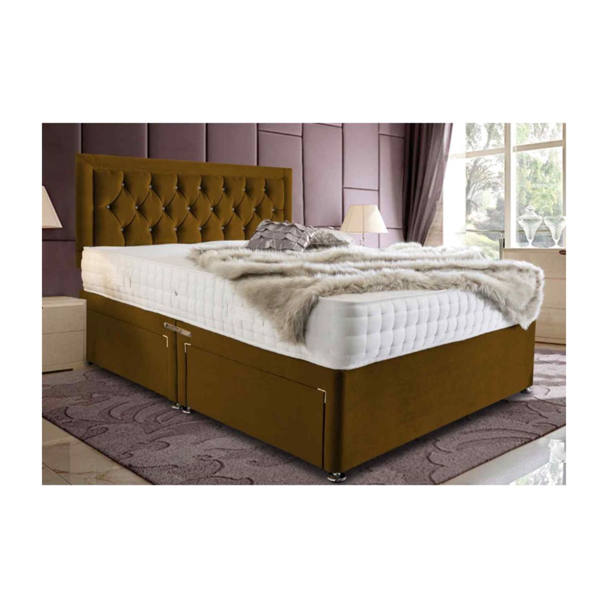 The all new modern designer divan bed frame, handmade in the UK. Beautiful chesterfield upholstered headboard and footboard with diamantes with optional storage options. To complete the look this bed comes with chrome feet. This bed is sure to add a glamourous look to any bedroom setting. Recommended mattress is a 10 inch.