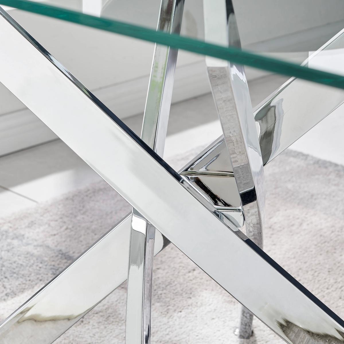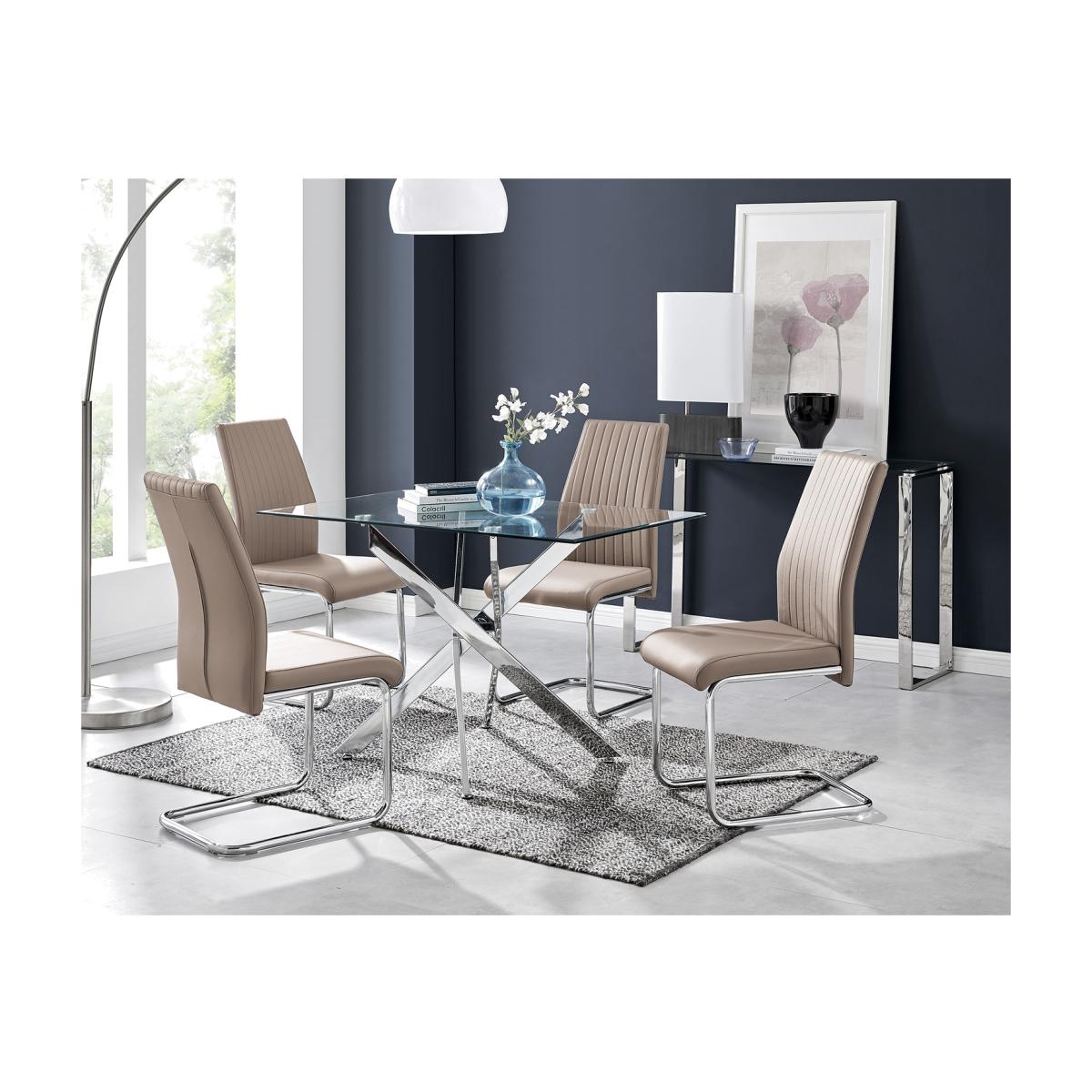Impressively combining minimalist design with classy modern style, the Leonardo set will transform your dining room. The dining table is made from a combination of chrome metal and clear tempered glass, giving a bright and spacious feel to your dining space and creating a light open look. Featuring a spacious 120x70cm bevelled top surface there is ample space for up to 4 guests, with the hardened glass table top providing superior resistance to damage. Converging in a sleek nest shape the table legs create a unique look whilst also providing great stability for the table. Pair the Leonardo table with our Lorenzo chairs for a complete look. Featuring on-trend chrome cantilevered legs and supportive seat pads, these are eye-catching chairs, that don't compromise on comfort. With such an appealing design and price tag we just love it and are sure that you will too!