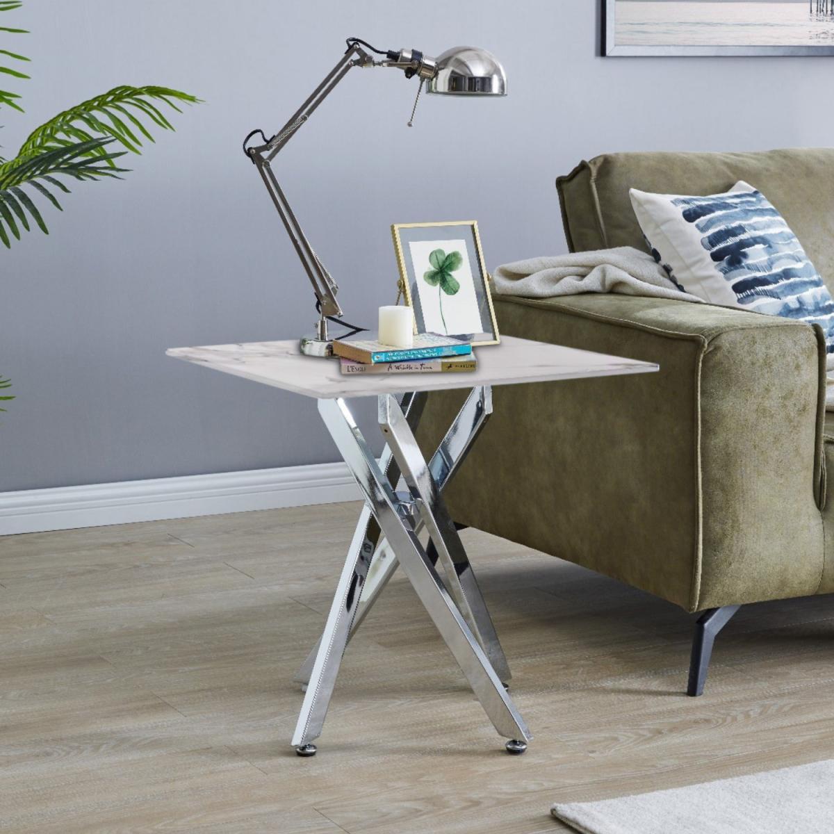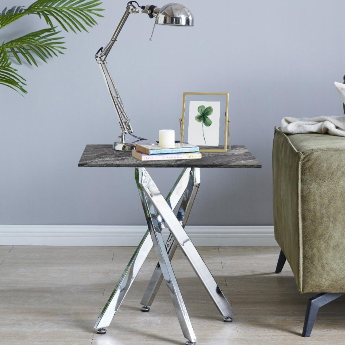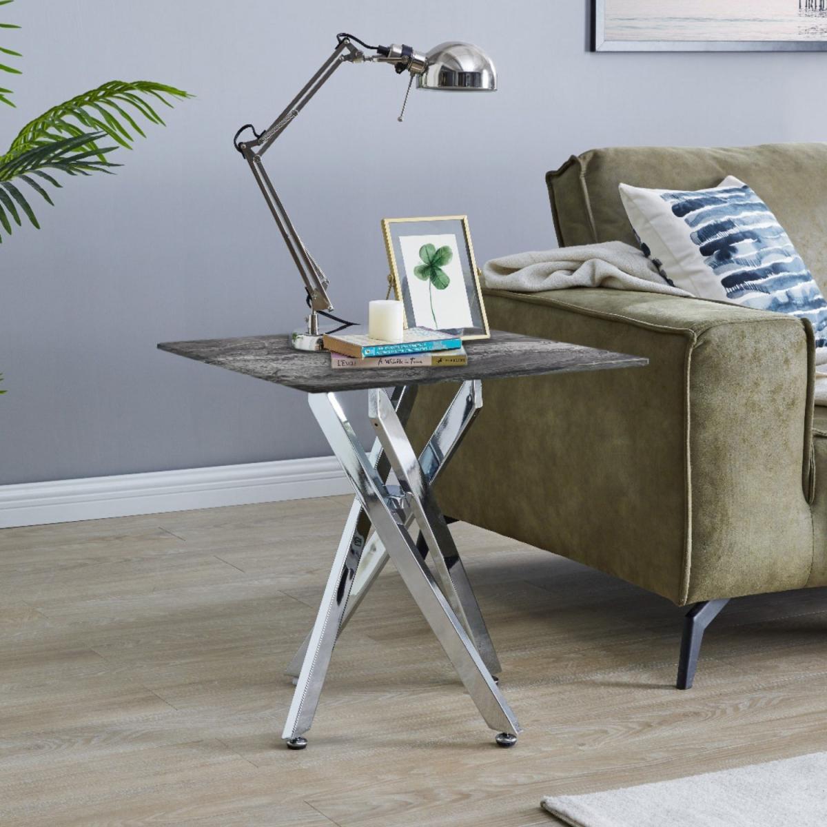 Our Leonardo glass marble effect square side table has shiny chrome silver legs in a stylish nested starburst design. Were excited to bring you this update to our popular Leonardo range! Combining minimalist design with classy modern style, the Leonardo marble end table will transform your living room or make a gorgeous bedside table. The marble-effect glass tabletop has a veining pattern and, when paired with the reflective chrome legs, creates a bright and spacious feel for your home that adds light. This square table top is made from strong tempered glass with a marble effect, and has a flat edge. It's sat on top of sturdy silver chromed legs, so it's not only designed to last but to look great while doing it! Available in a range of colourmaterials, with matching consoles, coffee tables and dining sets, so check out the full Leonardo range for more ideas. Note The marbling effect is a bespoke and unique pattern each time, to reflect the one-of-a-kind patterns of natural marble, so some variations will occur from the pattern shown in the photos.