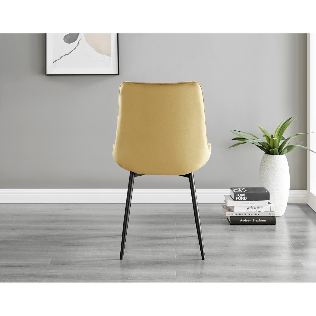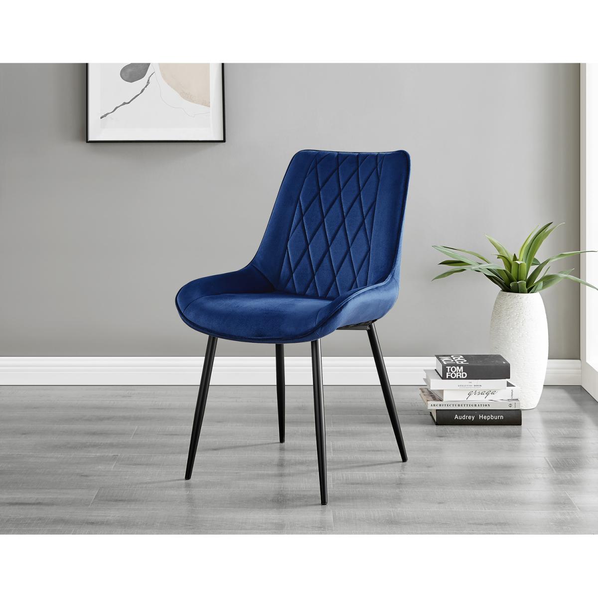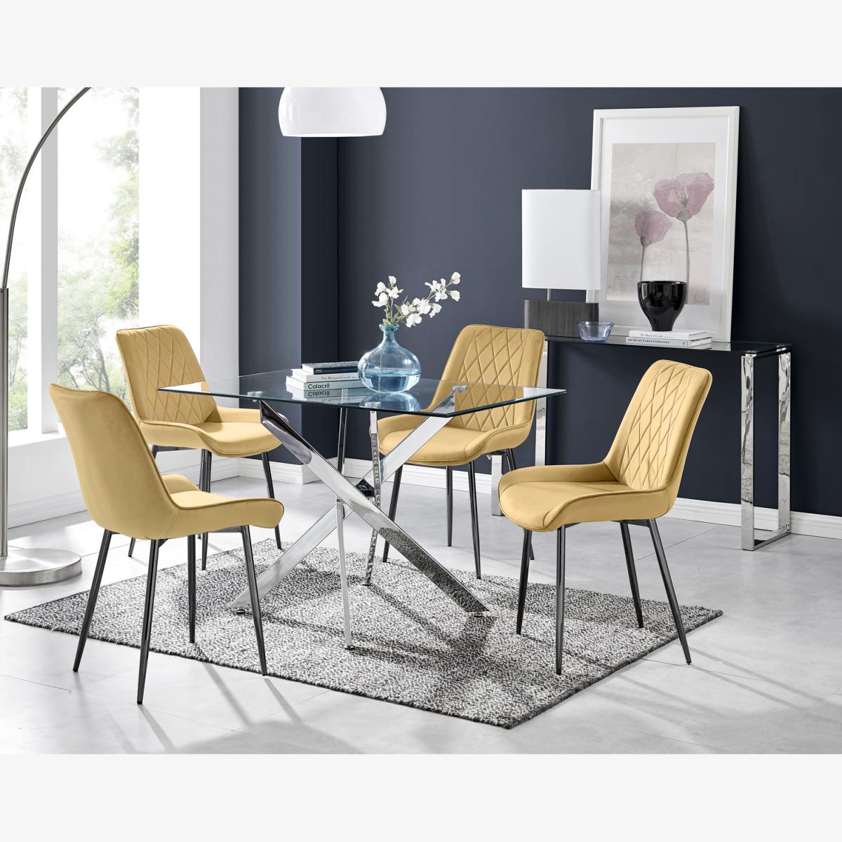 Impressively combining minimalist design with classy modern style, the Leonardo table will transform your dining room. The dining table is made from a combination of chrome metal and clear tempered glass, giving a bright and spacious feel to your dining space and creating a light open look. Featuring a spacious 120x70cm bevelled top surface there is ample space for up to 4 guests, with the hardened glass table top providing superior resistance to damage. Converging in a sleek nest shape the table legs create a unique look whilst also providing great stability for the table. Modernise your dining area with our luxurious velvet upholstered Pesaro Dining Chairs. With a nod to the Mid-century modern design era, the Pesaro features gorgeous textured diamond stitching with an ergonomically designed curved seat pad blending seamlessly with the supporting medium-high backrest. Sat atop elegant slightly tapered legs in black, chrome or gold effect. The Pesaro is a perfect match for any dining table or used as a luxe vanity seat in the bedroom, as an occasional chair for the living area or to add a bit of luxury to your home office.
