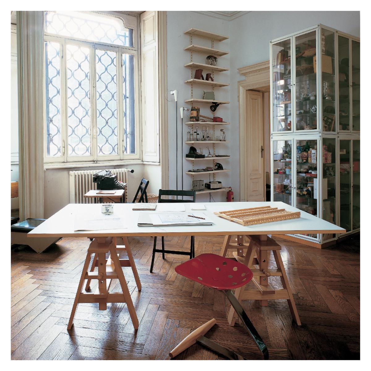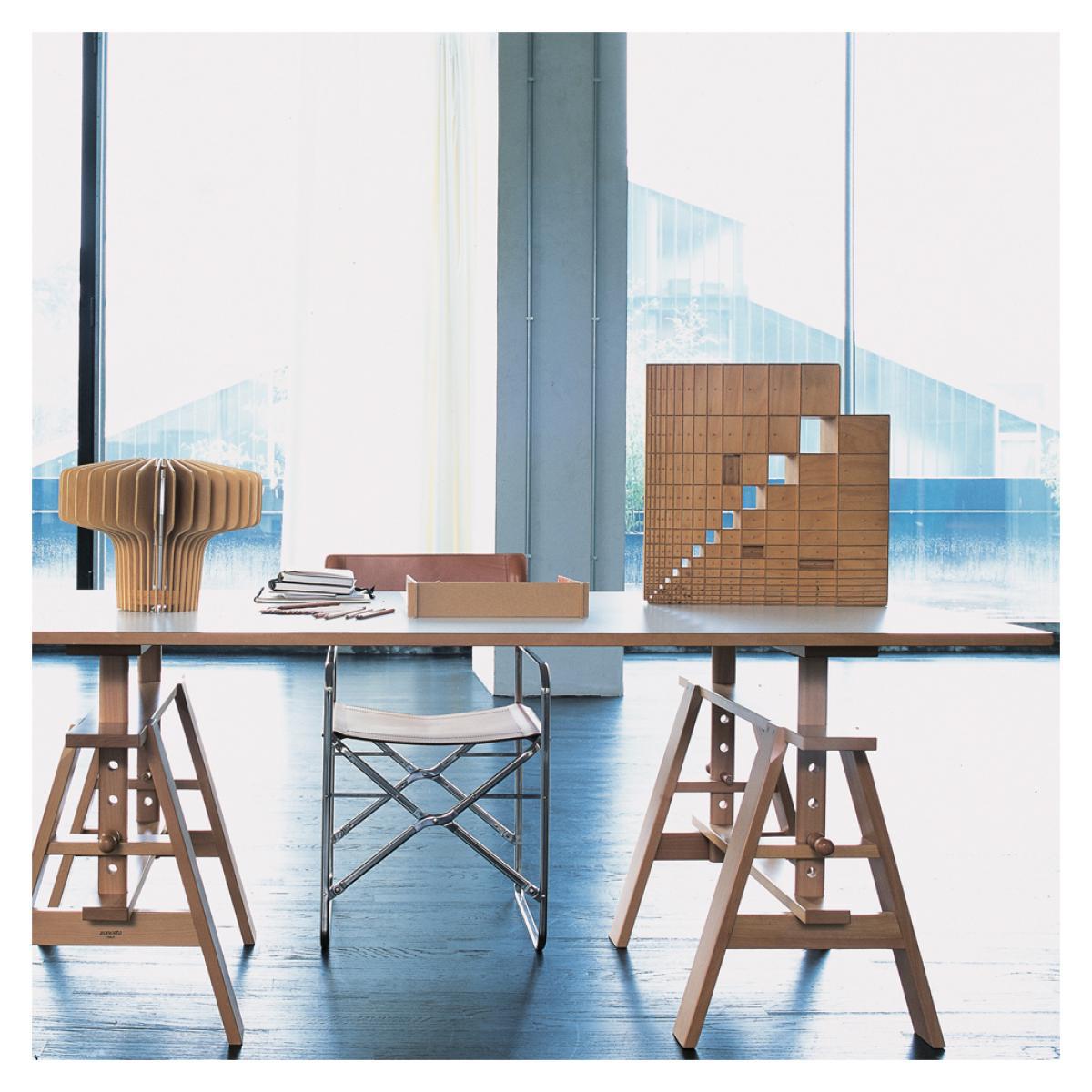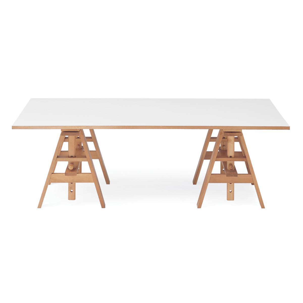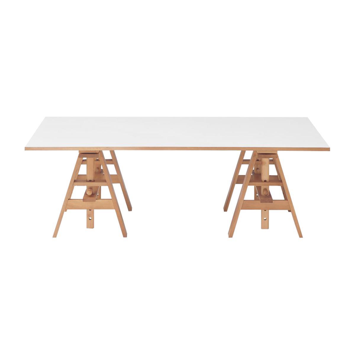 Designed in 1969 by Achille Castiglioni, the Leonardo Writing Desk showcases a simple yet robust white laminate top, supported by two sets of beech wood trestles. Inspired by the style of trestle-top work tables that painters, artisans and designers have used for centuries, the Leonardo Writing Desk is elevated on a natural varnished, steam-treated beech wood base with adjustable height, all finished with a white plastic laminate surface that ensures easy upkeep. Manufactured by Italian leaders in industrial design, Zanotta, the Leonardo Writing Desk is showcased at museums the world over, including the Victoria & Albert Museum in London.