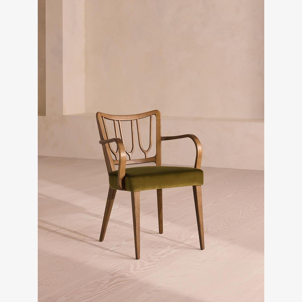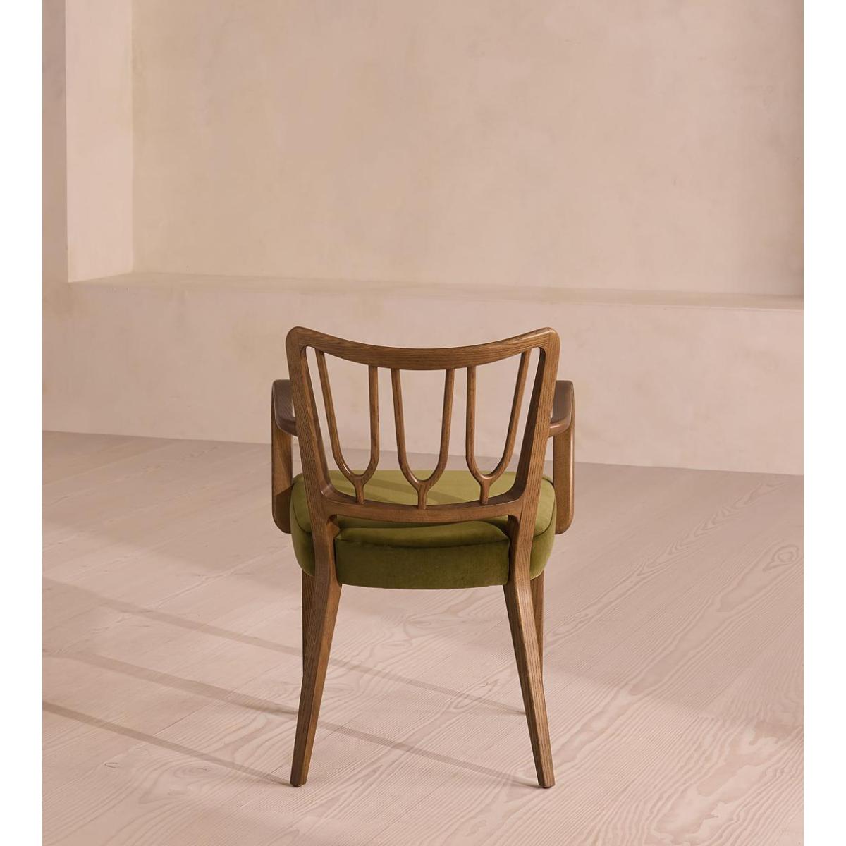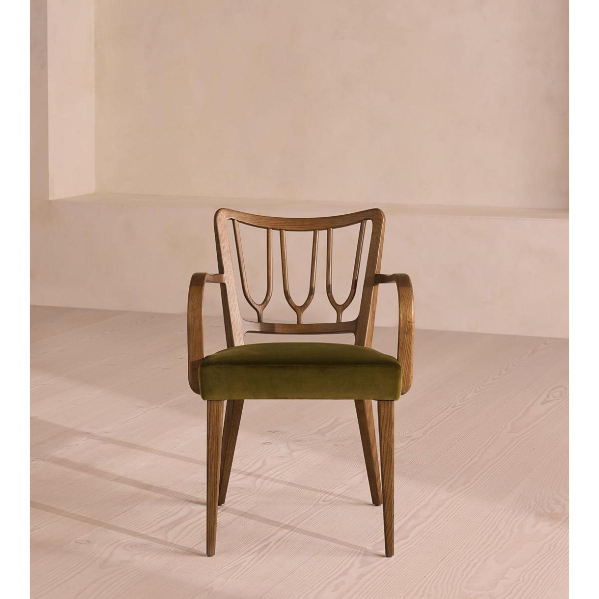A decorative backrest constructed from oak is finished with rich velvet upholstery. Made from mid-toned oak with a high sheen, the frame of our Leonie dining chair combines classic, tapered legs with a decorative backrest. Trimmed with curved armrests, its comfortable, padded seat is fully upholstered in rich olive velvet. There is also a co-ordinating, armless version available.