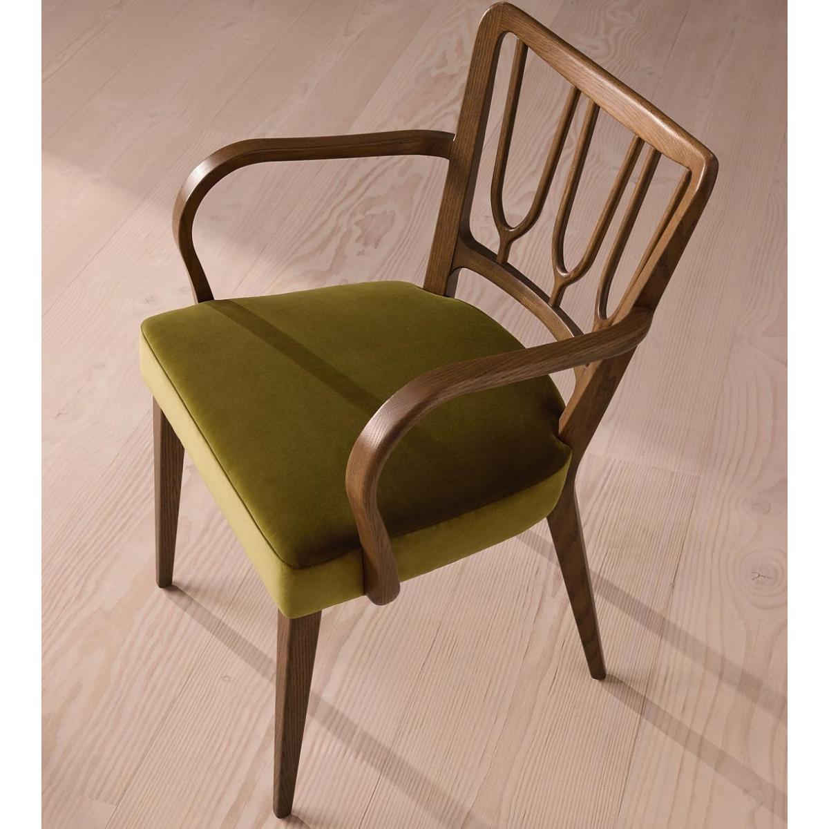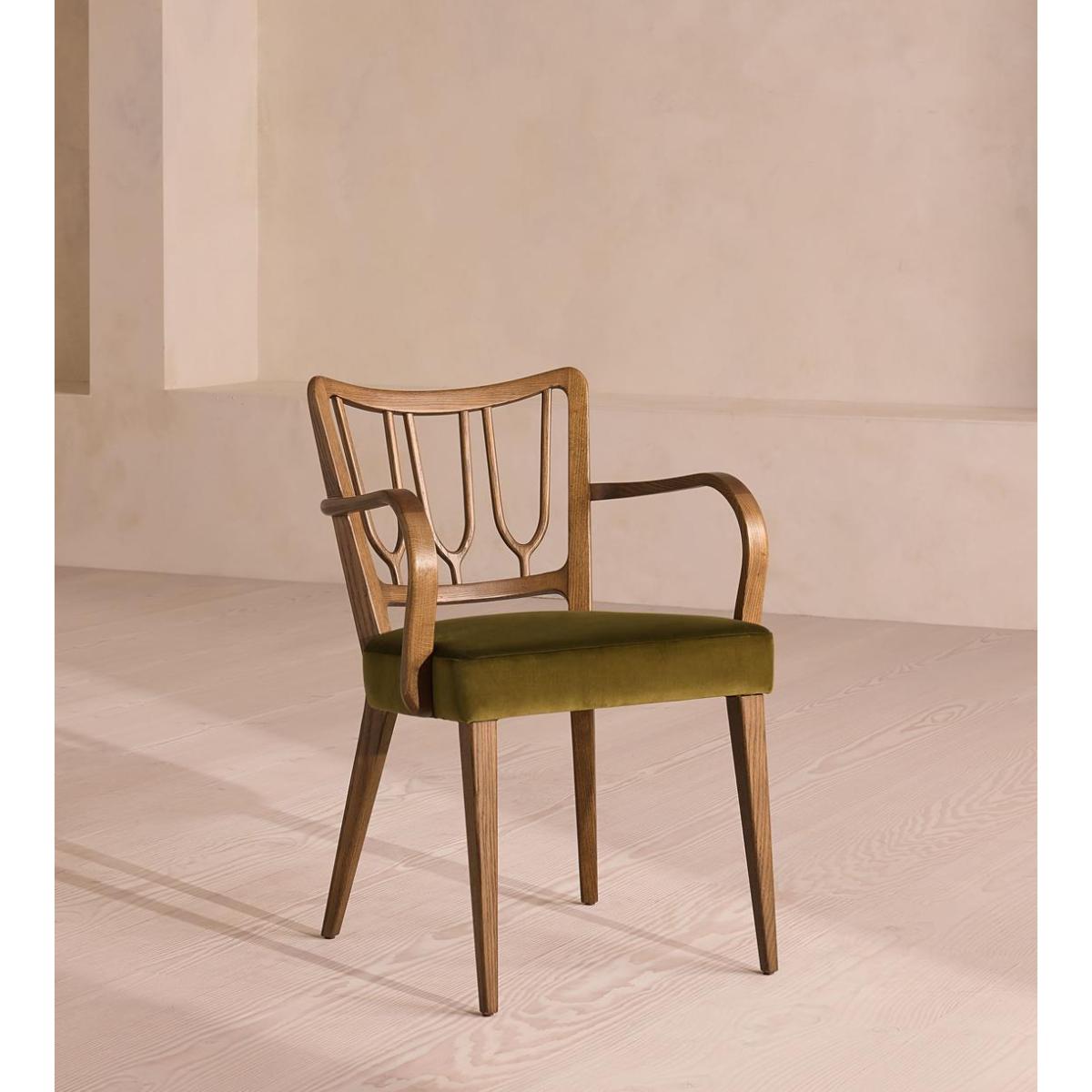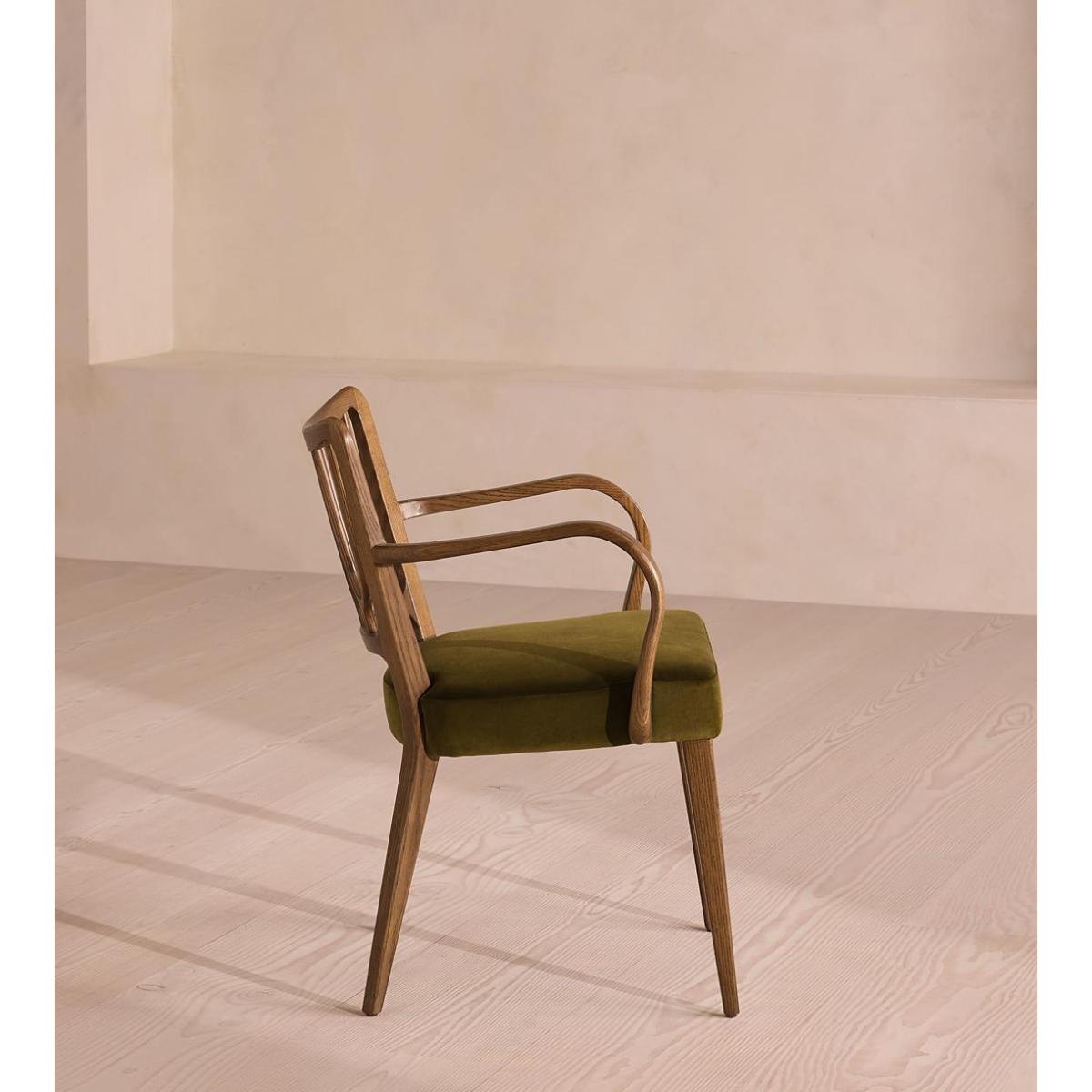A decorative backrest constructed from oak is finished with rich velvet upholstery. Made from mid-toned oak with a high sheen, the frame of our Leonie dining chair combines classic, tapered legs with a decorative backrest. Trimmed with curved armrests, its comfortable, padded seat is fully upholstered in rich olive velvet. There is also a co-ordinating, armless version available.