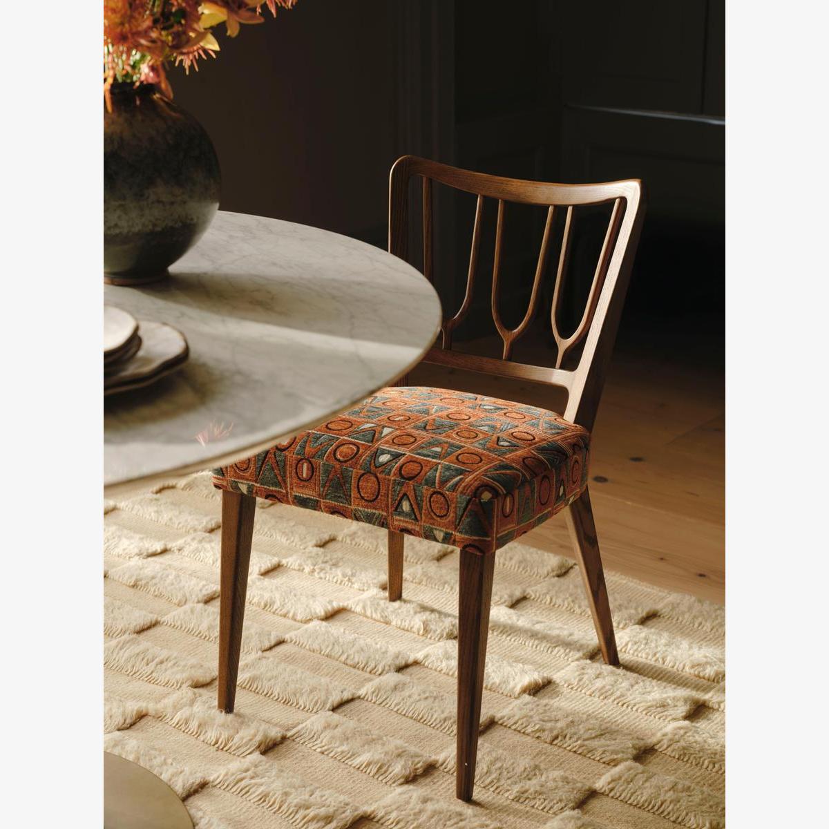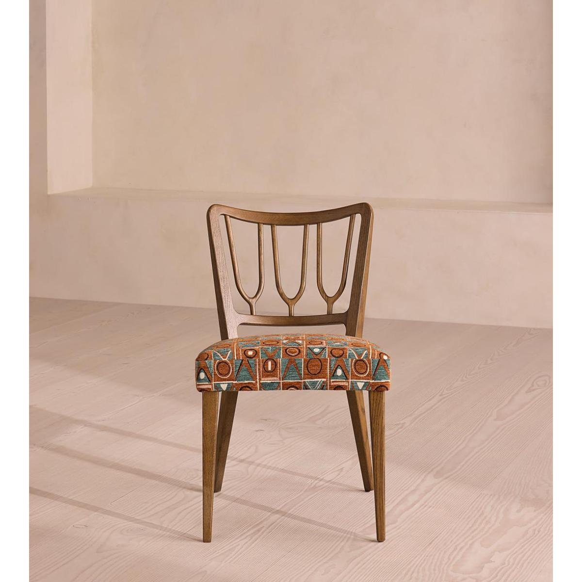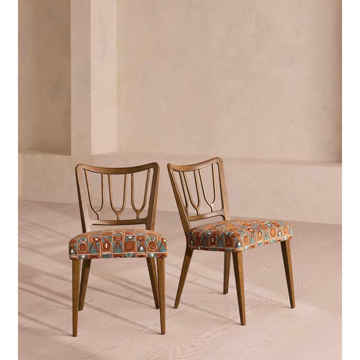 Decorative backrests constructed from oak are finished with colourful jacquard upholstery on this set of two. Made from mid-toned oak with a high sheen, the frames of our Leonie dining chairs combine classic, tapered legs with a decorative backrest. Their comfortable, padded seats are fully upholstered in our colourful Lumi jacquard fabric. There is also a co-ordinating, armless version available.