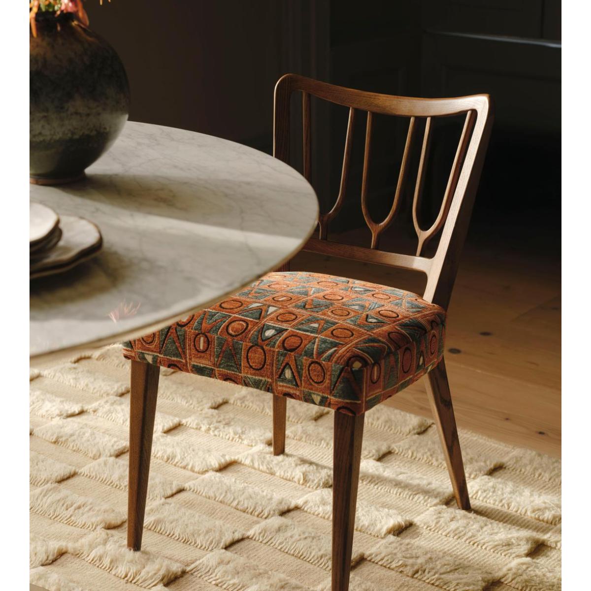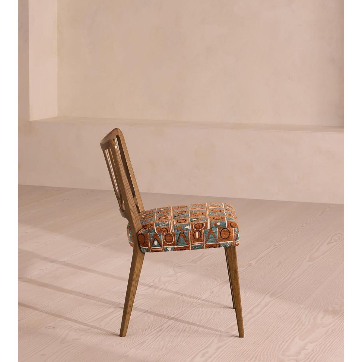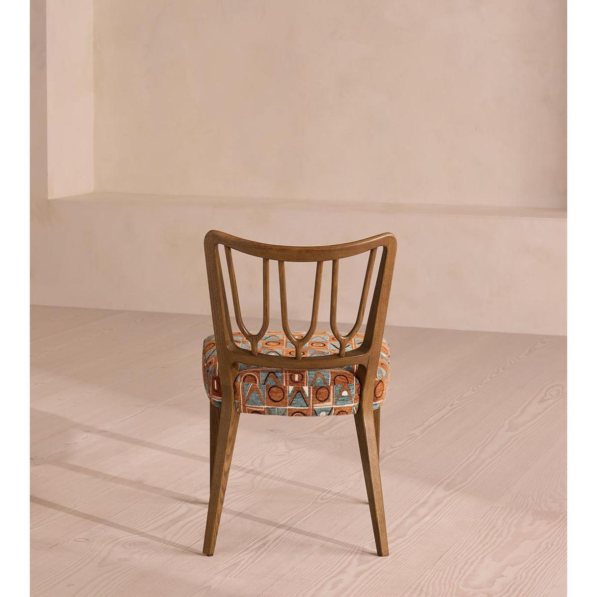 Decorative backrests constructed from oak are finished with colourful jacquard upholstery on this set of two. Made from mid-toned oak with a high sheen, the frames of our Leonie dining chairs combine classic, tapered legs with a decorative backrest. Their comfortable, padded seats are fully upholstered in our colourful Lumi jacquard fabric. There is also a co-ordinating, armless version available.