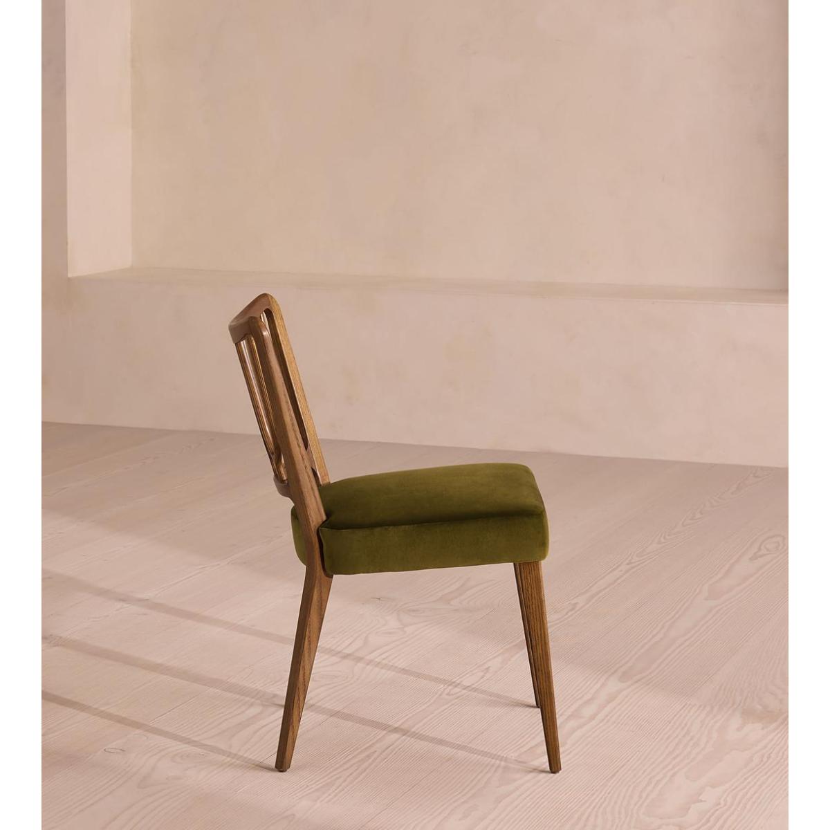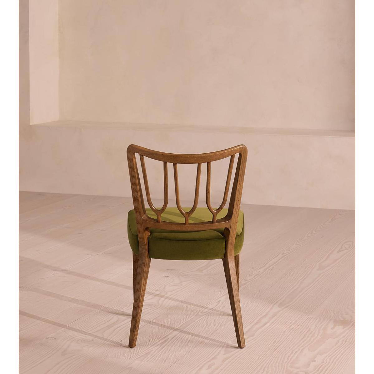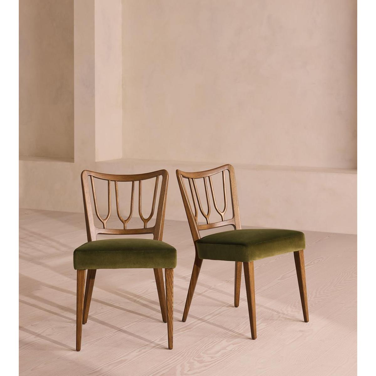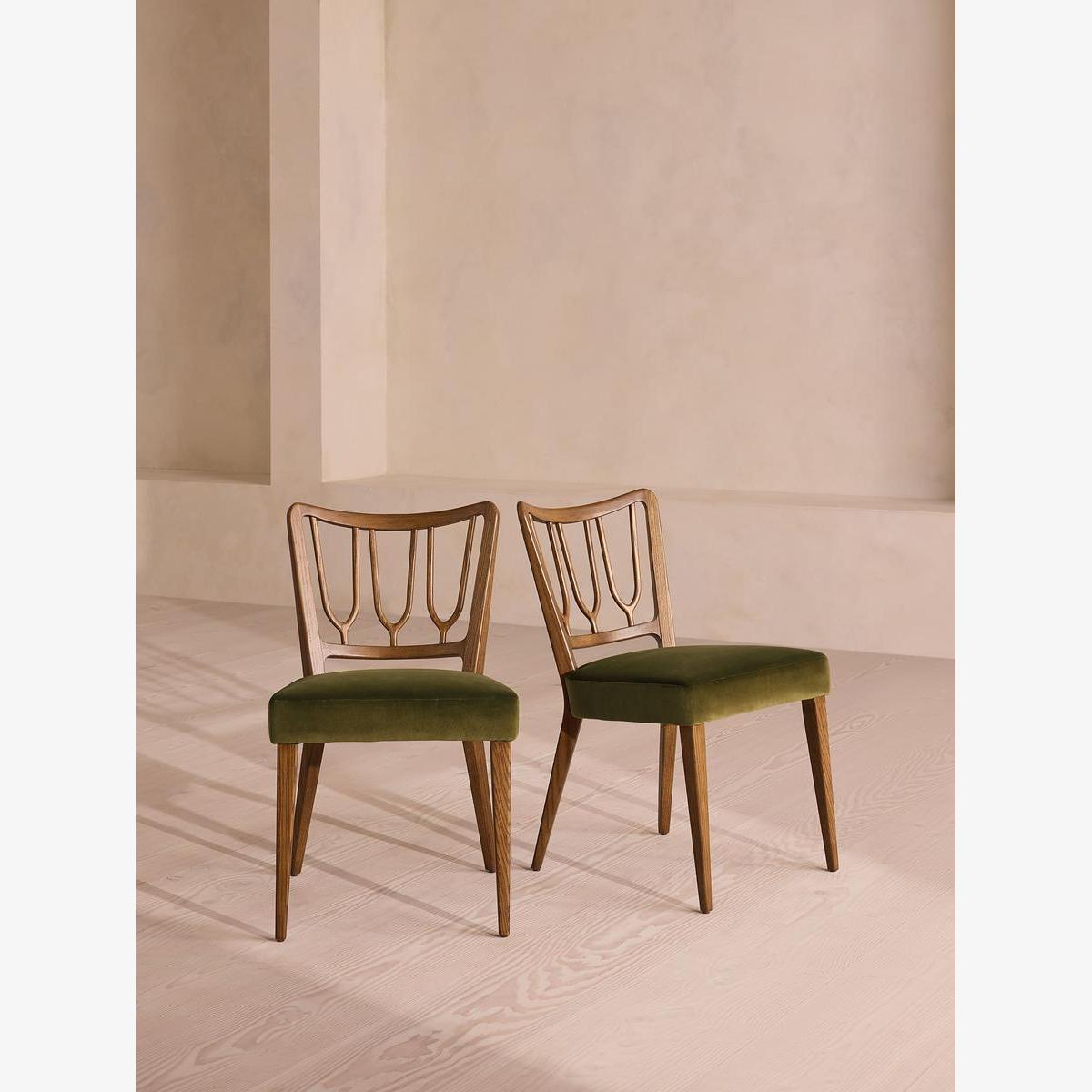Decorative backrests constructed from oak are finished with rich velvet upholstery on this set of two. Made from mid-toned oak with a high sheen, the frames of our Leonie dining chairs combine classic, tapered legs with a decorative backrest. Their comfortable, padded seats are fully upholstered in rich olive velvet. There is also a co-ordinating, armless version available.