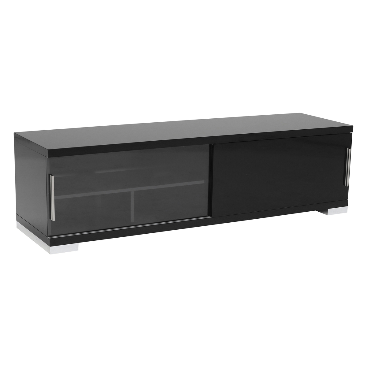 This uber cool black TV unit offers plenty of style with a gloss finish and 2 sliding doors, 1 in glass with shelves behind