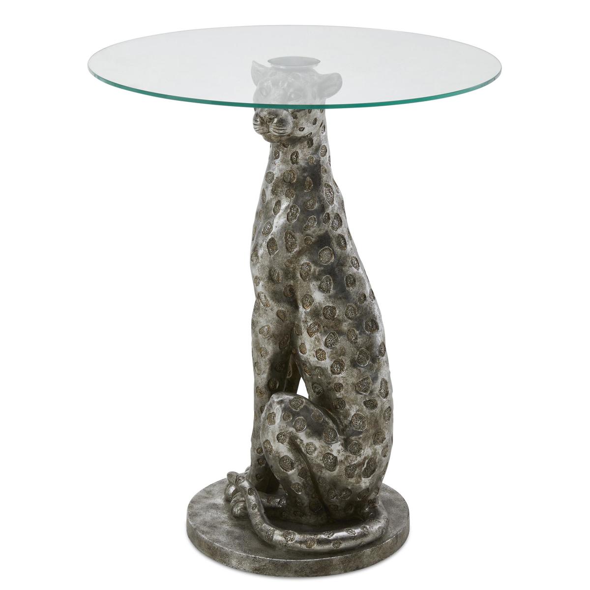 Dunelm Exclusive - Designed and Developed by Dunelm. Add a touch of elegance and style to your room with this beautifully designed leopard side table, a perfect statement piece for your home. Featuring a tempered glass top, this side table has a stunning antique silver finish and a free-standing structure, to give that final touch of glamour and luxury to your room.