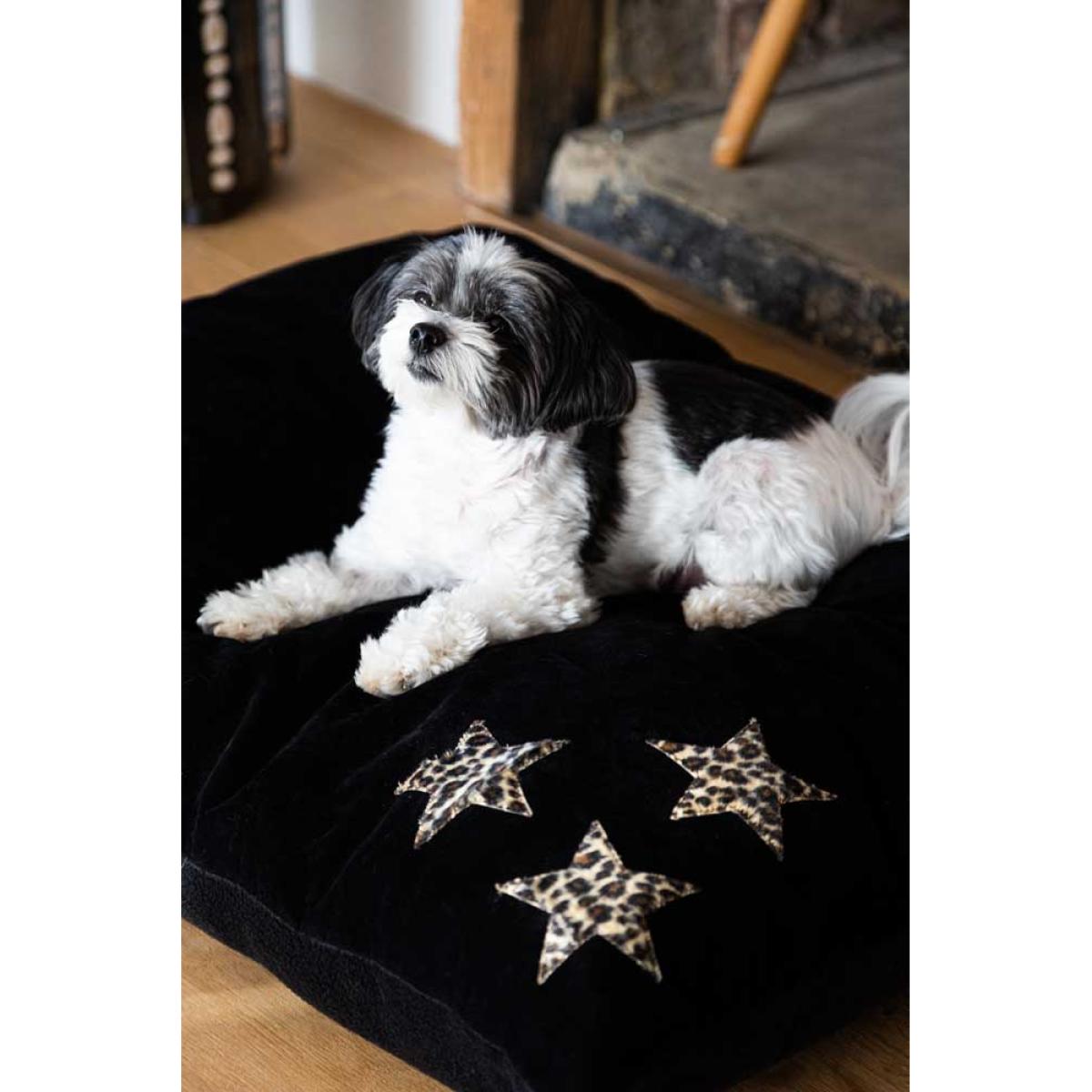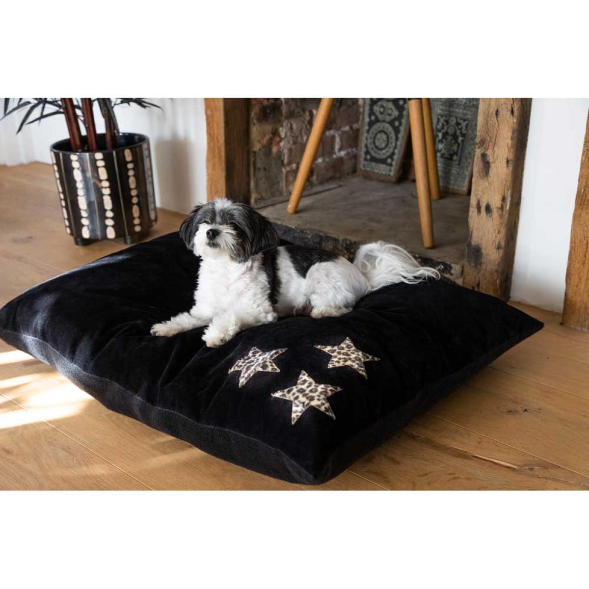 About The Leopard Stars Dog Bed - 3 Available Sizes A luxe dog bed that we wish was created for humans too, the Leopard Stars Dog Bed is the best dog bed ever! Made with fully removable and machine washable materials, the top of the bed features a black faux suede fabric with faux fur leopard stars, while the reverse is made from cosy black fleece. Designed exclusively for Rockett St George by Creature Clothes Ltd, this luxury dog bed embraces our obsession with all things leopard print. Take a look at our size guide below to find the perfect size for your pampered pooch. Small dog bed: 56 x 61cm – great for Yorkies, Chihuahuas and small breeds. Medium dog bed: 66 x 86cm - perfect for medium-sized breeds from Jack Russells to Springer Spaniels. Large dog bed: 86 x 106cm – designed for Labradors and retriever breeds. Why We Think You Will Love The Luxury Dog Bed In Faux Suede & Fleece Co-founders Jane & Lucy have been busy searching and designing fabulous pieces for the Rockett St George pet collection that treat your pet to everything they deserve. Inspired by the love of their own pets, Jane & Lucy wanted to bring signature RSG style to pet accessories and ensure that you don’t have to compromise on your unique sense of style when it comes to finding great designs for your dog. From the faux leopard print stars appliqued in the corner to bold black colour palette, this is a luxury dog bed that will look amazing against any décor style imaginable. Soft and cosy, this wonderful washable dog bed is designed with two separate duvets inside to create the perfect perch for your pooch to rest, relax and snooze in style. The Leopard Stars Dog Bed is pictured in size medium and has been tried and tested by Angel the Maltipoo!