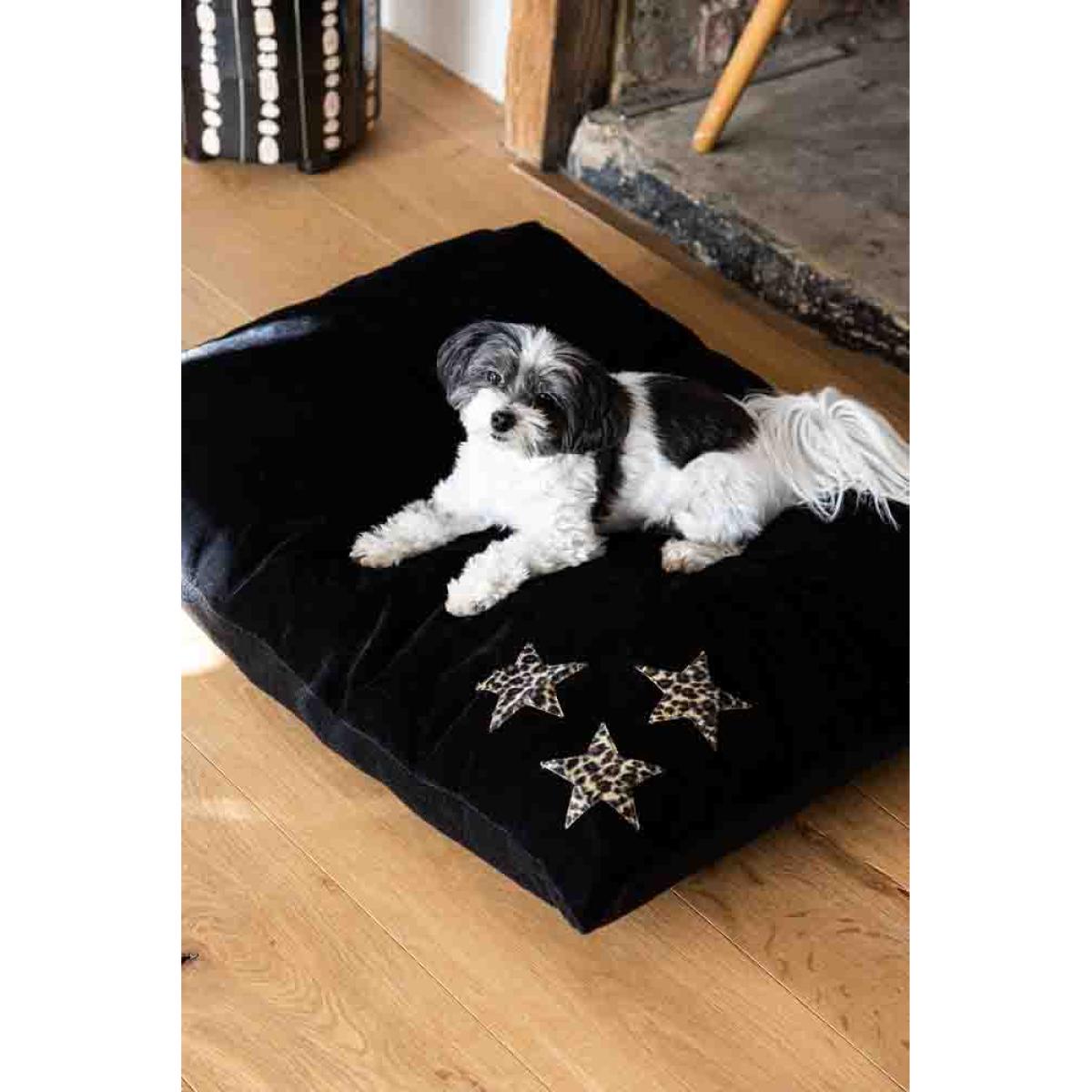 About The Leopard Stars Dog Bed - 3 Available Sizes A luxe dog bed that we wish was created for humans too, the Leopard Stars Dog Bed is the best dog bed ever! Made with fully removable and machine washable materials, the top of the bed features a black faux suede fabric with faux fur leopard stars, while the reverse is made from cosy black fleece. Designed exclusively for Rockett St George by Creature Clothes Ltd, this luxury dog bed embraces our obsession with all things leopard print. Take a look at our size guide below to find the perfect size for your pampered pooch. Small dog bed: 56 x 61cm – great for Yorkies, Chihuahuas and small breeds. Medium dog bed: 66 x 86cm - perfect for medium-sized breeds from Jack Russells to Springer Spaniels. Large dog bed: 86 x 106cm – designed for Labradors and retriever breeds. Why We Think You Will Love The Luxury Dog Bed In Faux Suede & Fleece Co-founders Jane & Lucy have been busy searching and designing fabulous pieces for the Rockett St George pet collection that treat your pet to everything they deserve. Inspired by the love of their own pets, Jane & Lucy wanted to bring signature RSG style to pet accessories and ensure that you don’t have to compromise on your unique sense of style when it comes to finding great designs for your dog. From the faux leopard print stars appliqued in the corner to bold black colour palette, this is a luxury dog bed that will look amazing against any décor style imaginable. Soft and cosy, this wonderful washable dog bed is designed with two separate duvets inside to create the perfect perch for your pooch to rest, relax and snooze in style. The Leopard Stars Dog Bed is pictured in size medium and has been tried and tested by Angel the Maltipoo!